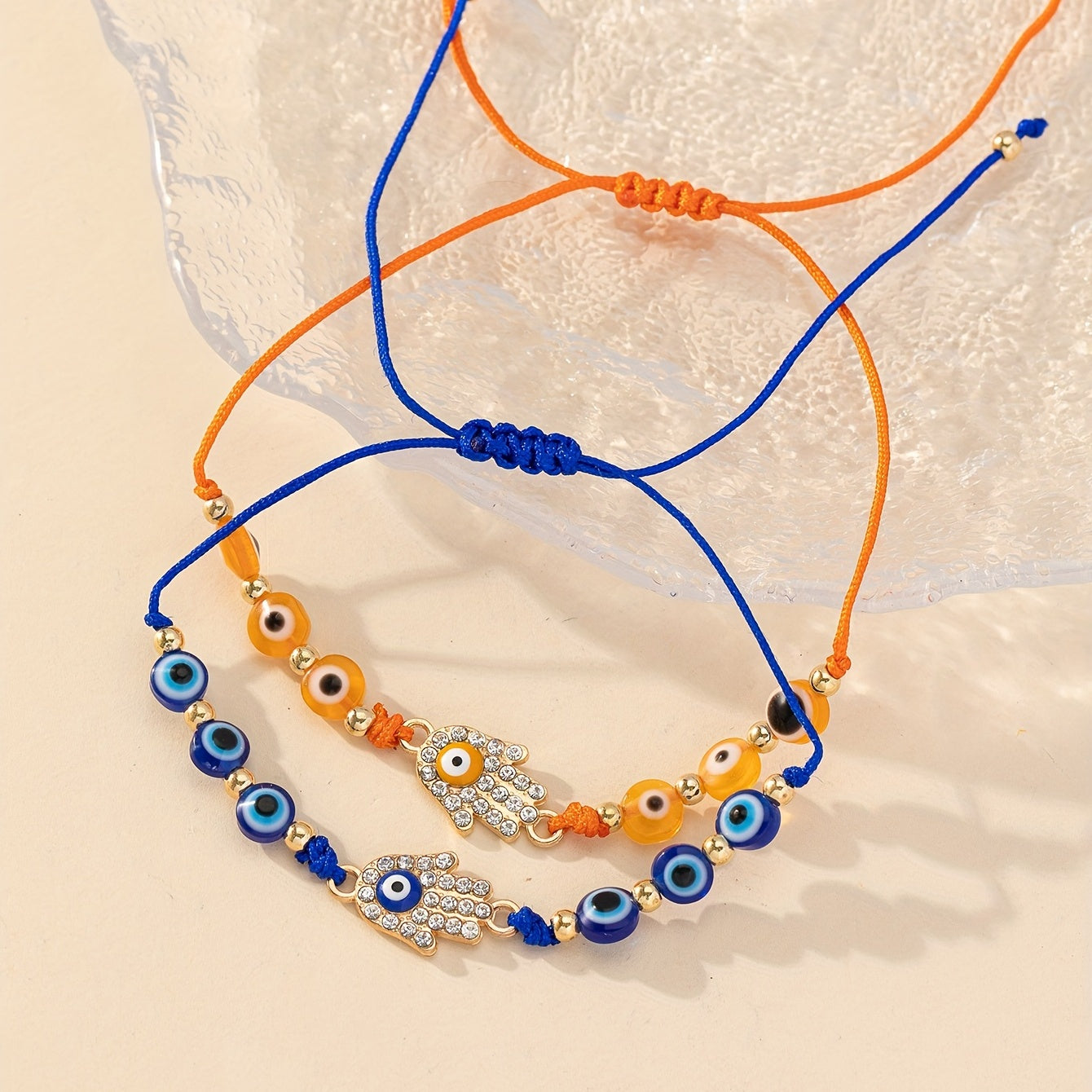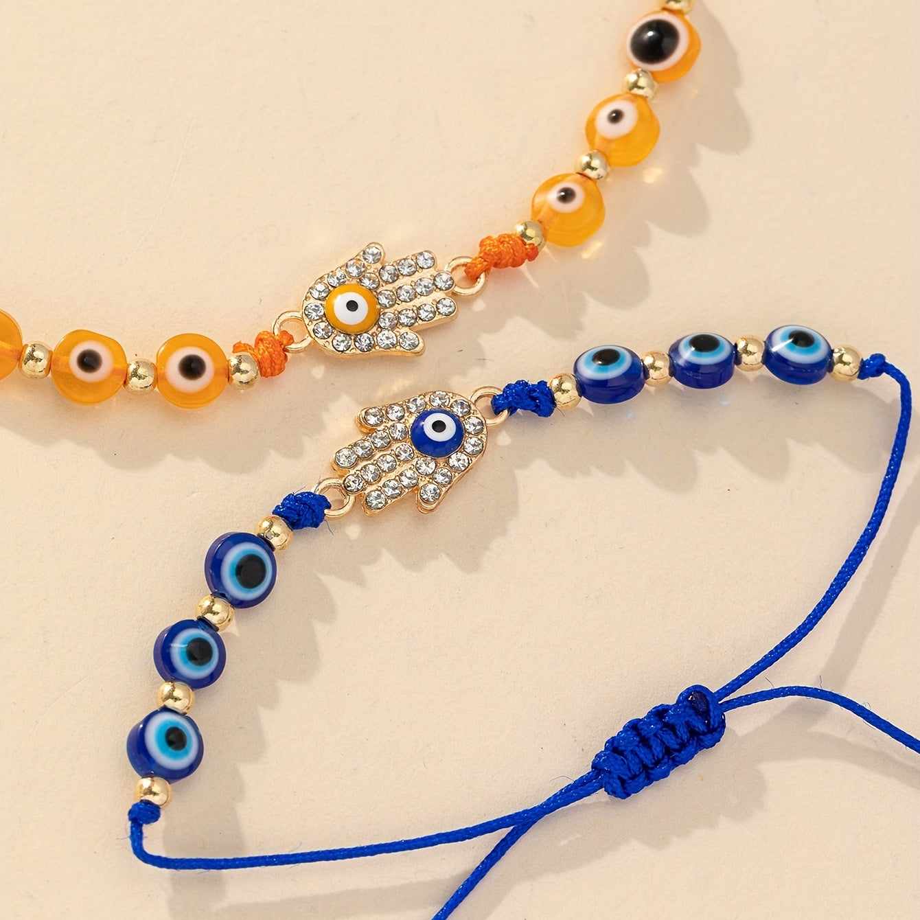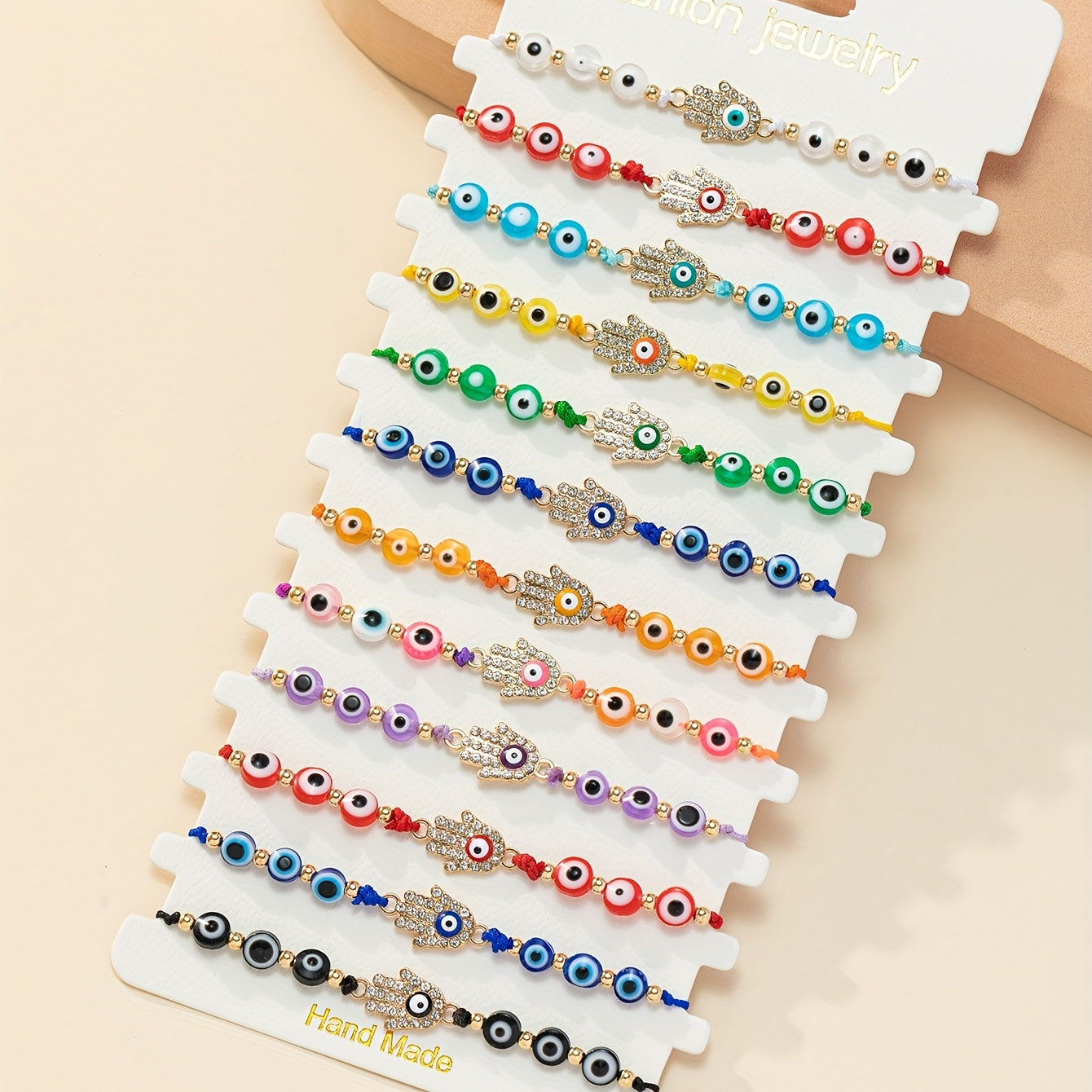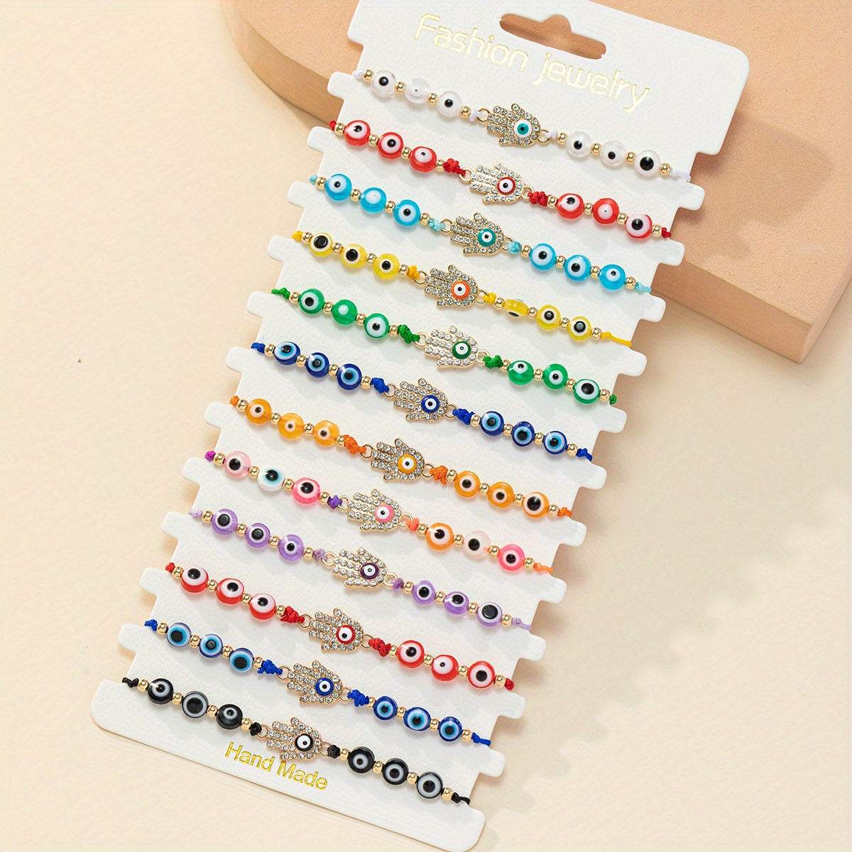 This set includes 12 handwoven beaded bracelets with Devil's Eye and Palm rhinestone design. These bracelets are a symbol of luck and make a perfect gift for women.