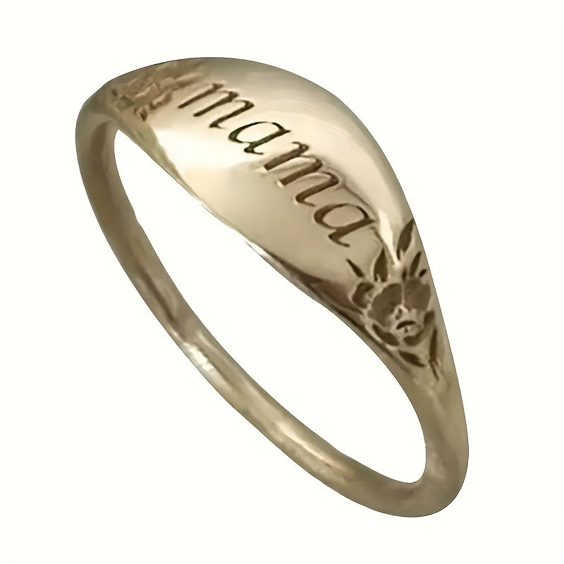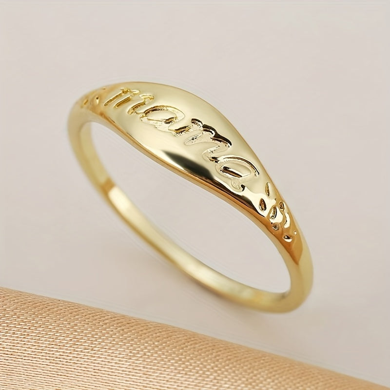 This beautiful ring plated with 14k gold is the perfect gift for your mother. It features carved letters and can be worn daily or as a party accessory.