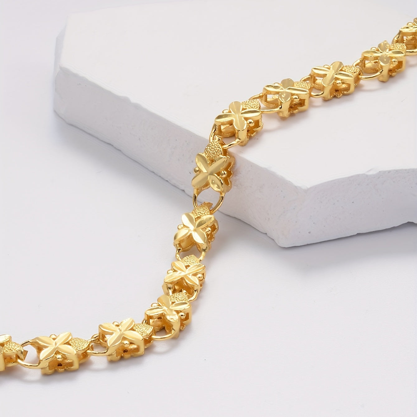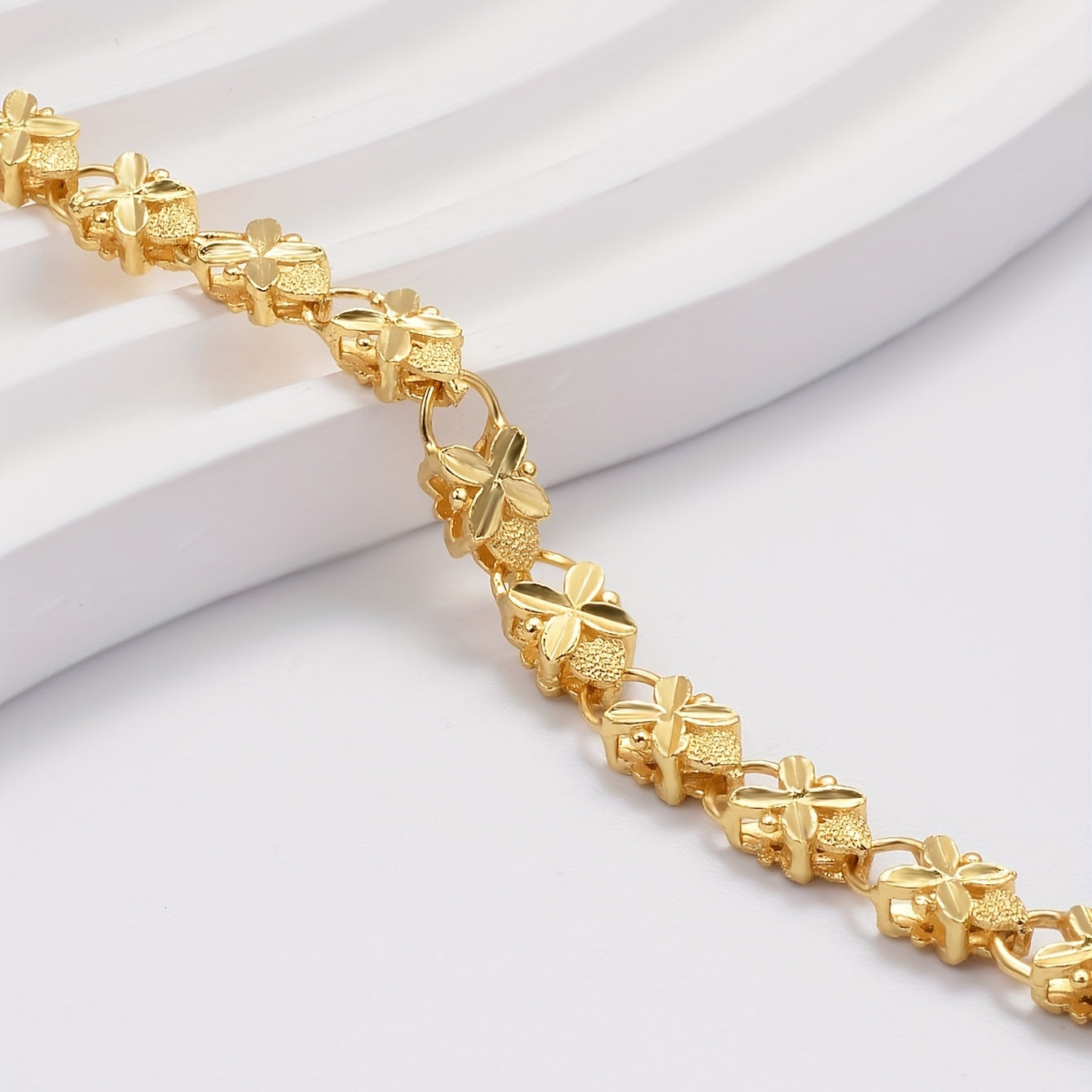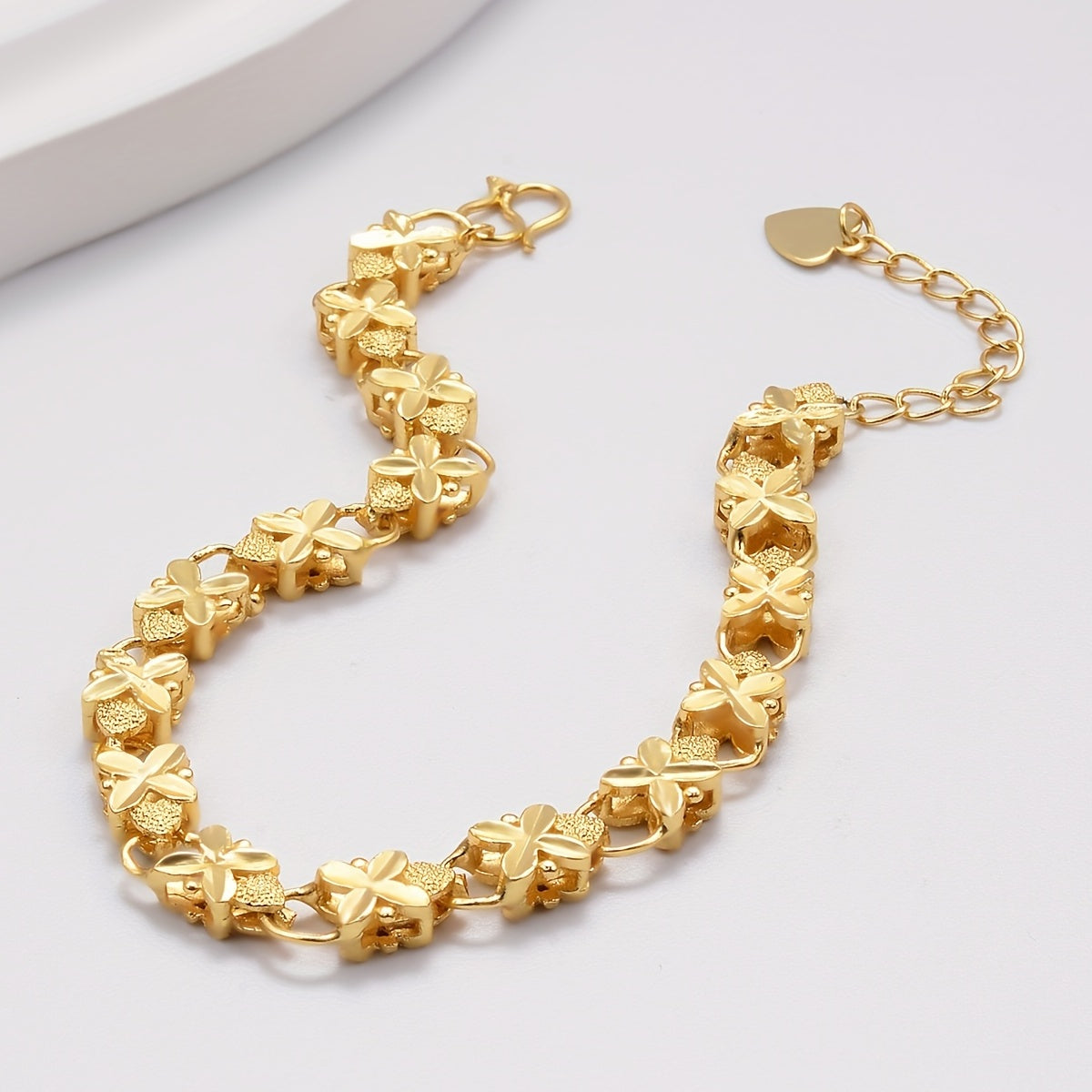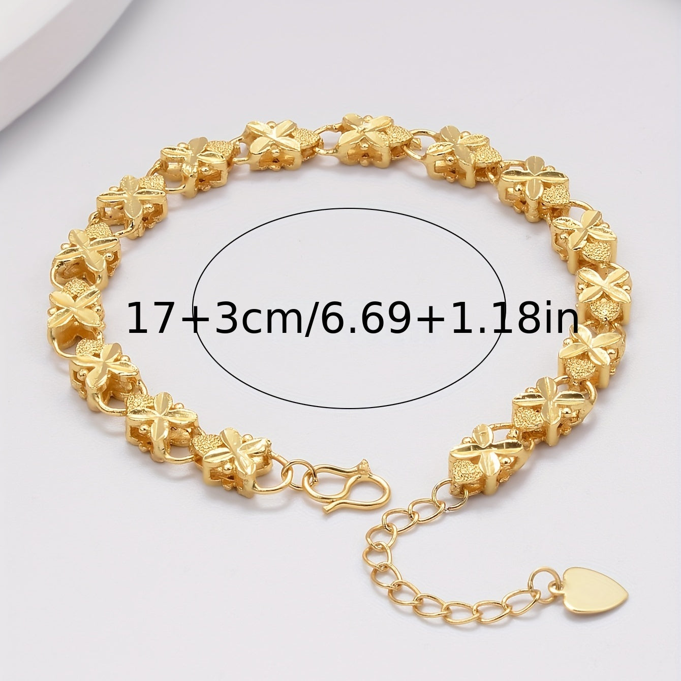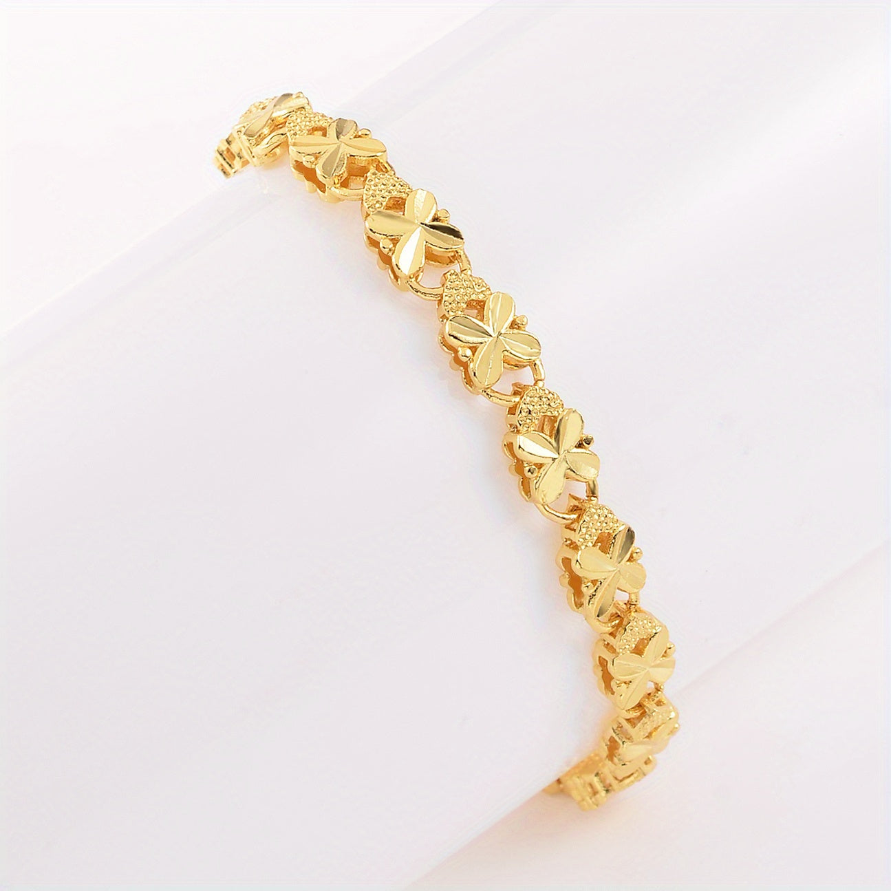 This fashionable bracelet features a delightful design with clover, heart, and flower decorations. It is plated with 18K gold, making it a perfect accessory for any occasion. Ideal gift for birthdays or special occasions.