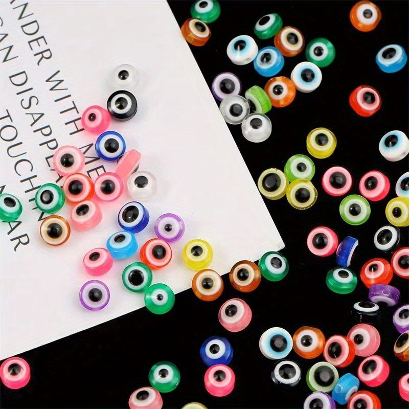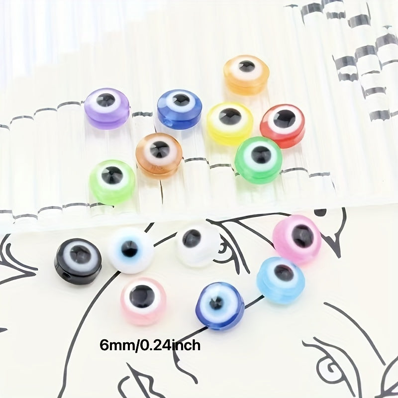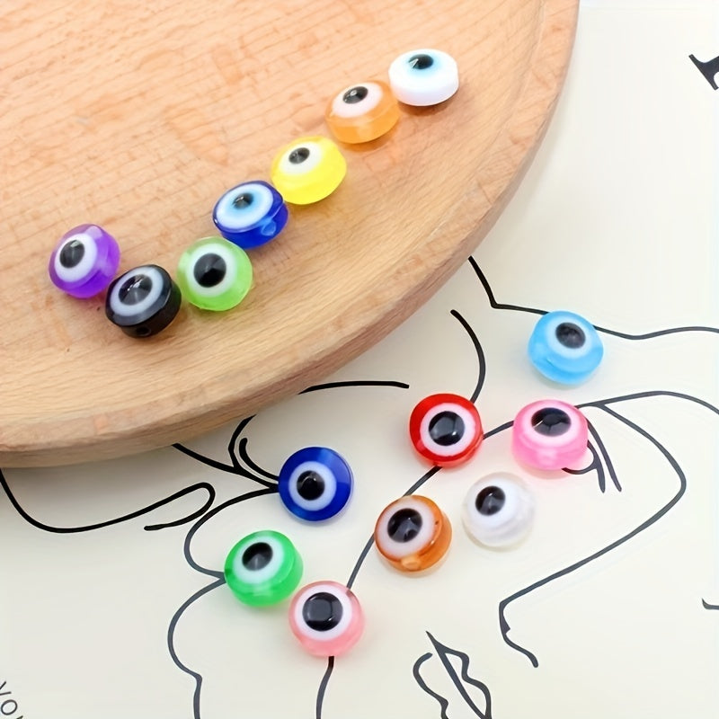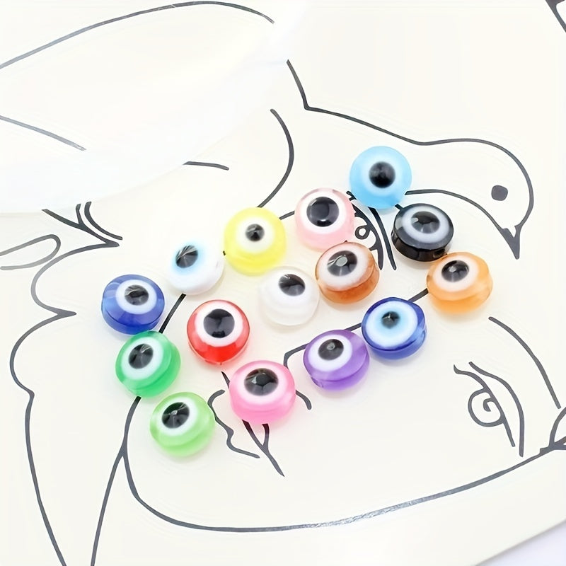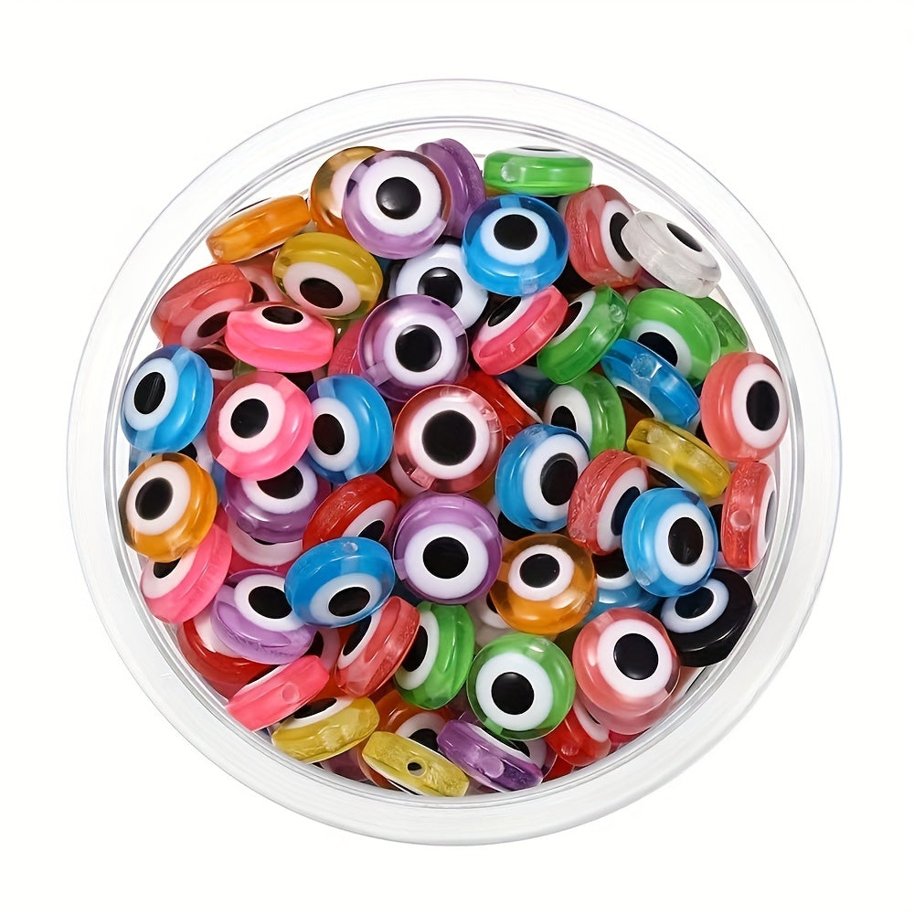 This pack contains 20 flat round acrylic beads with evil eye design, ideal for crafting bracelets, necklaces, and pendants.