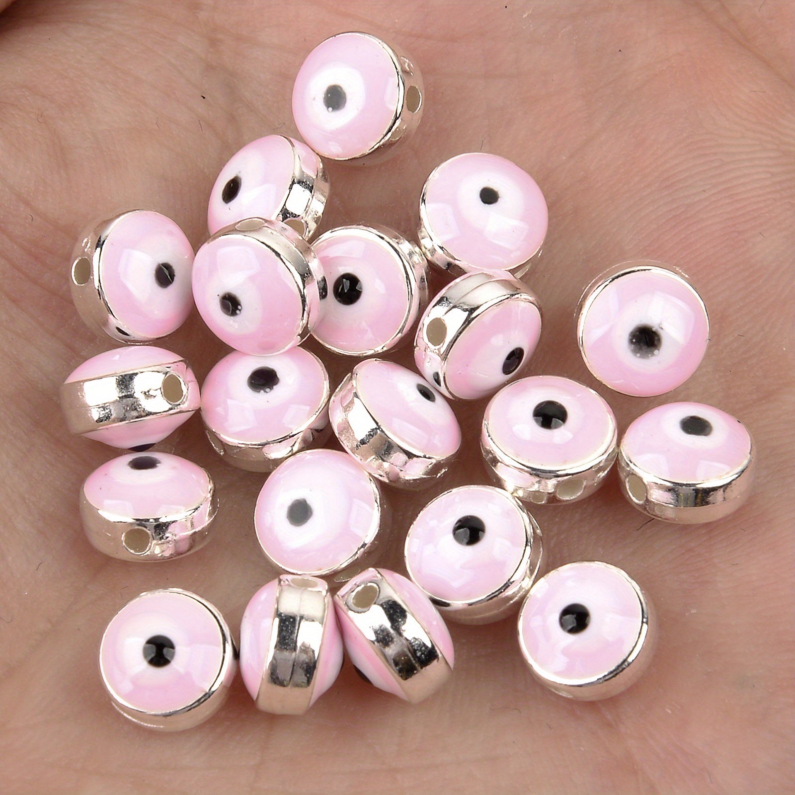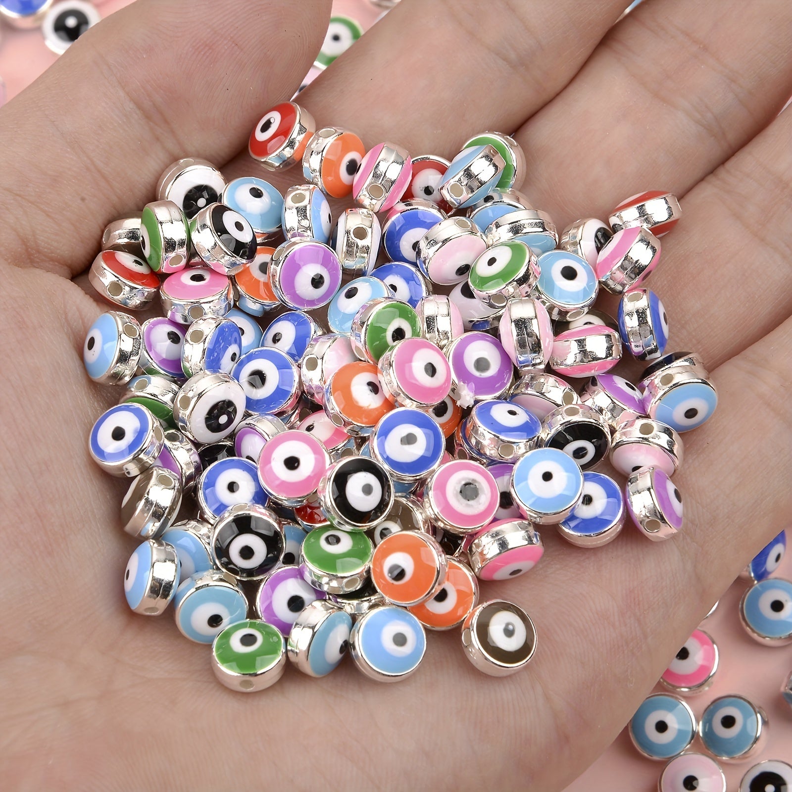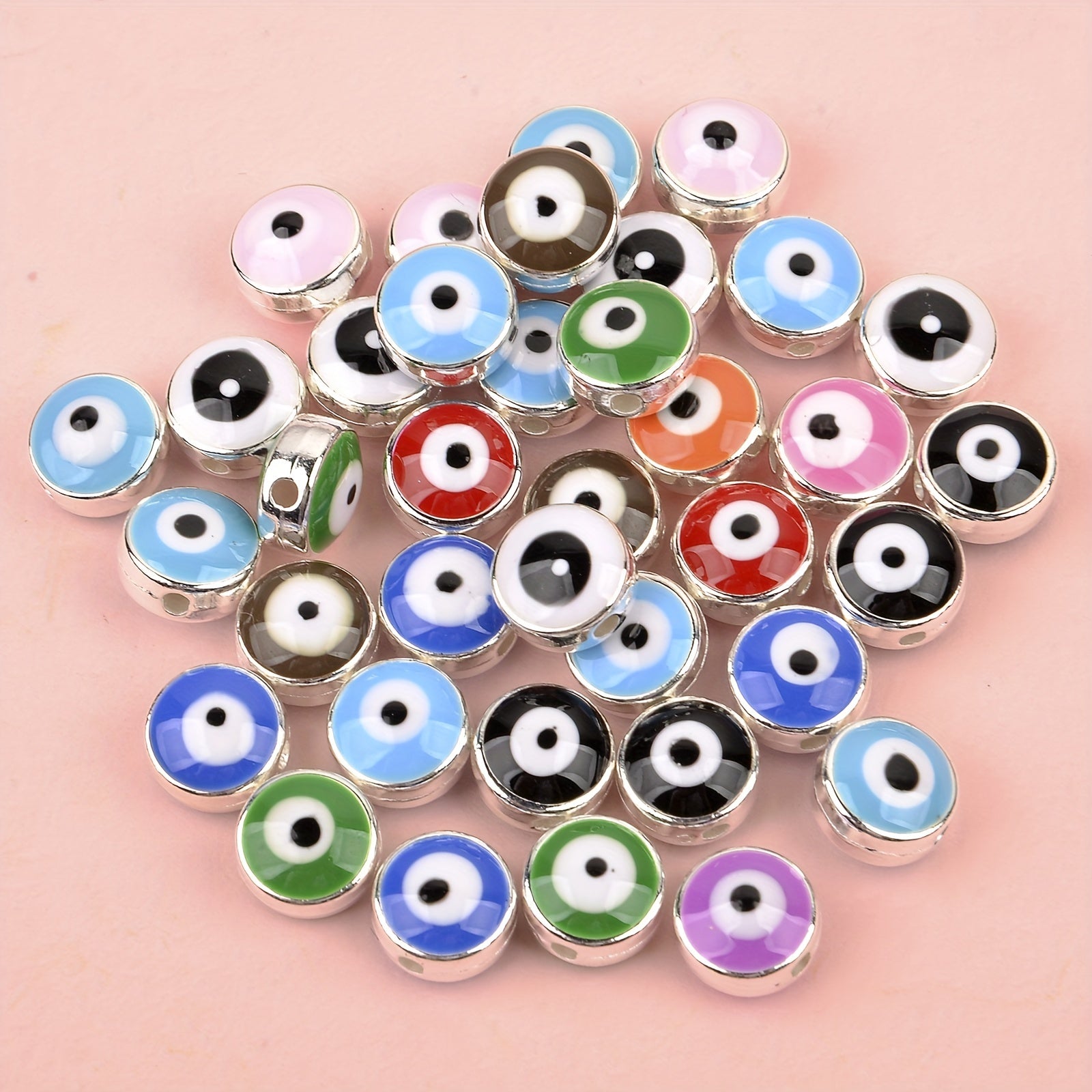 Enhance your jewelry making projects with these 8mm evil eye resin beads featuring a silvery trim. Perfect for creating unique and eye-catching accessories.