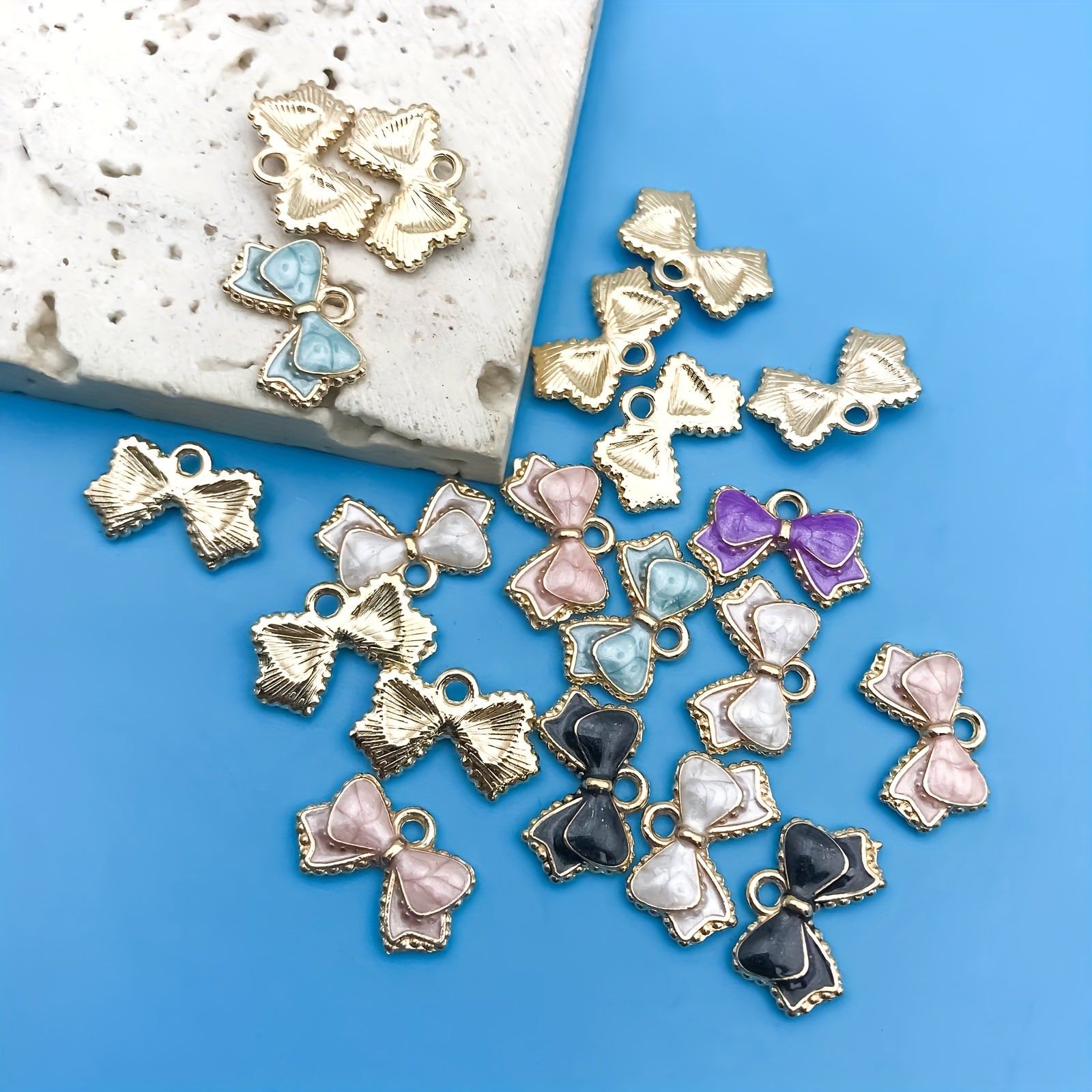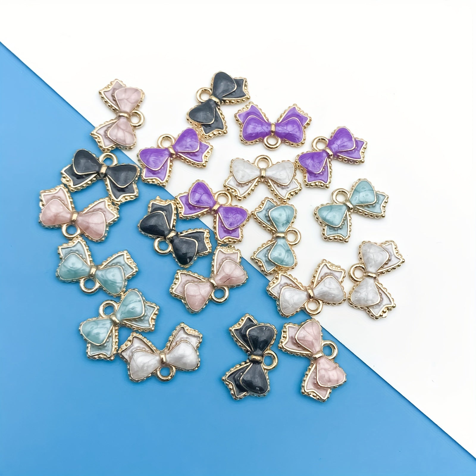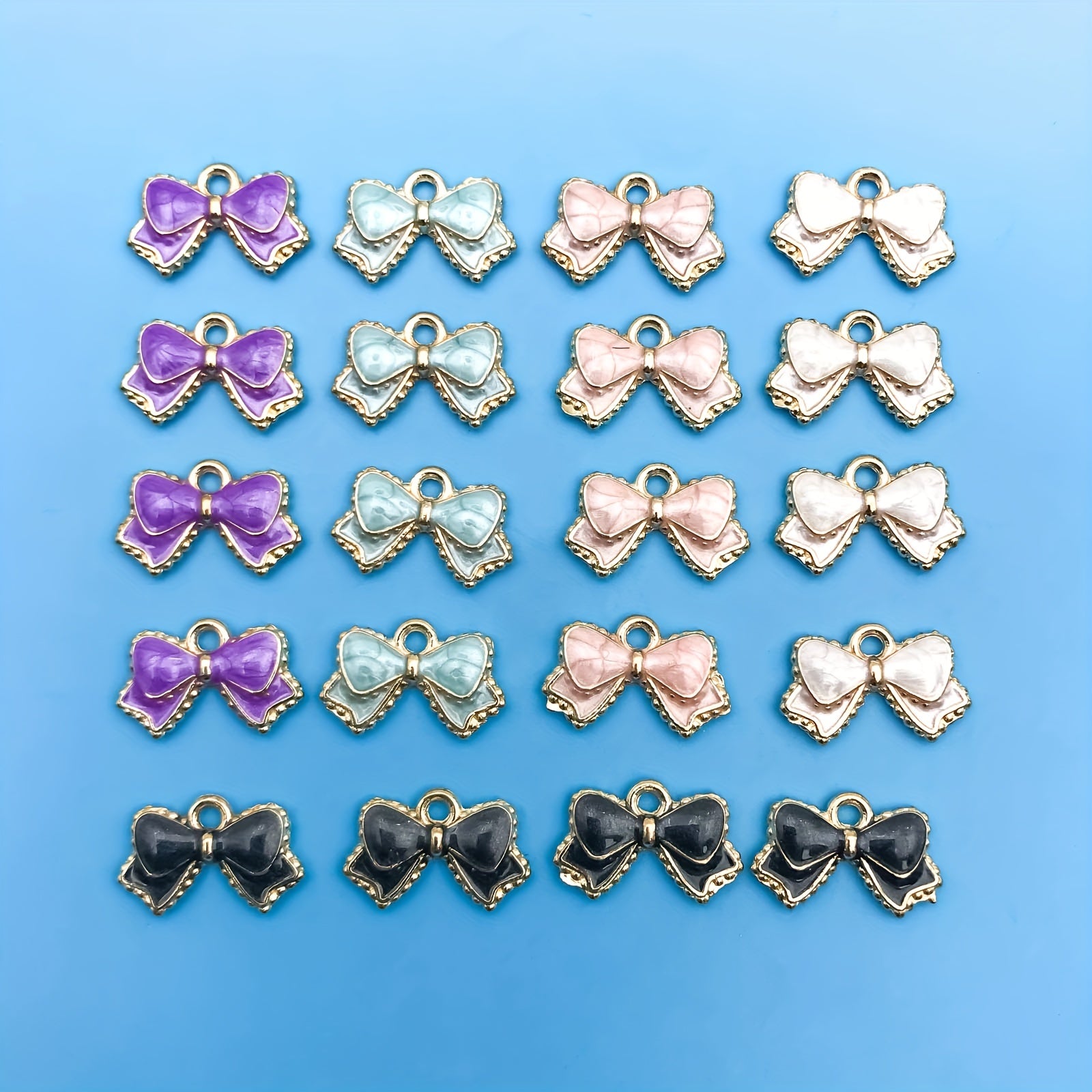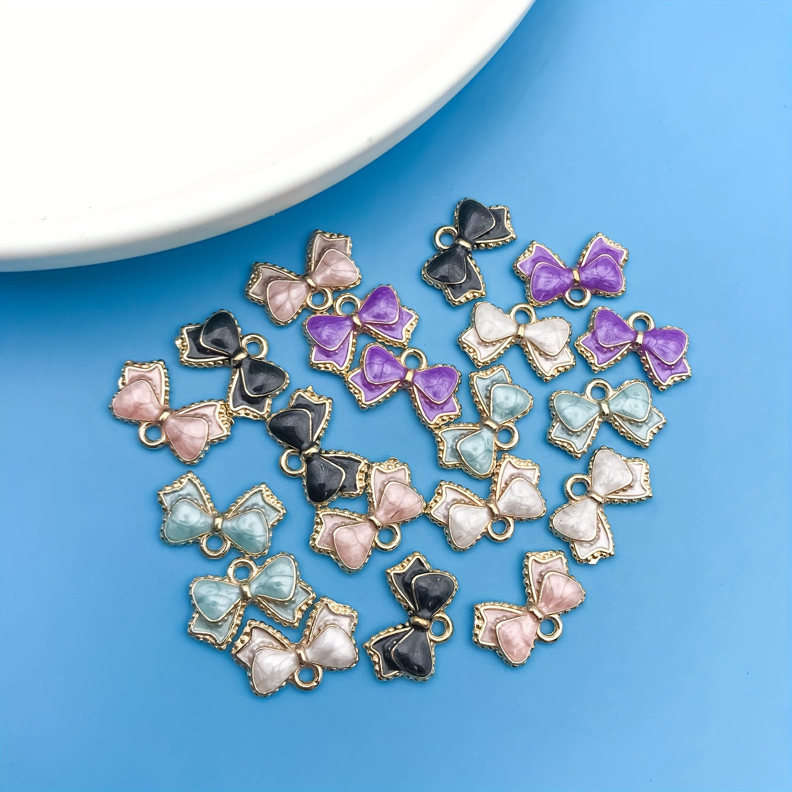 Add a touch of elegance to your handmade jewelry with this set of 20 enamel droplet oil bow shaped charms. Perfect for necklaces, bracelets, and earrings.