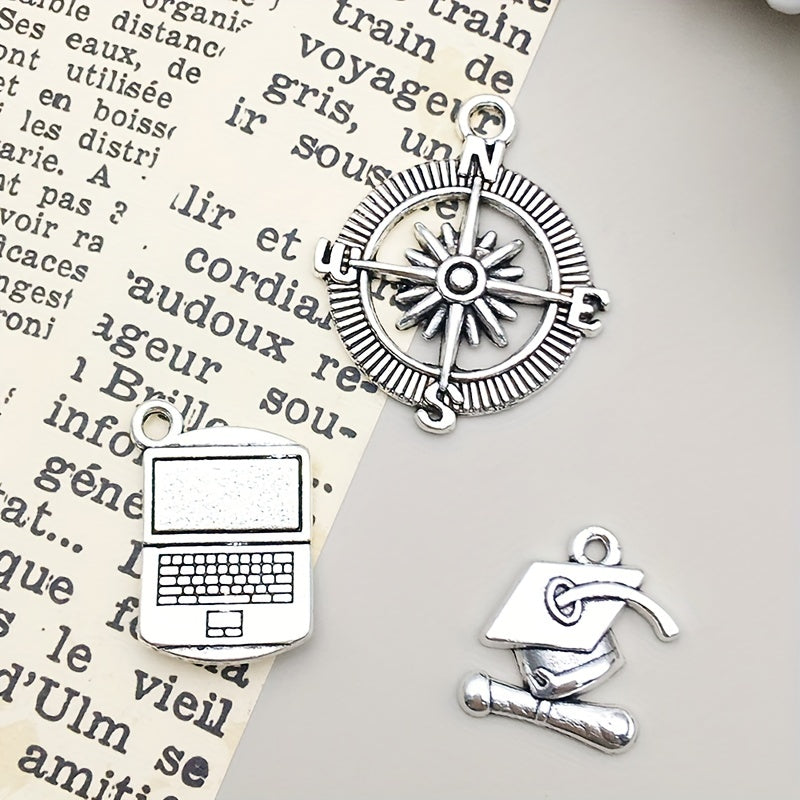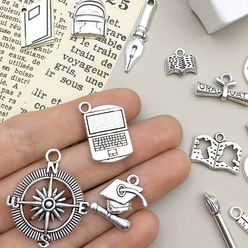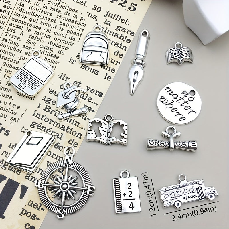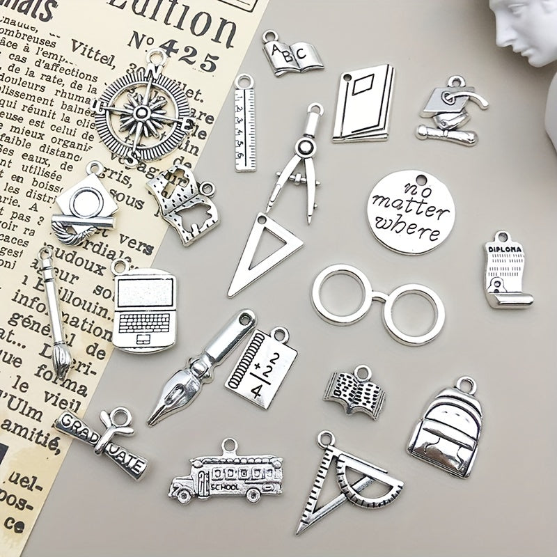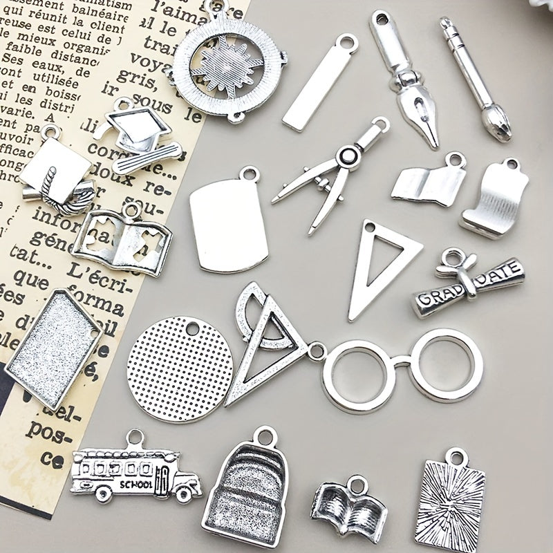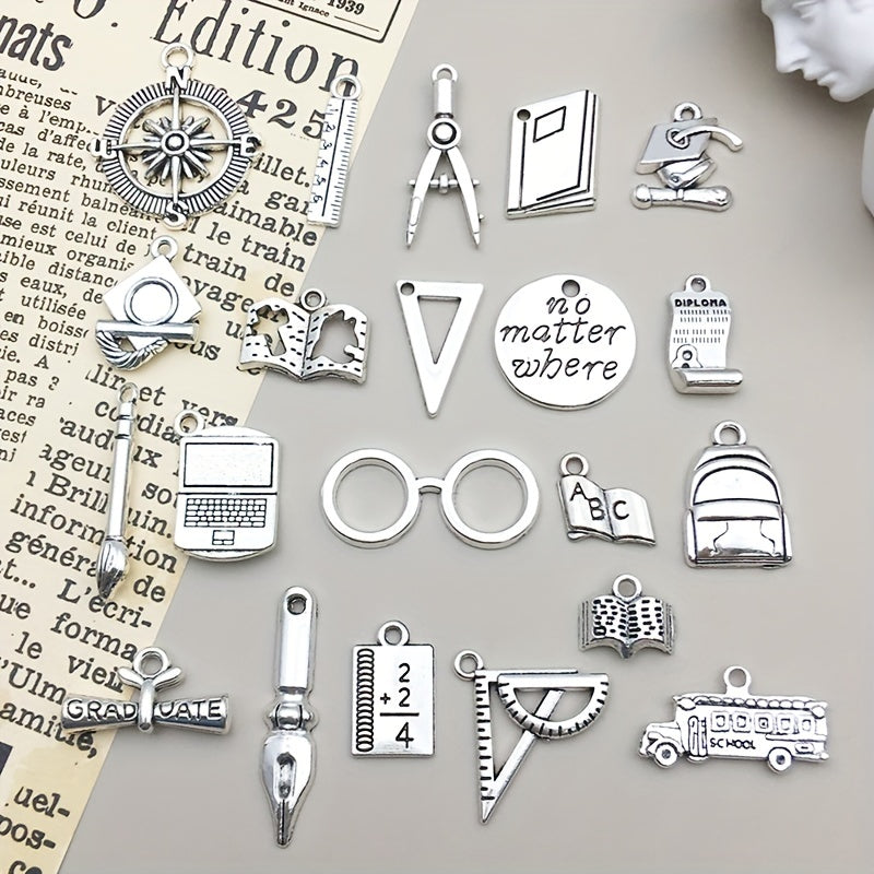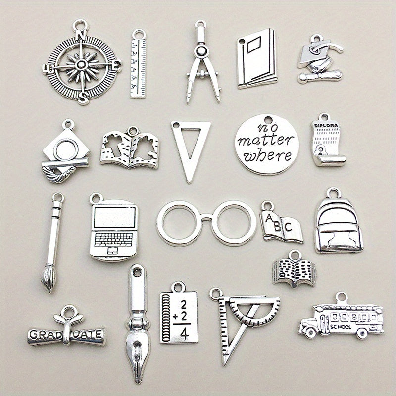Get this pack of 20pcs Graduation Season Style Book Pen Ruler School Bag Stationery Pendant for your jewelry making projects. Ideal for teachers and students alike.