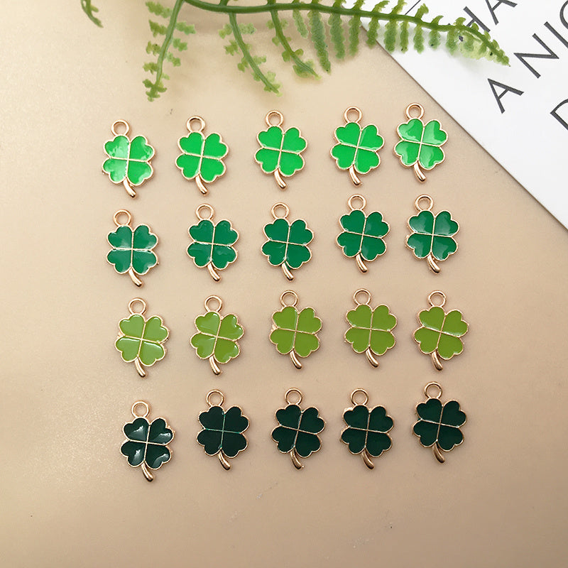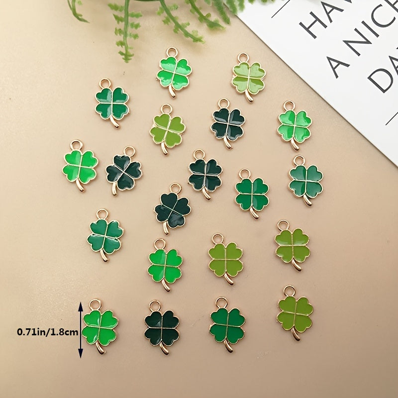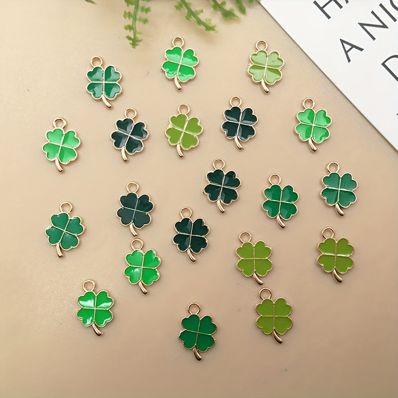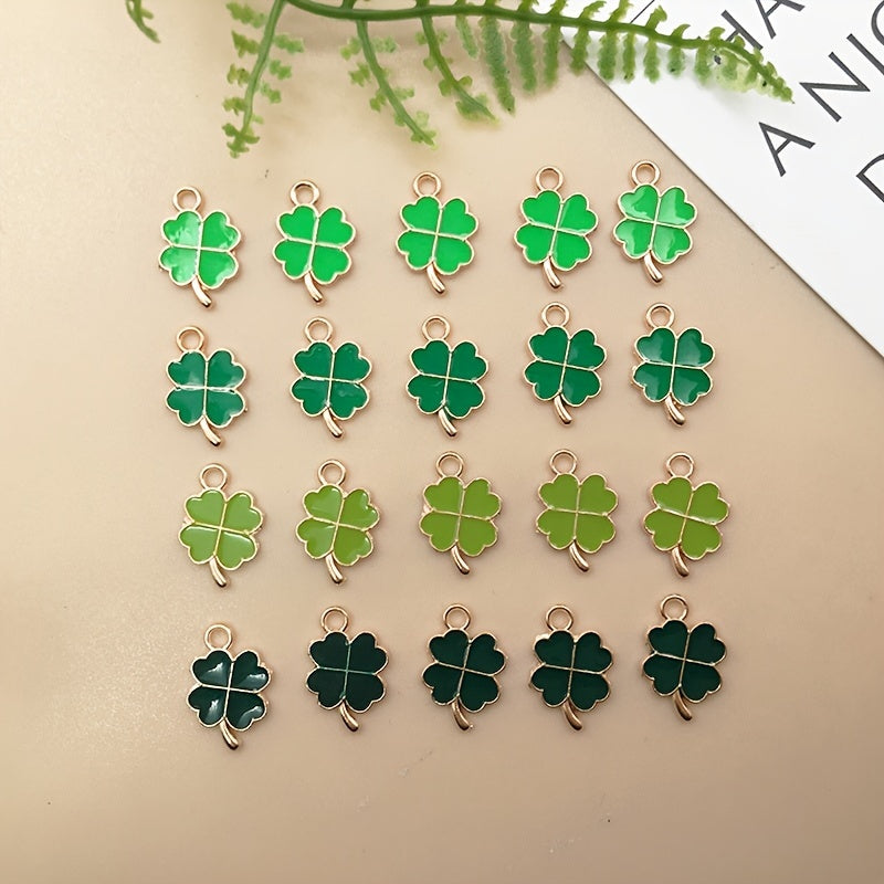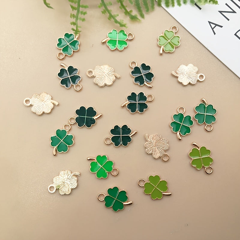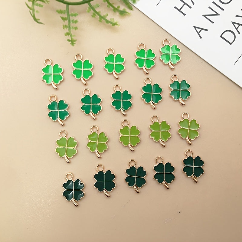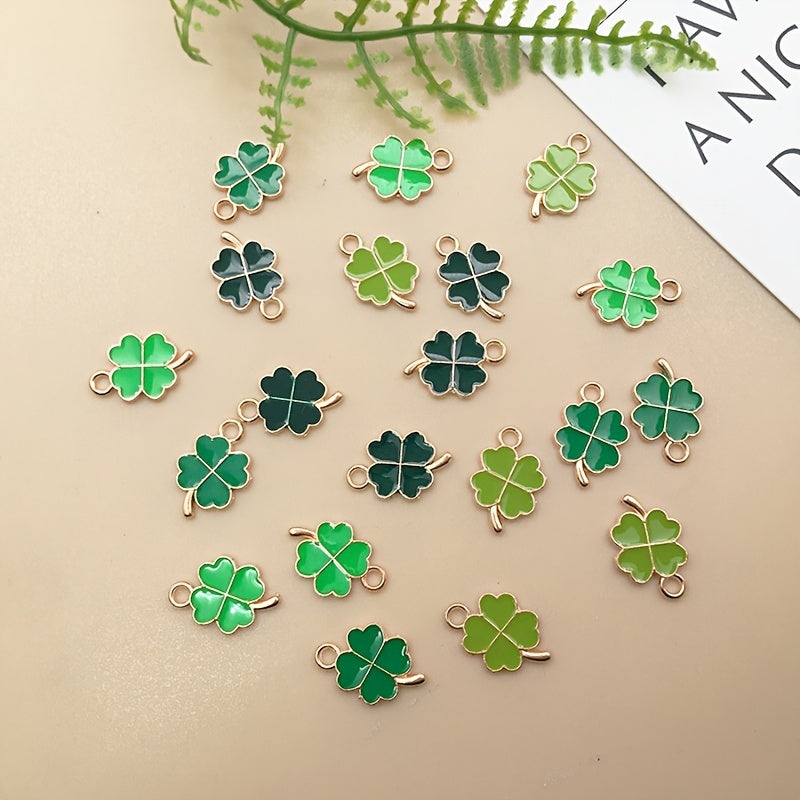 Add a touch of luck to your jewelry with these green four-leaf clover charms. Perfect for St. Patrick's Day-themed crafts, these pendants can be used to create bracelets, earrings, and necklaces.