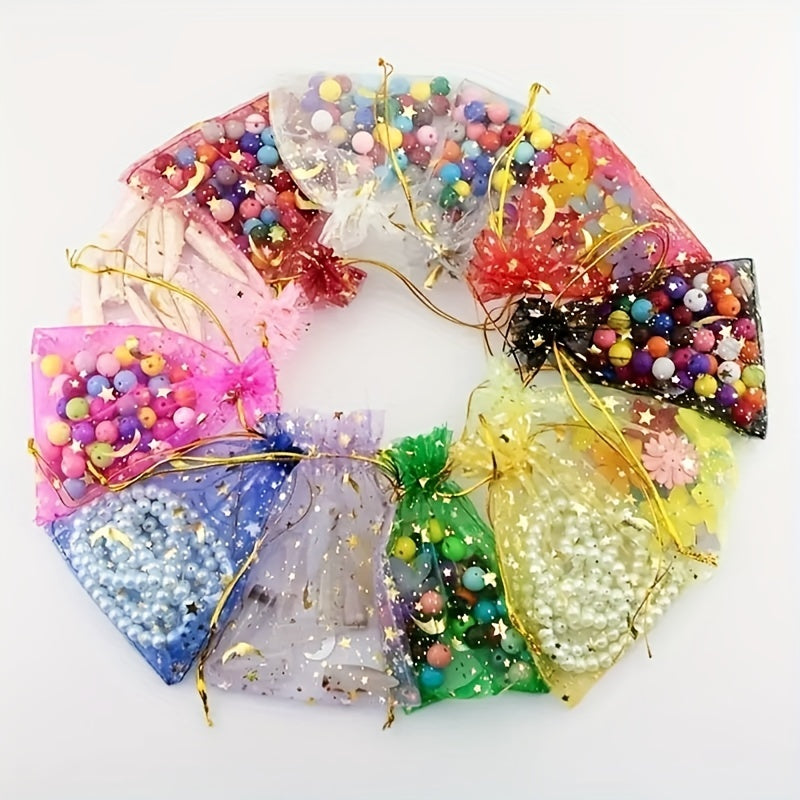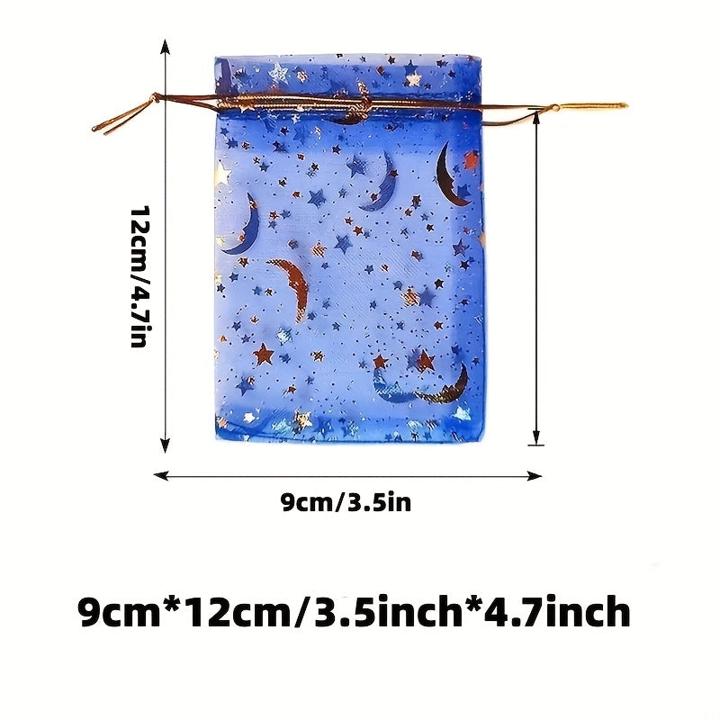 These organza gift bags are printed with moon and star designs, perfect for gifting jewelry or candies during Christmas, weddings, or parties. The drawstring closure adds a touch of elegance.