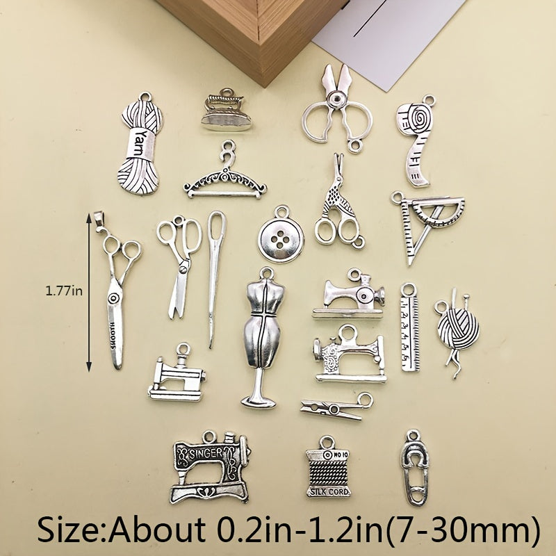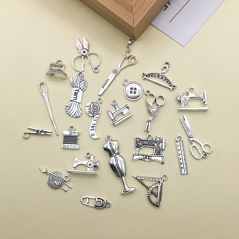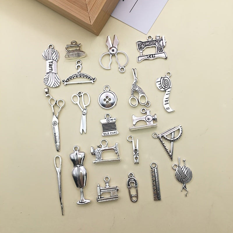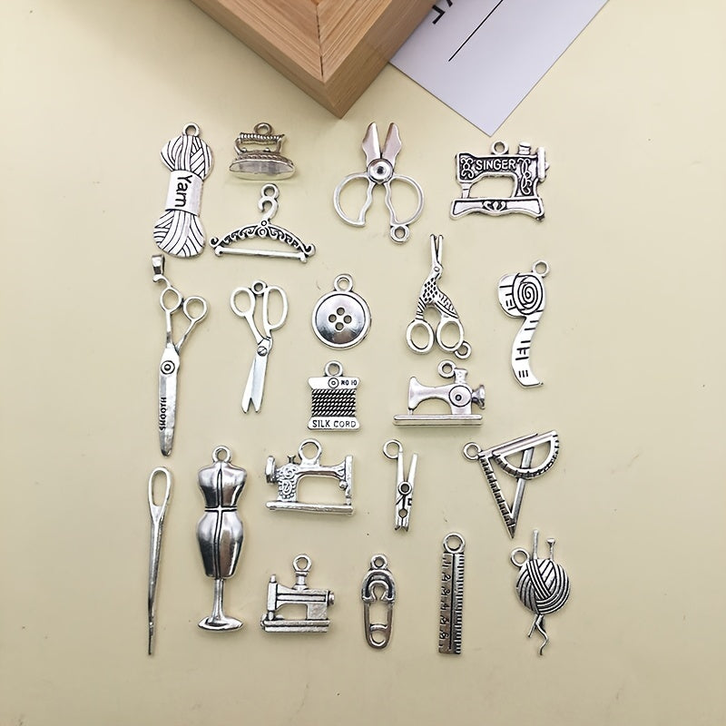 Enhance your jewelry creations with this set of 20 zinc alloy antique silver sewing-theme pendants. Perfect for necklaces, bracelets, and other accessories.