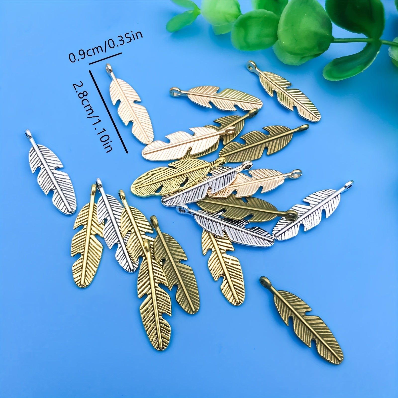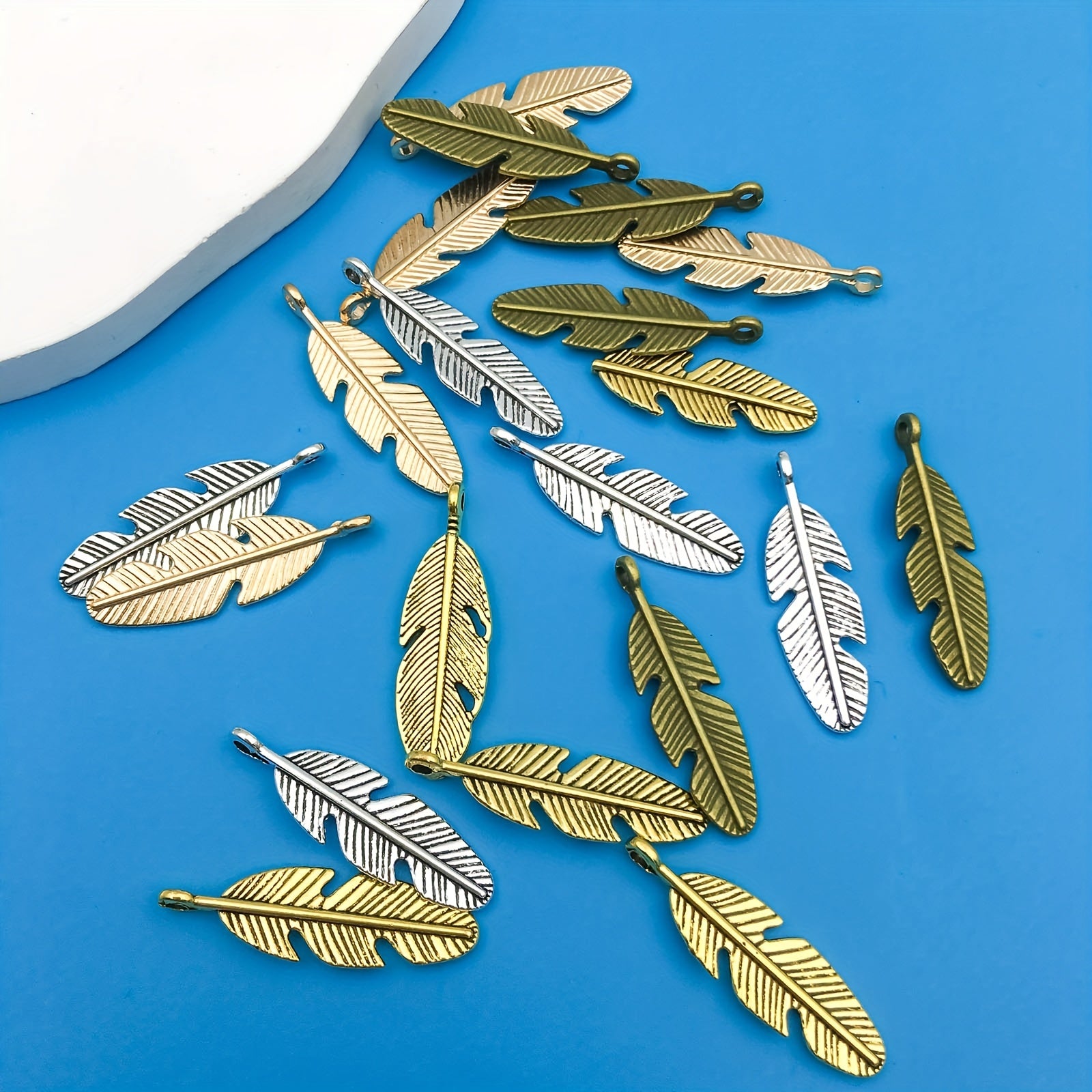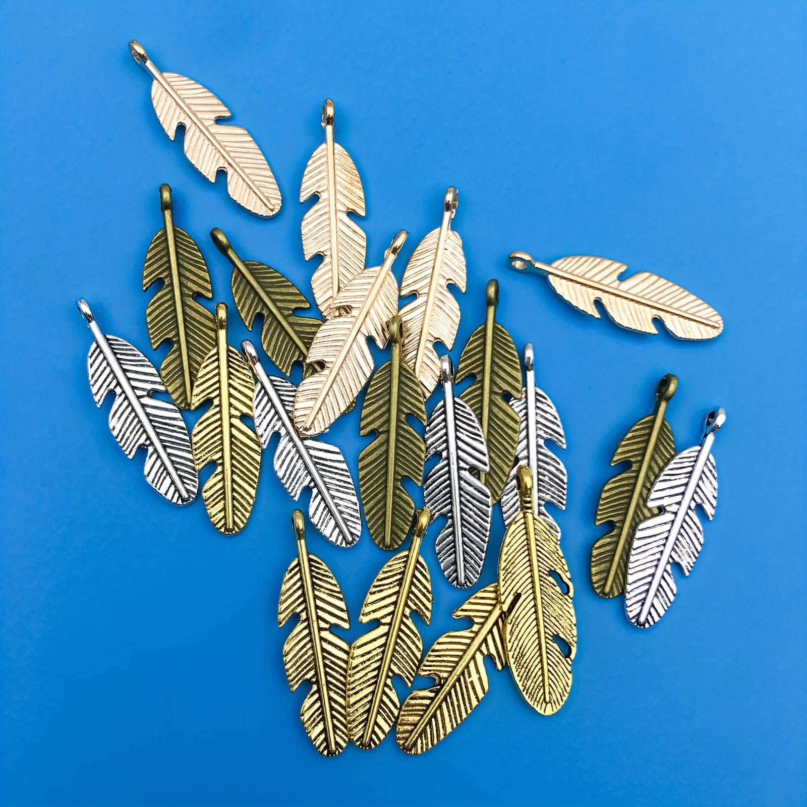 Get this pack of 20 zinc alloy feather shape charms pendants to create your own DIY bracelet or necklace. These semi-finished jewelry accessories are perfect for crafting unique pieces.