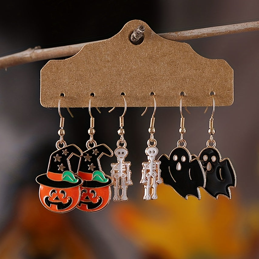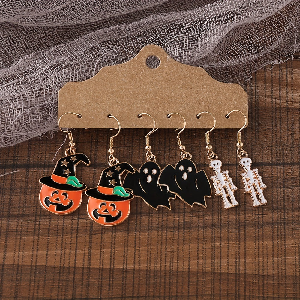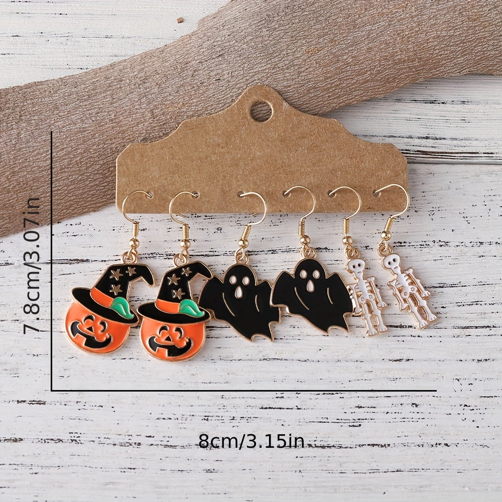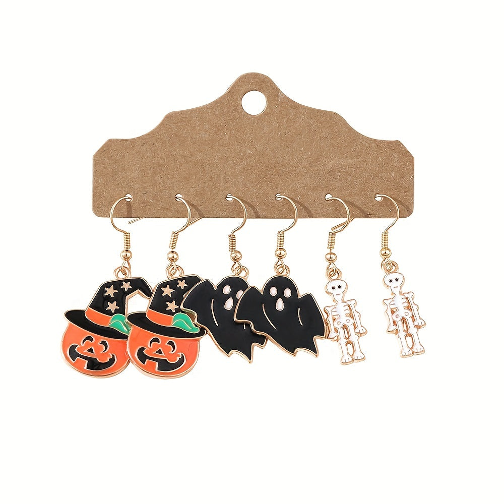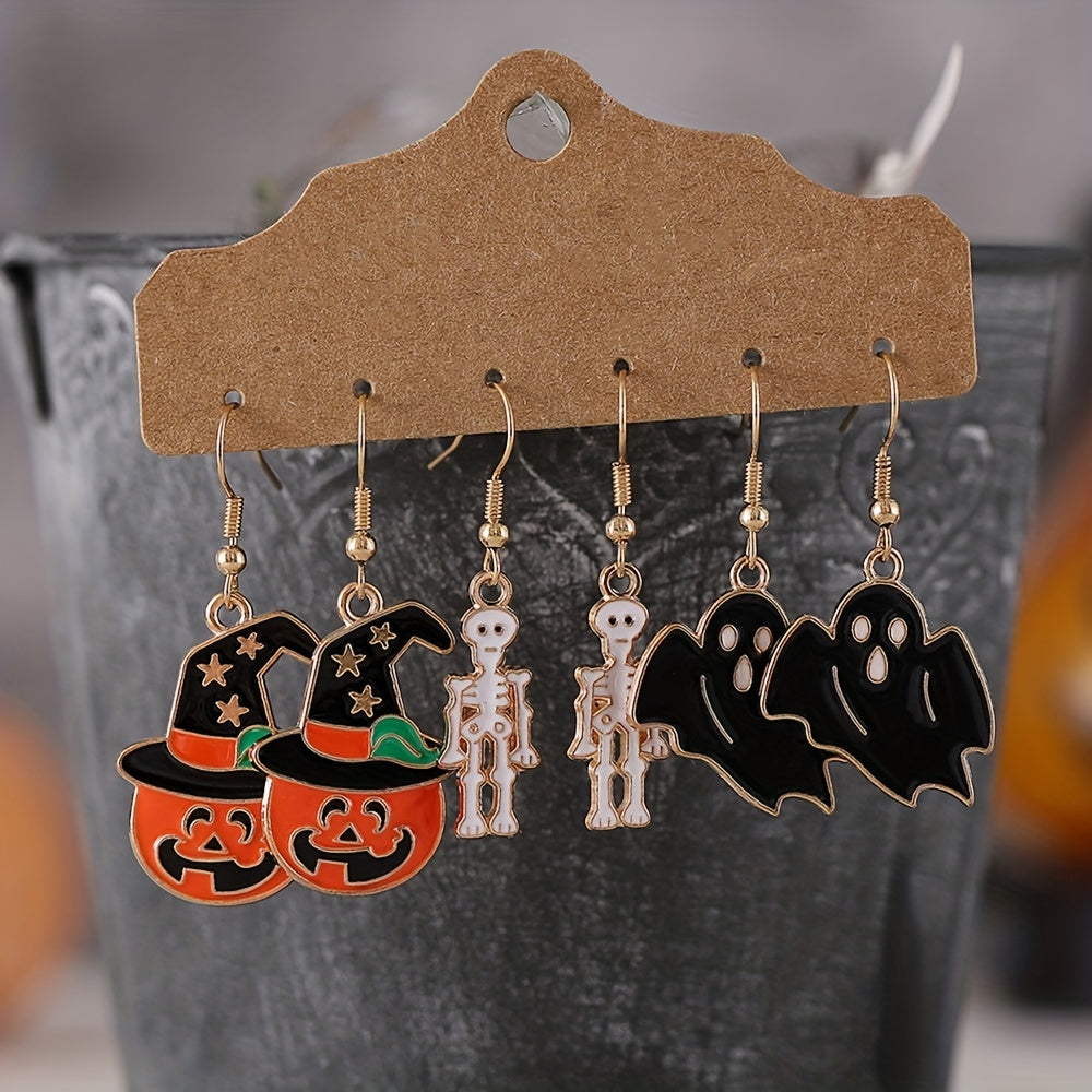 3 Pairs Halloween Enamel Dangle Earrings Pumpkin Skeleton Bat Retro Goth Style