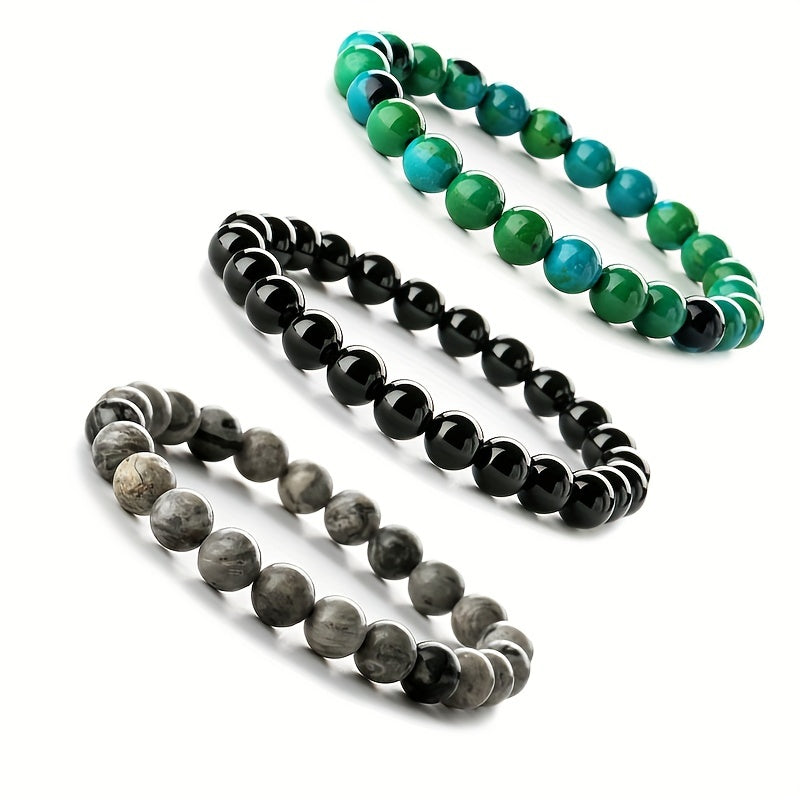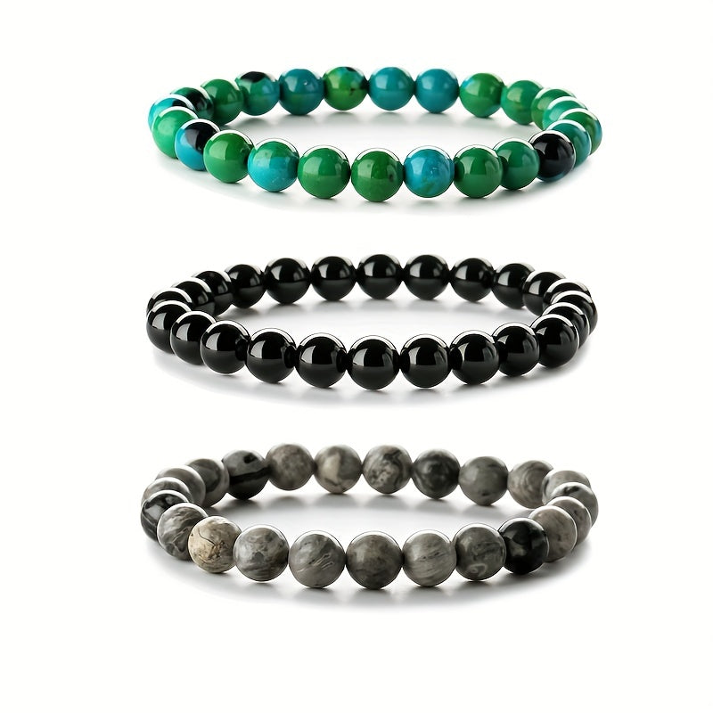 This set includes 3 elastic stone bead bracelets, perfect for healing and yoga enthusiasts. A great gift idea for men.