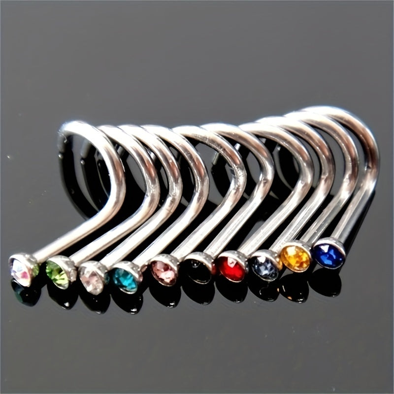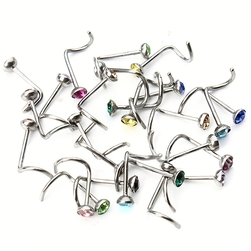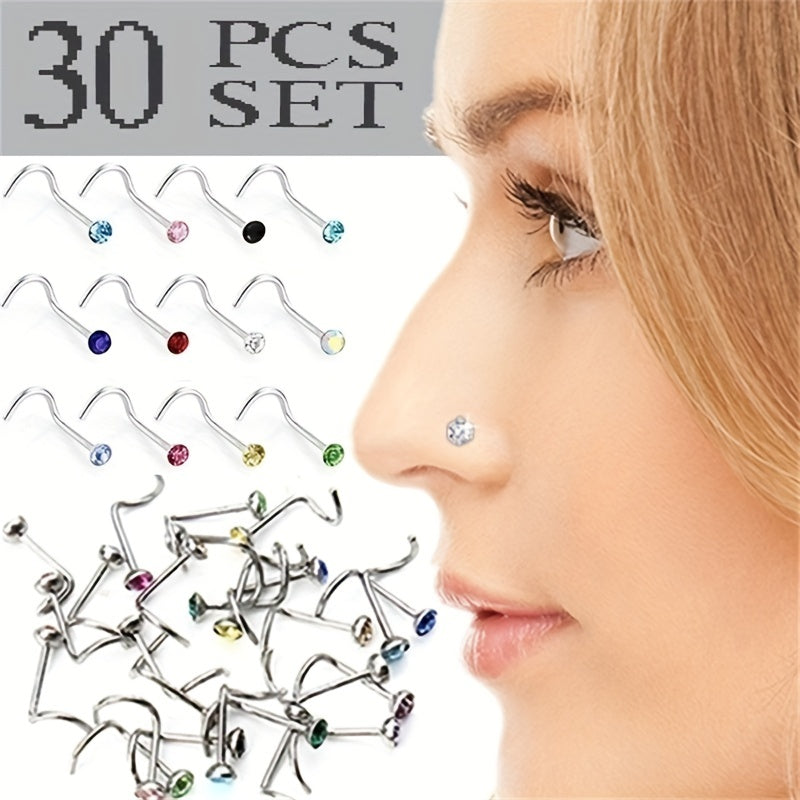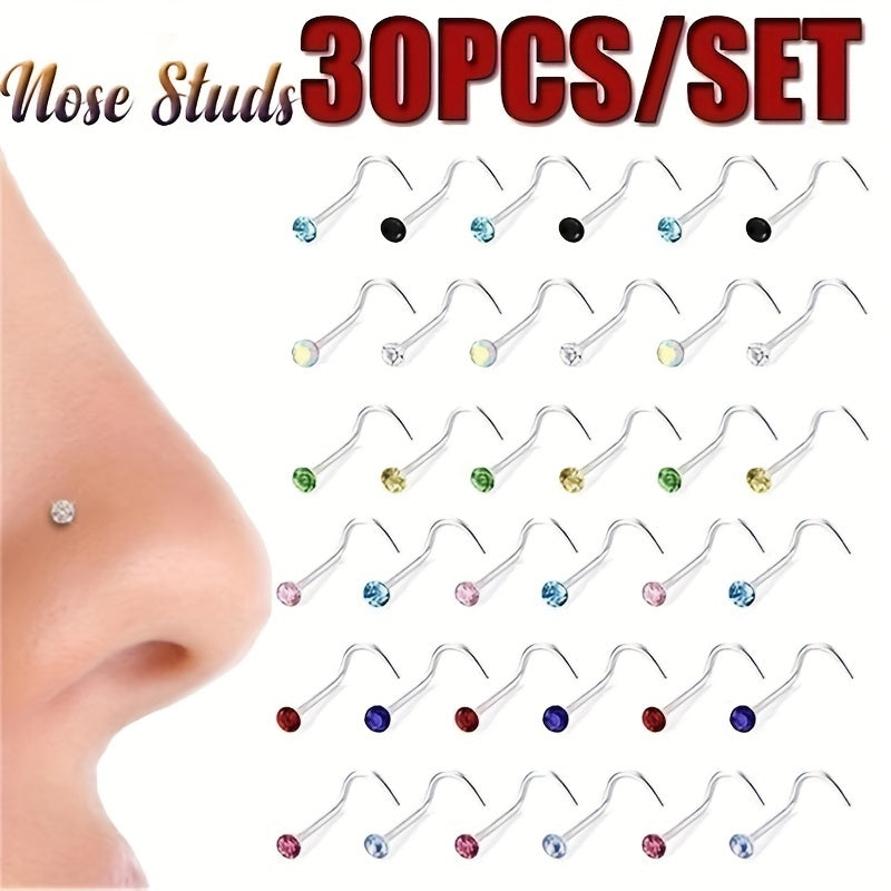 This set includes 30 nose screw rings with 2mm rhinestones, suitable for both men and women. Perfect for nose piercings and adding a touch of sparkle.