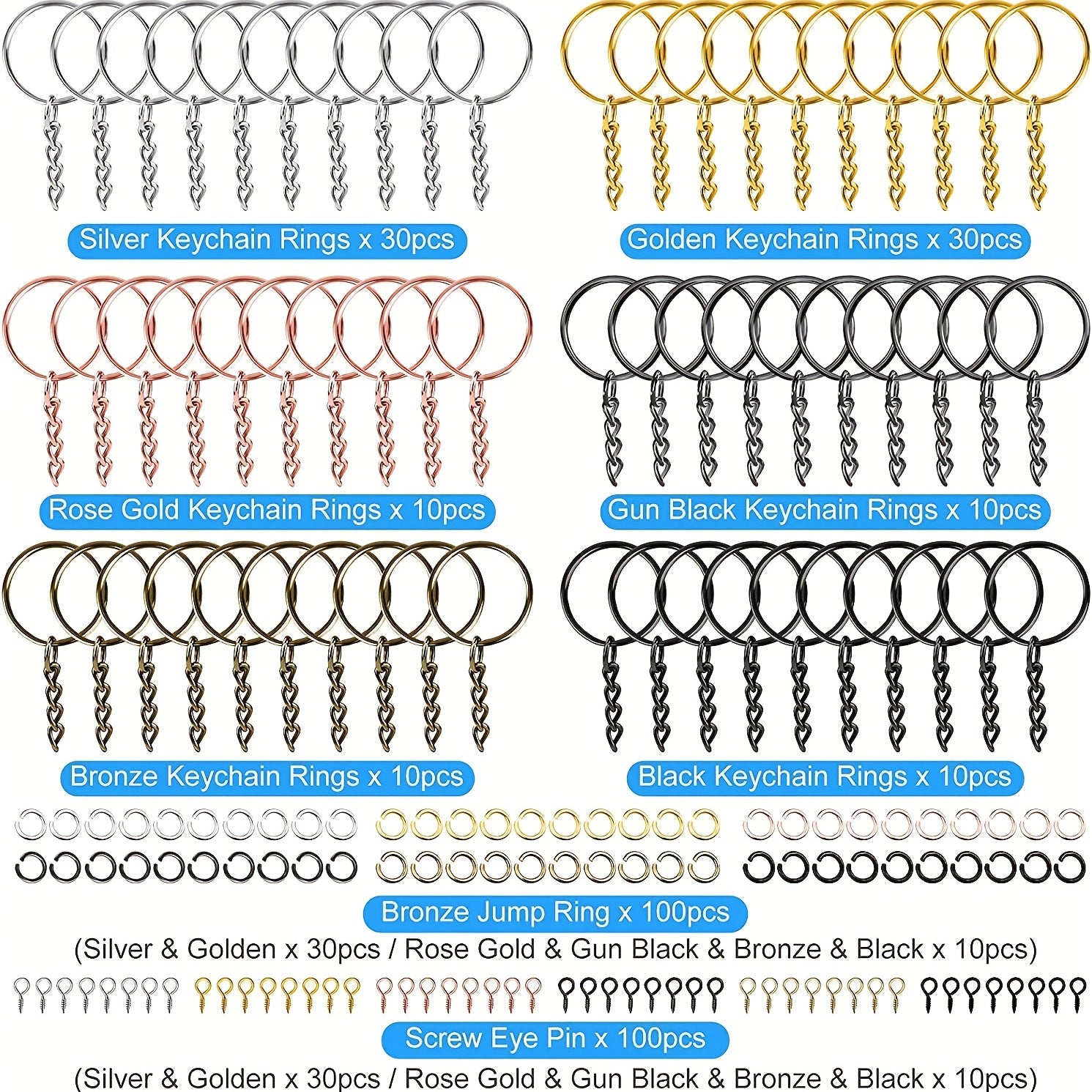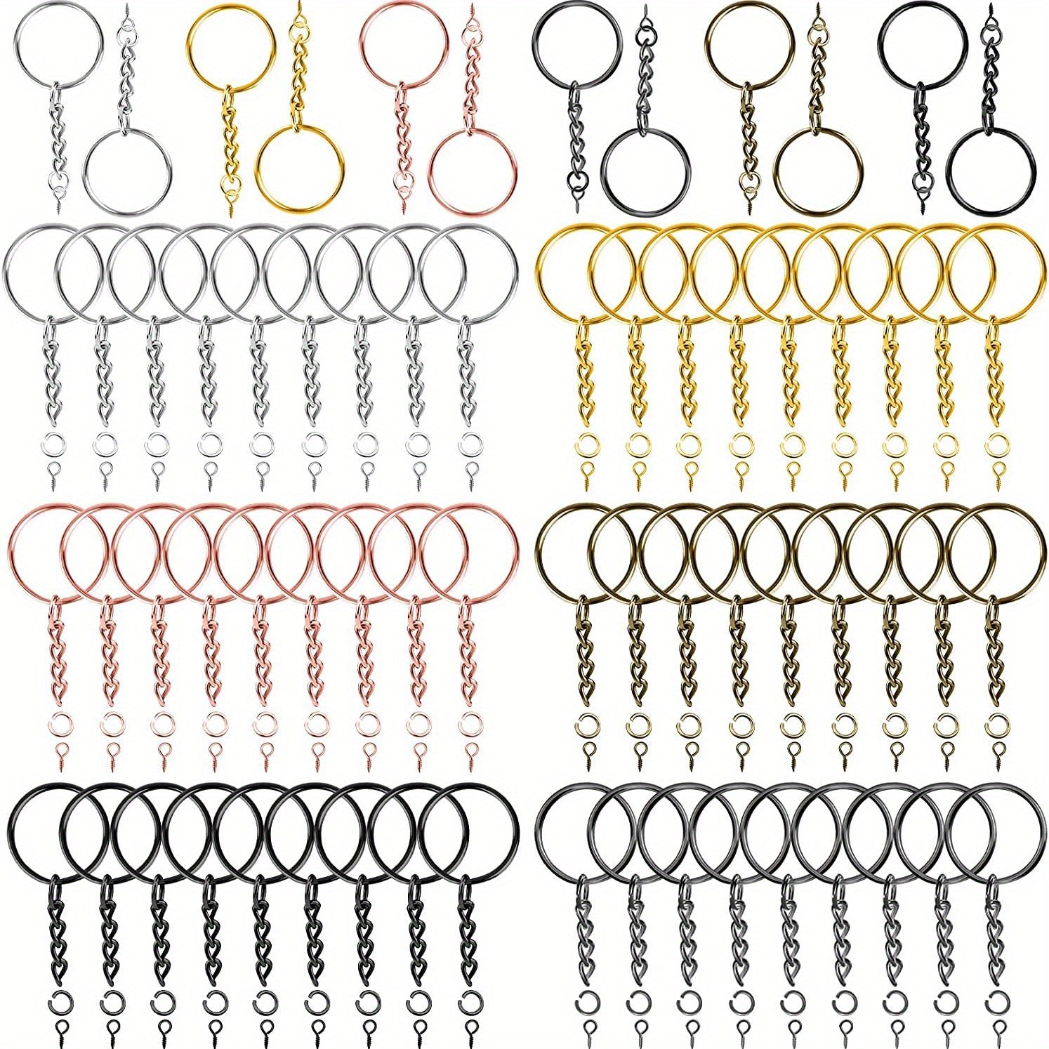 This set includes 300 iron split key rings with chains, jump rings, and screw eye pins. Perfect for holiday crafting projects.