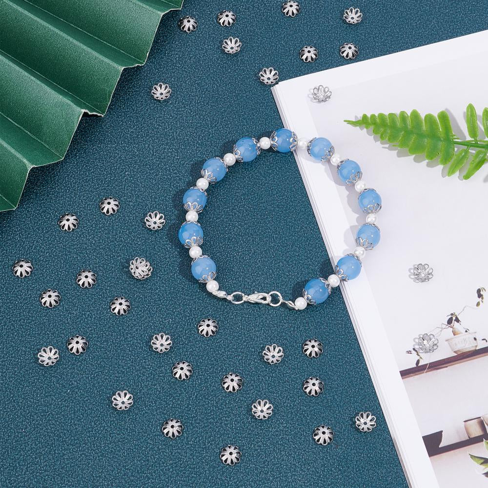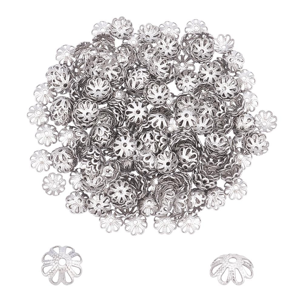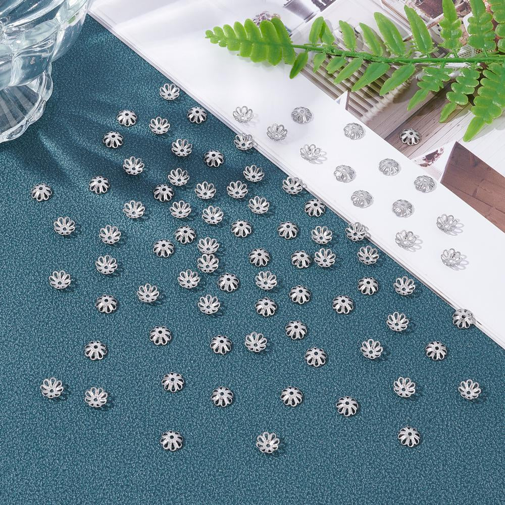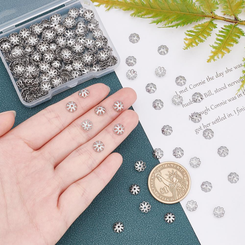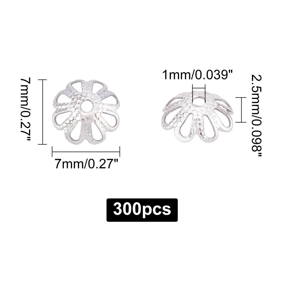 This box contains 300 stainless steel bead caps in petal flower design. Each bead cap measures 7x7x2.5mm with a hole size of 1mm.
