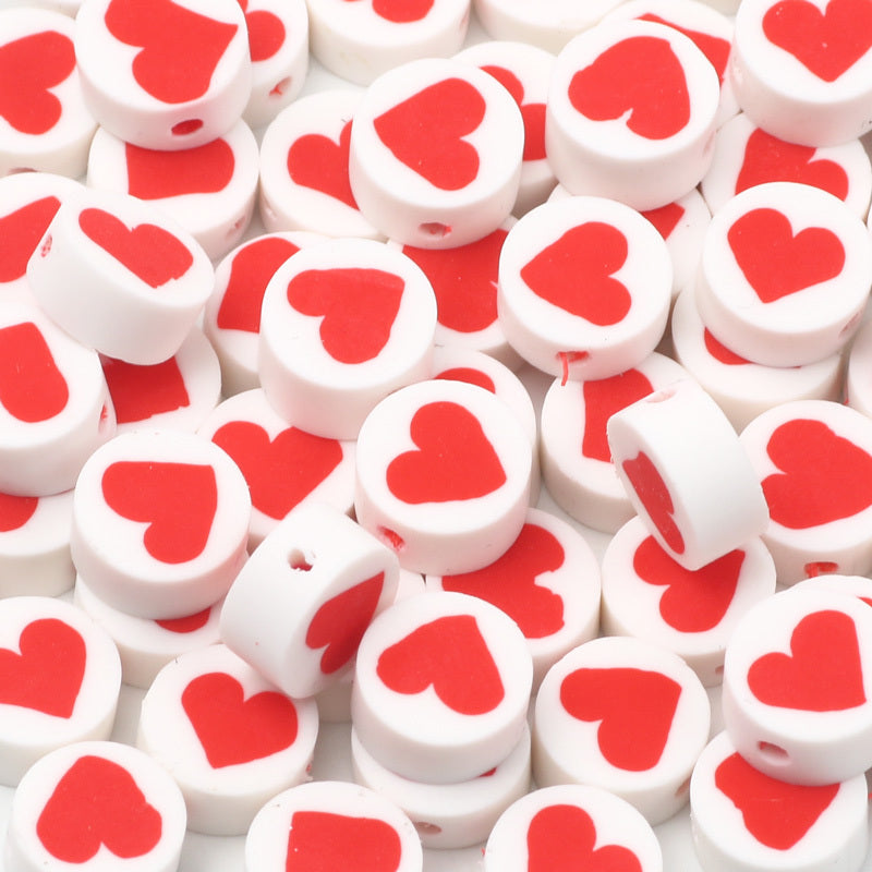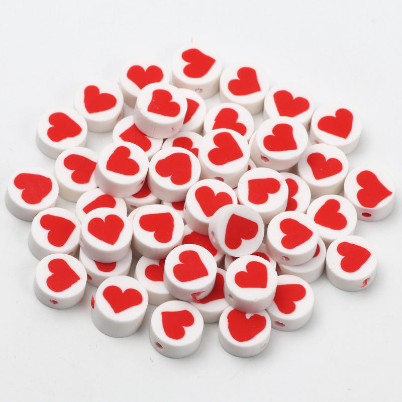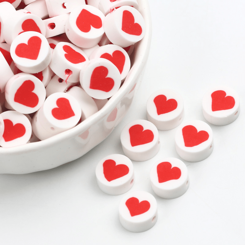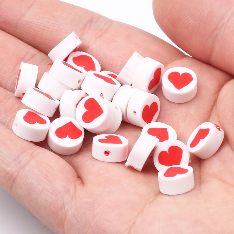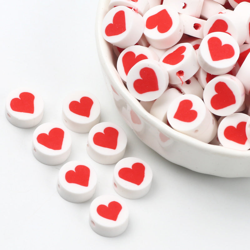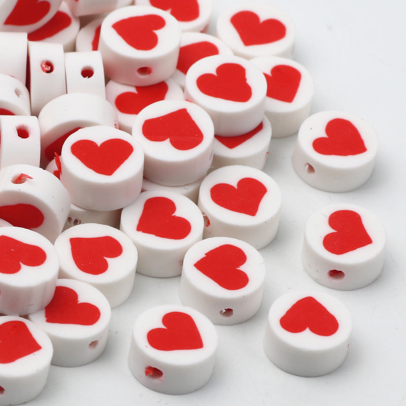 Create beautiful bracelets, necklaces, and accessories with these 10mm red heart pattern round polymer clay beads. Perfect for jewelry making projects.