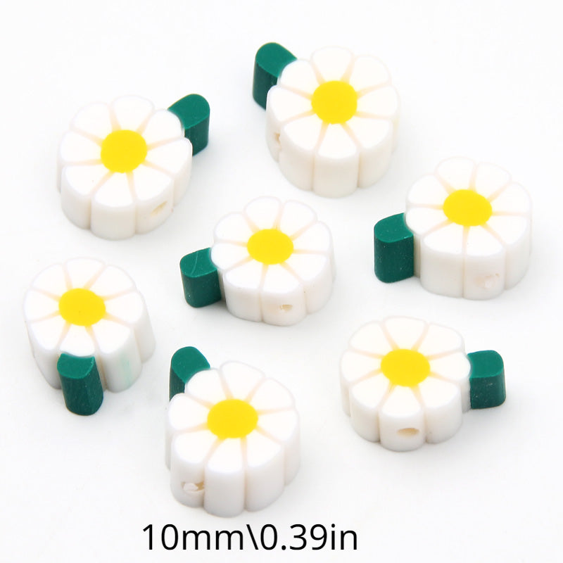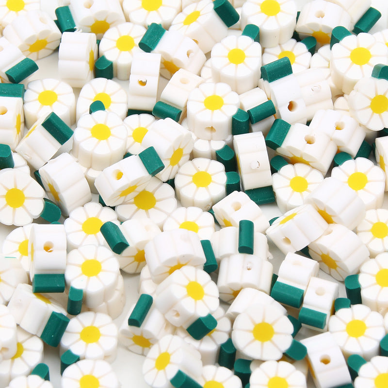 These daisy pattern polymer clay beads are perfect for creating unique jewelry pieces. Use them to make bracelets, earrings, and other accessories. Each pack contains 30 spacer beads.