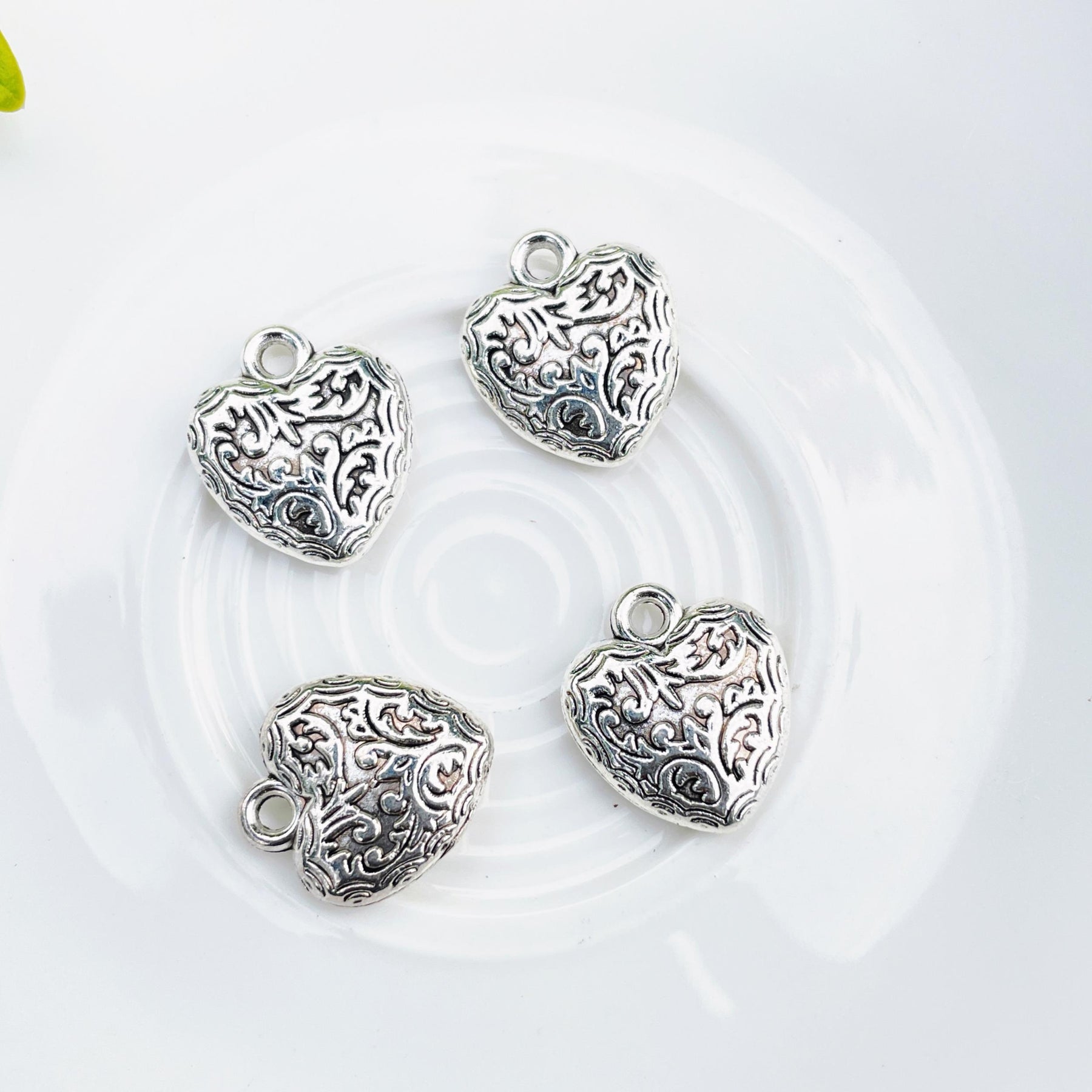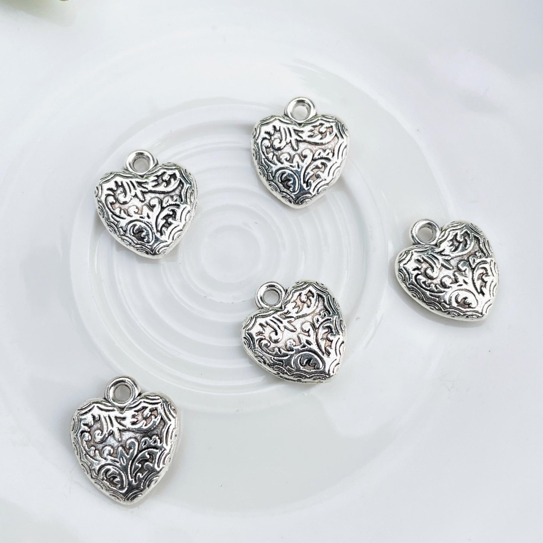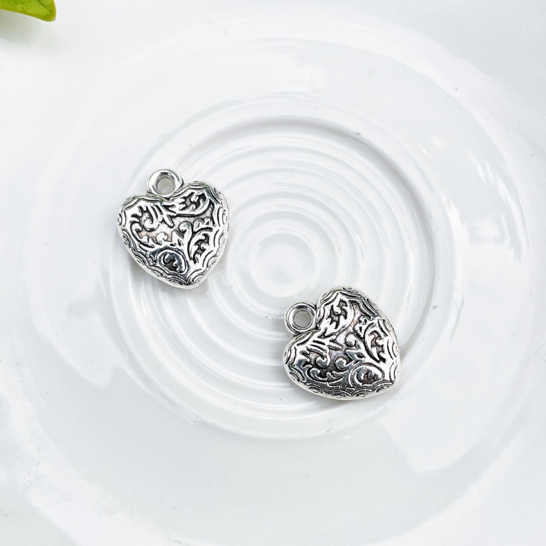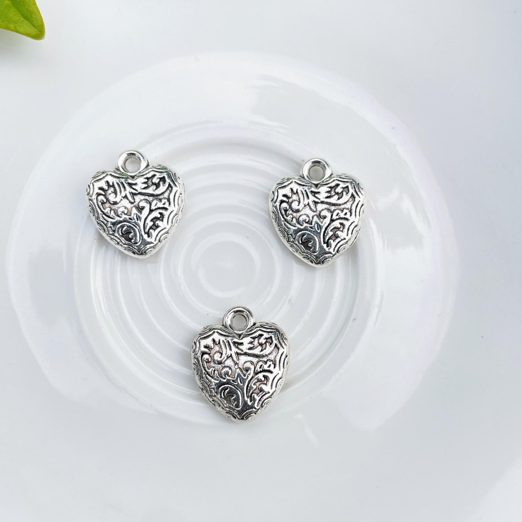 Add a touch of elegance with these silvery engraved heart shape pendants. Perfect for creating your own unique earrings, bracelets, necklaces, and other accessories.