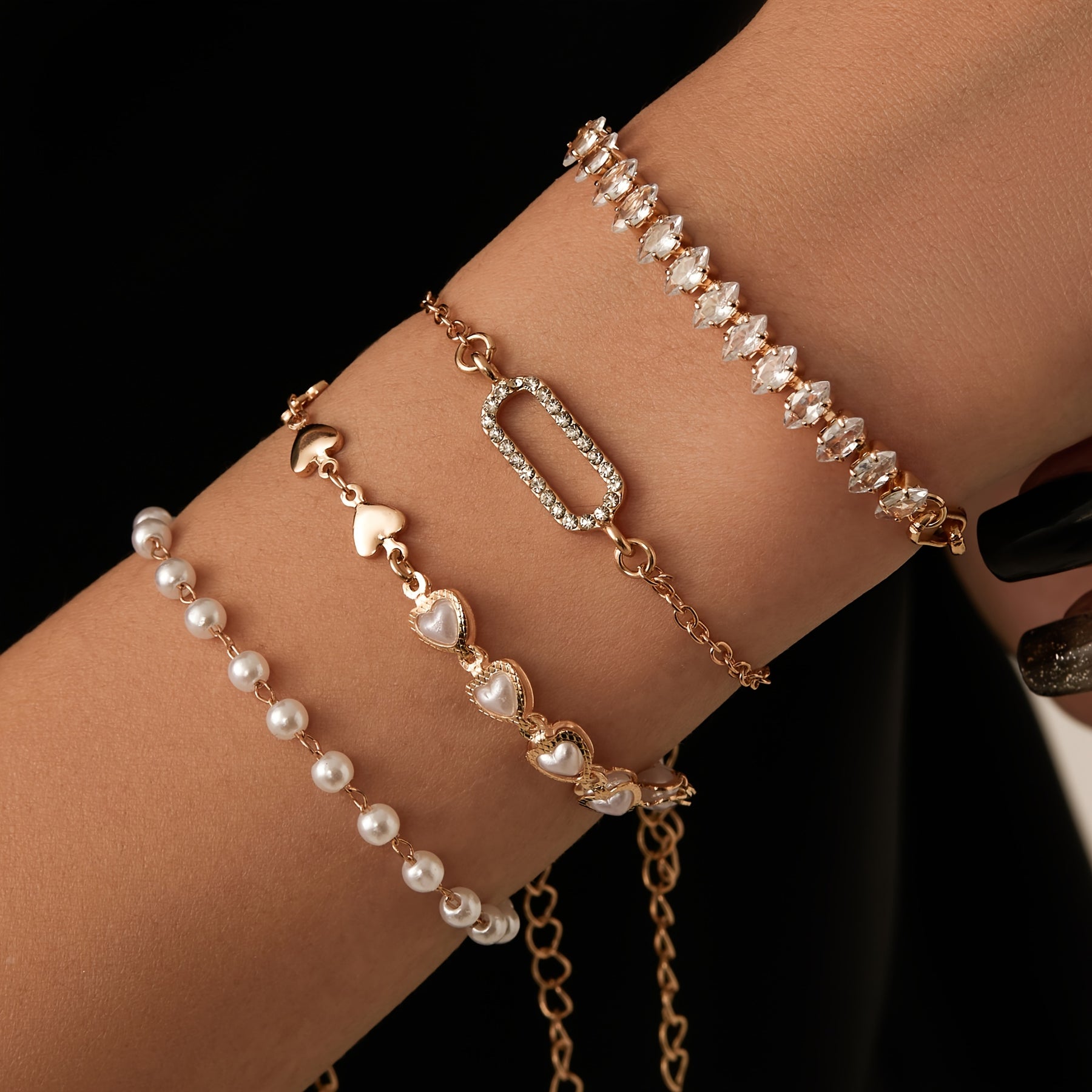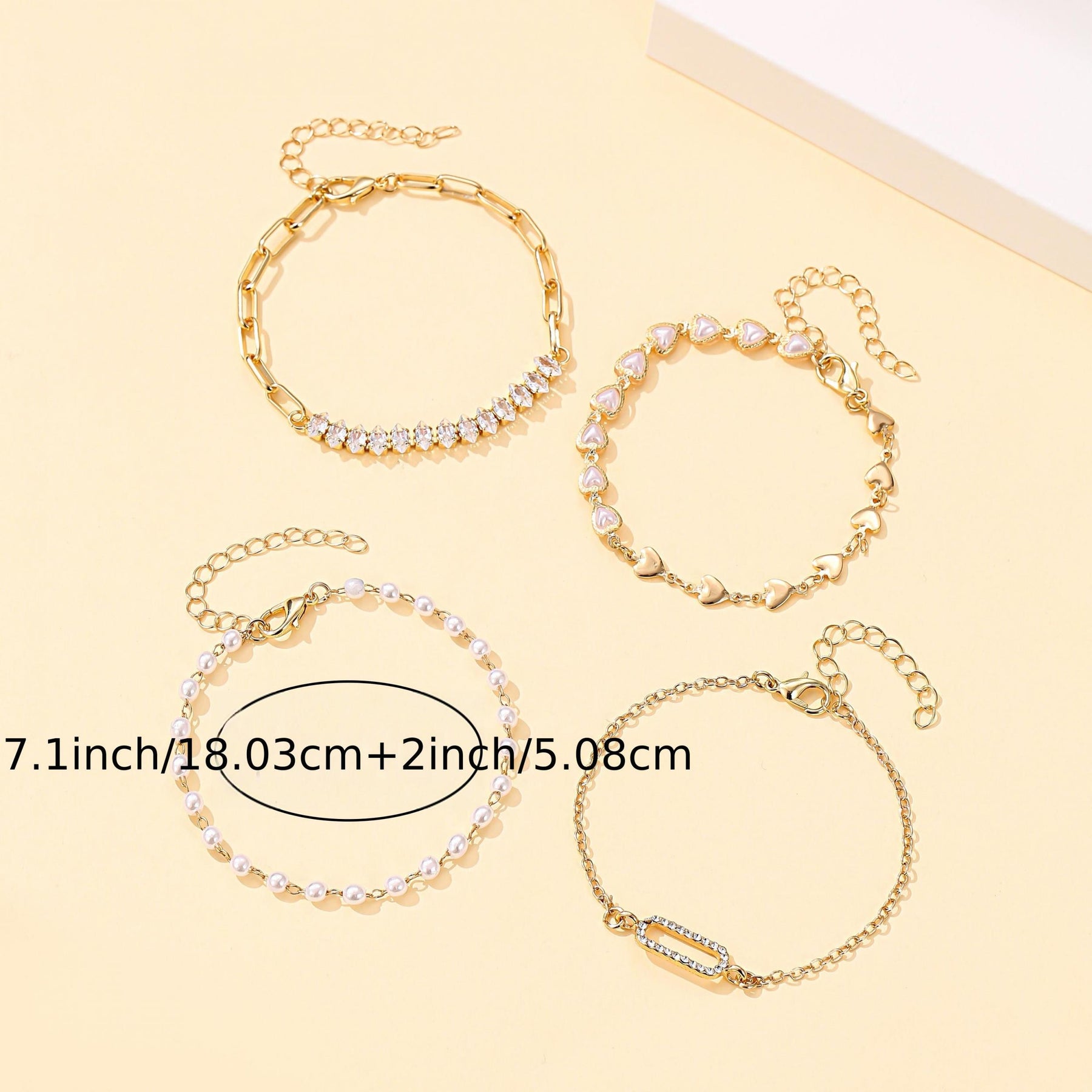 4 Pcs Beaded Chain Bracelet Set Faux Pearls Zircon Beads Elastic Summer Beach