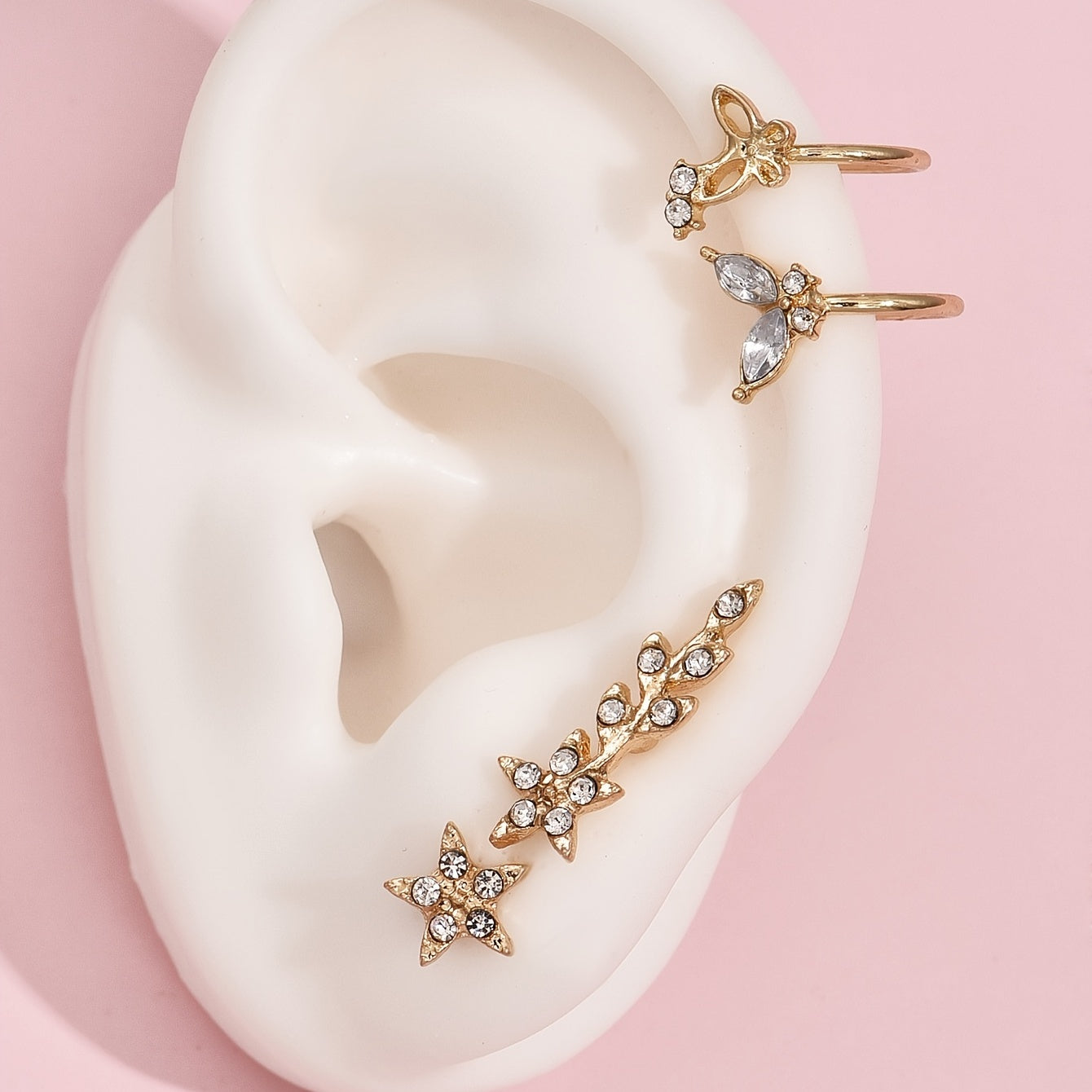 Enhance your style with this set of 4 creative crystal earrings. Perfect for non-pierced ears, featuring butterfly, star, and leaf designs.