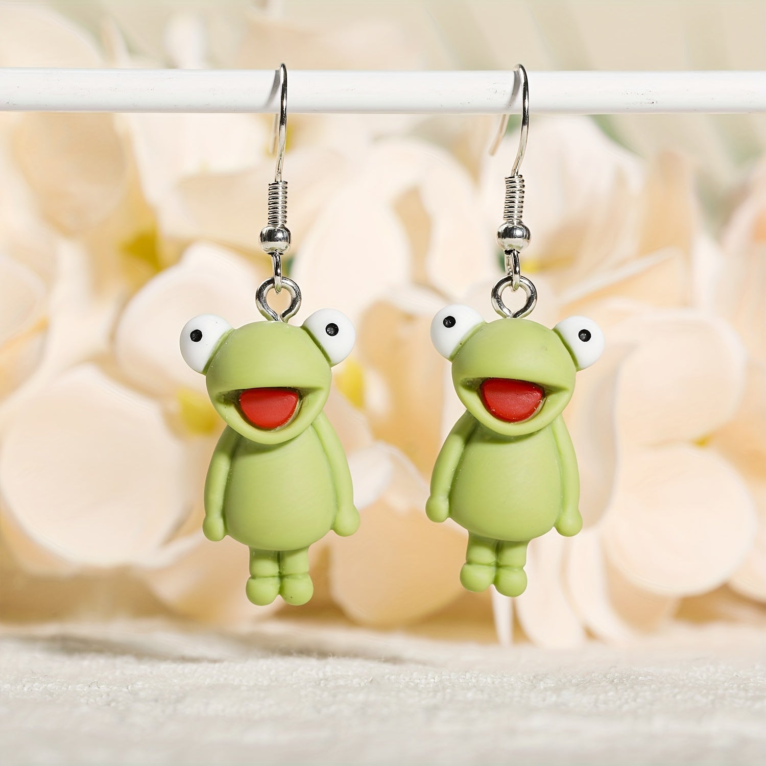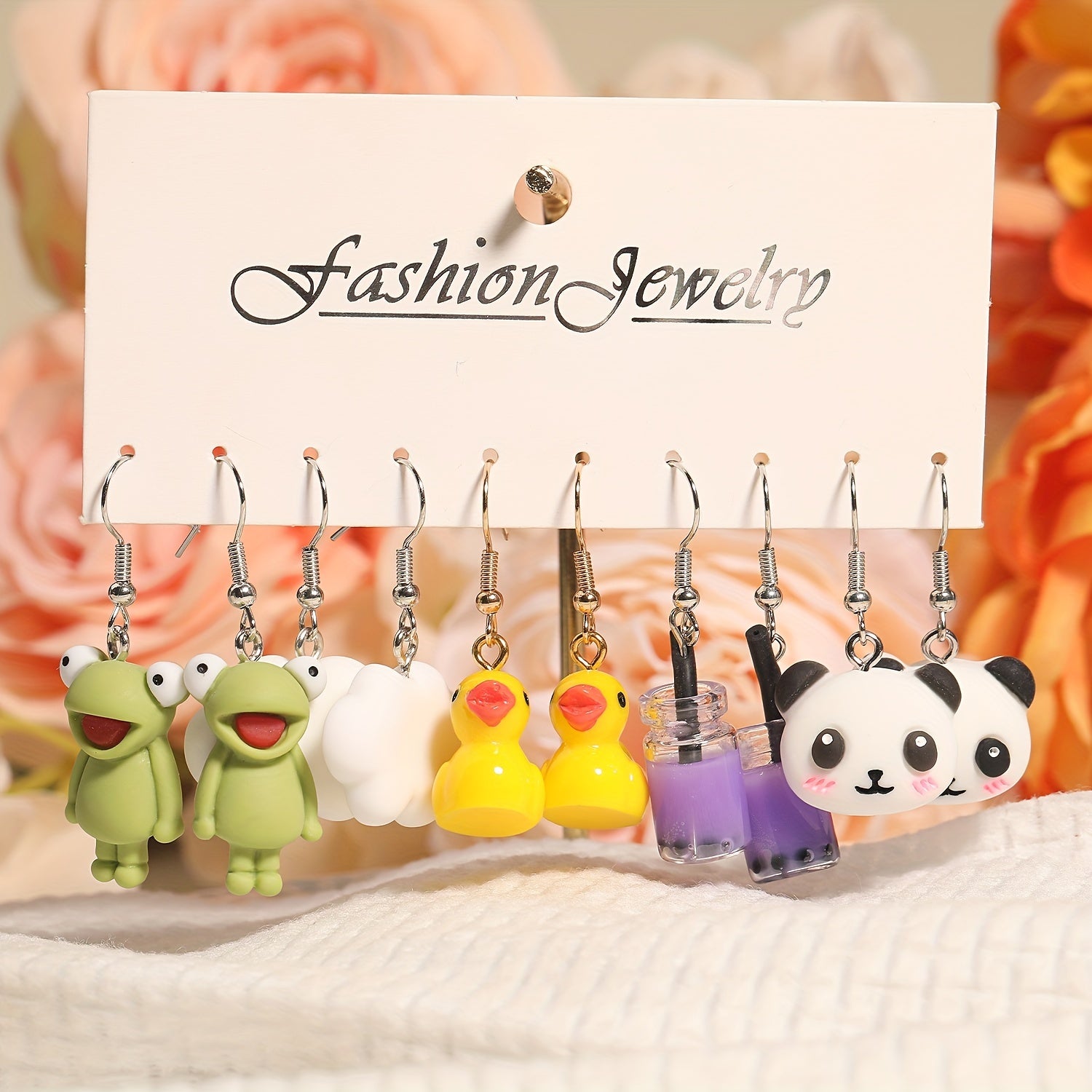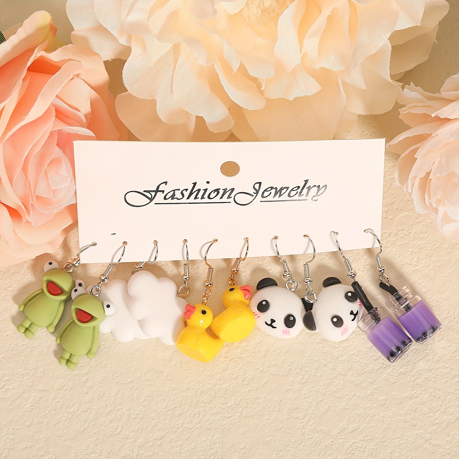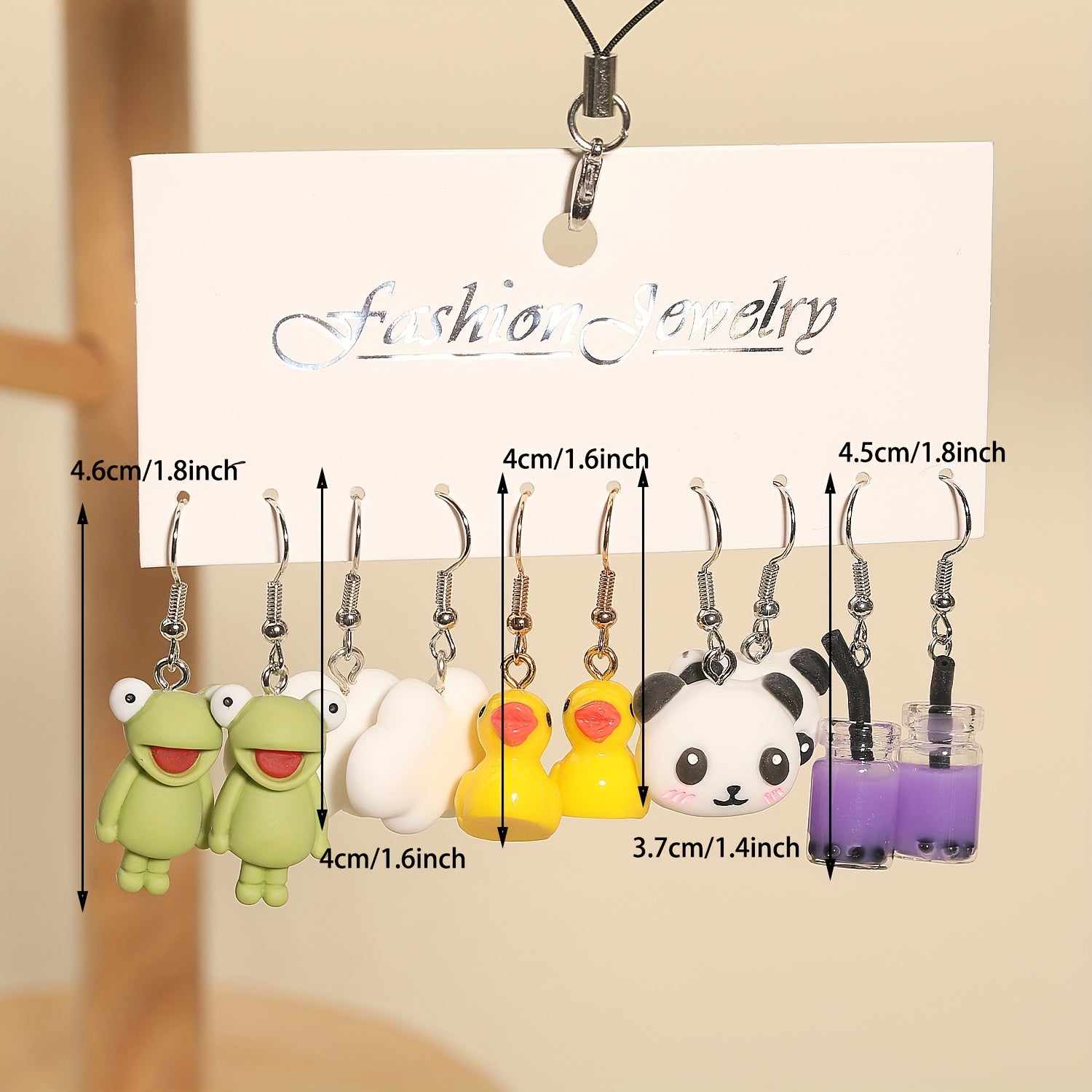 Adorn your ears with this charming set of 5 dangle earrings featuring cute designs like frogs, ducks, clouds, bears, and milk tea. Made of resin, these earrings are perfect for a female gift.