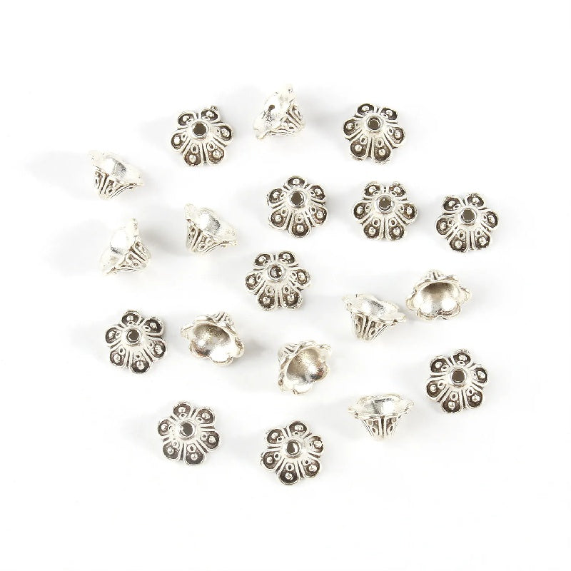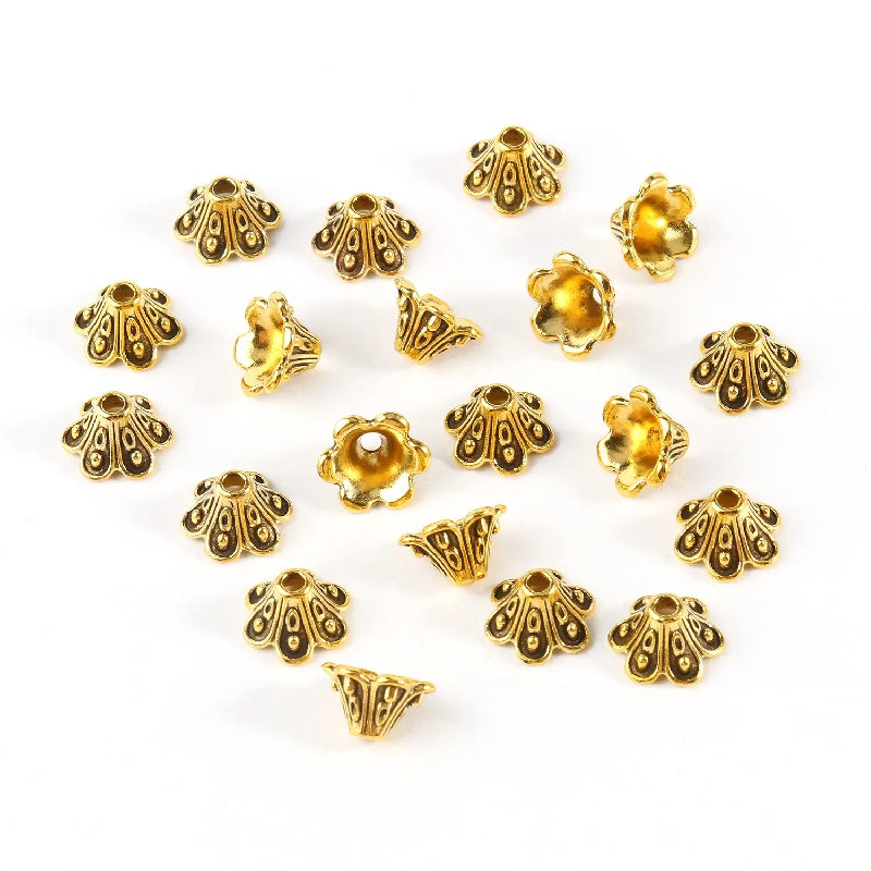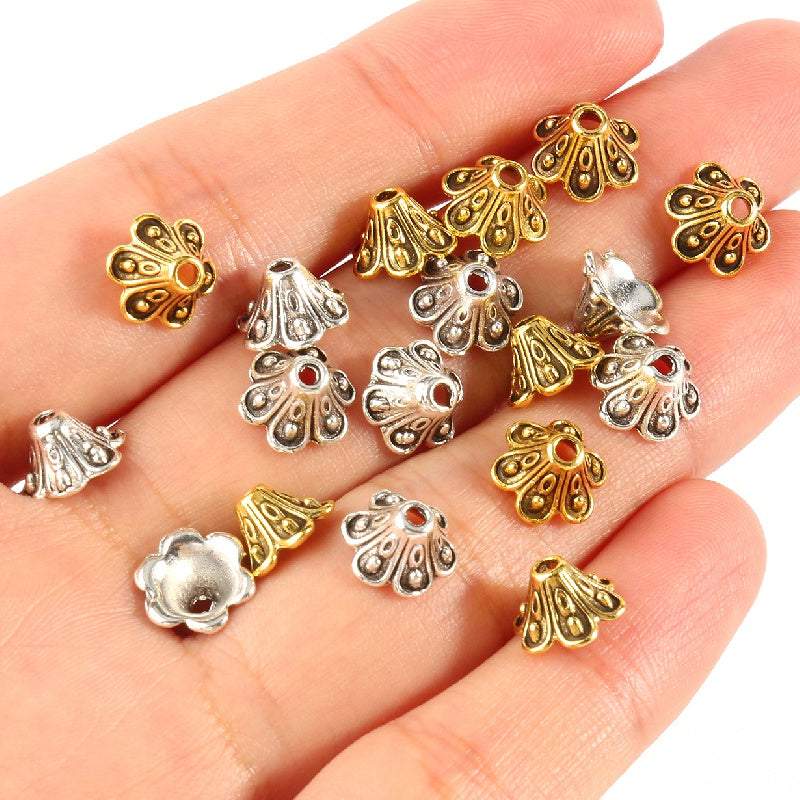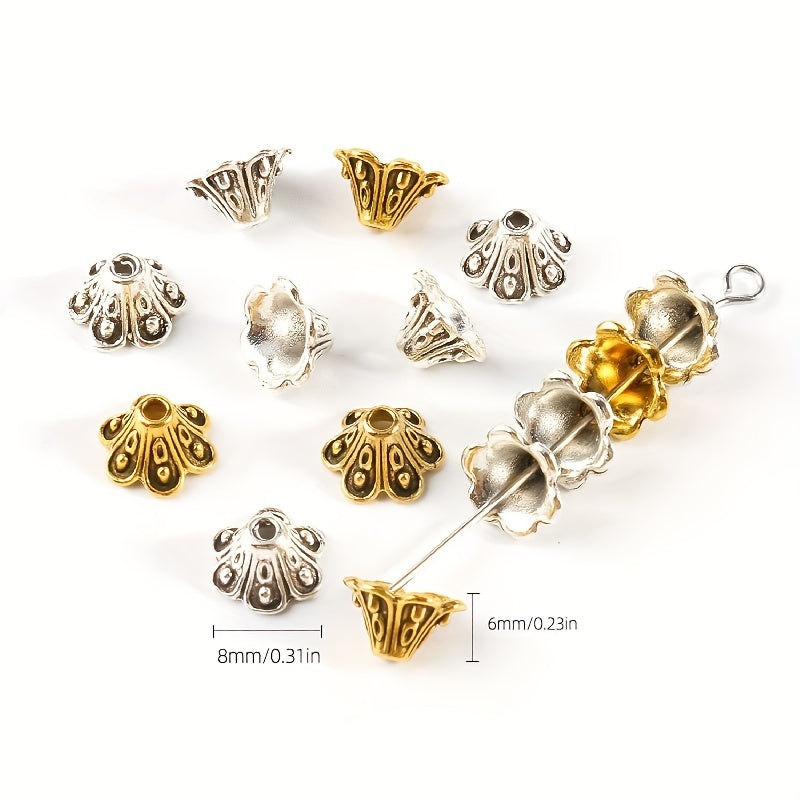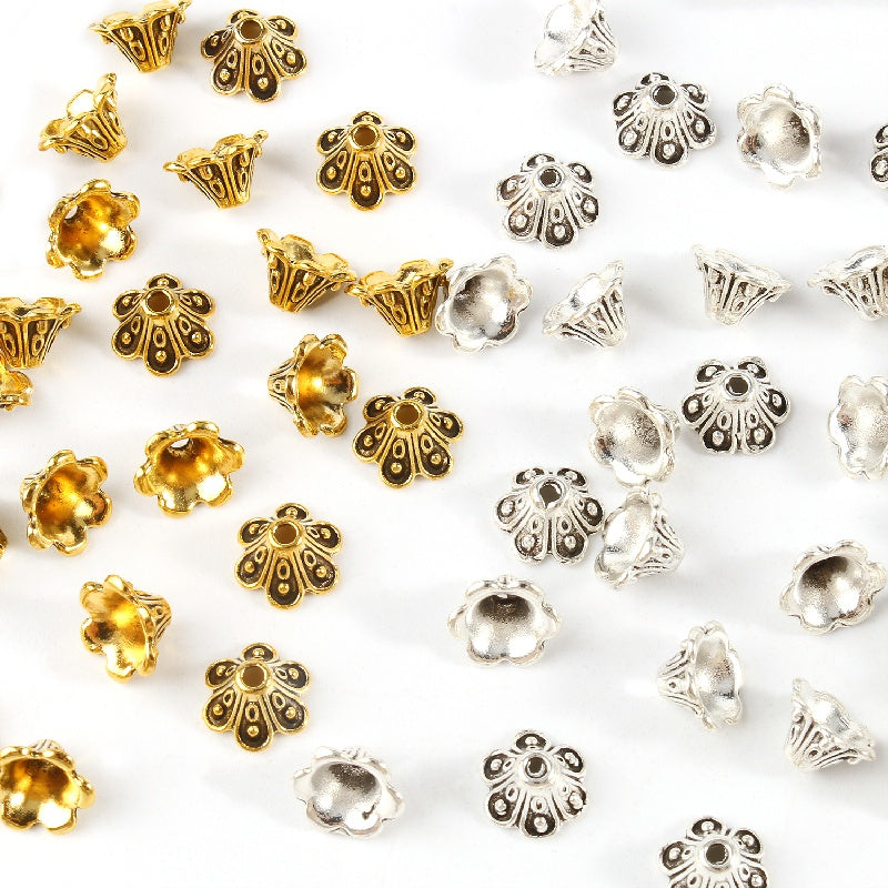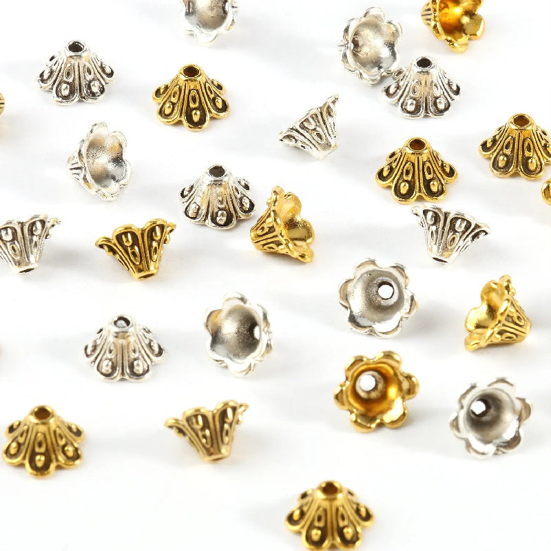 Get creative with these 50 antique golden and silver metal flower beads, perfect for jewelry making and needlework projects. Each bead measures 9x5mm.