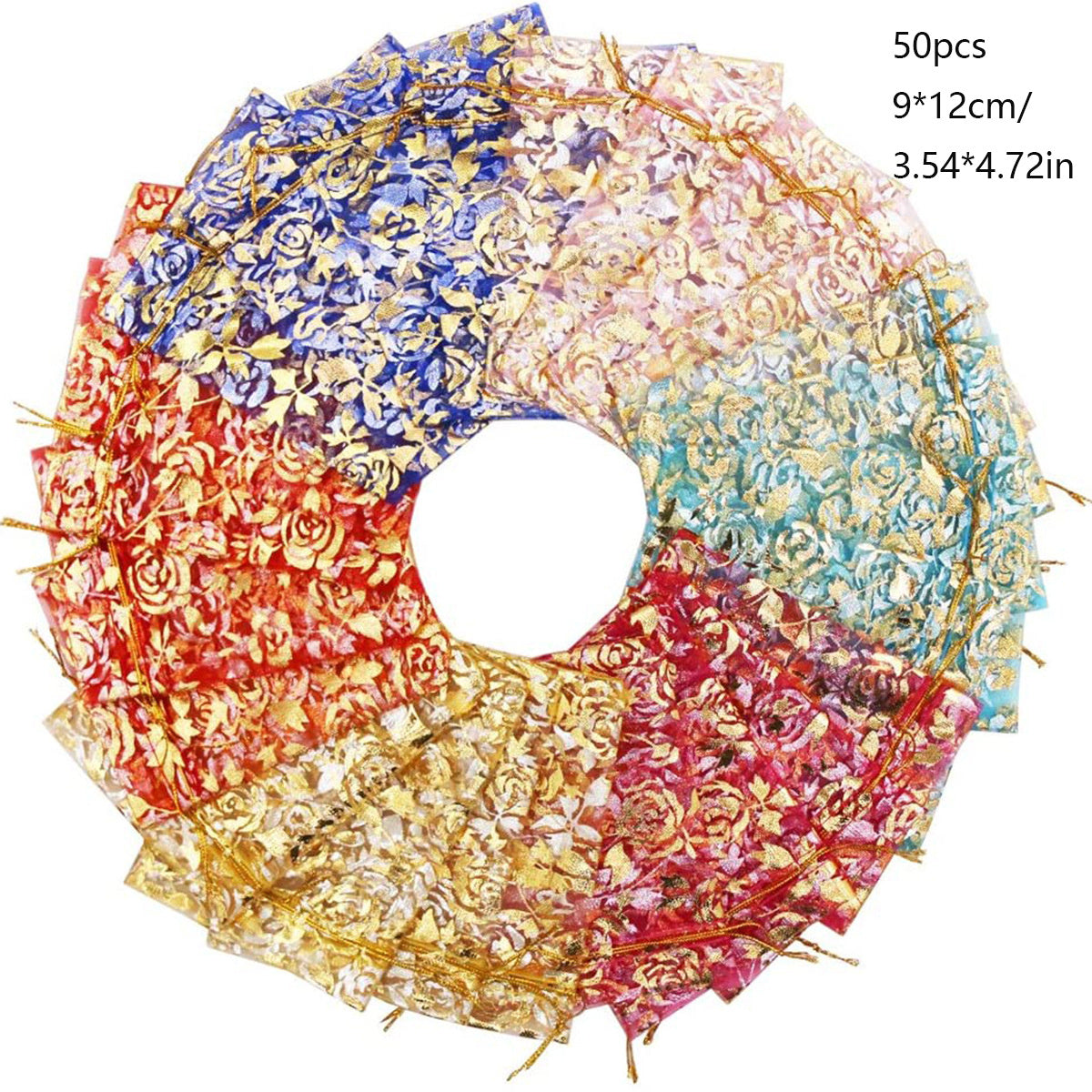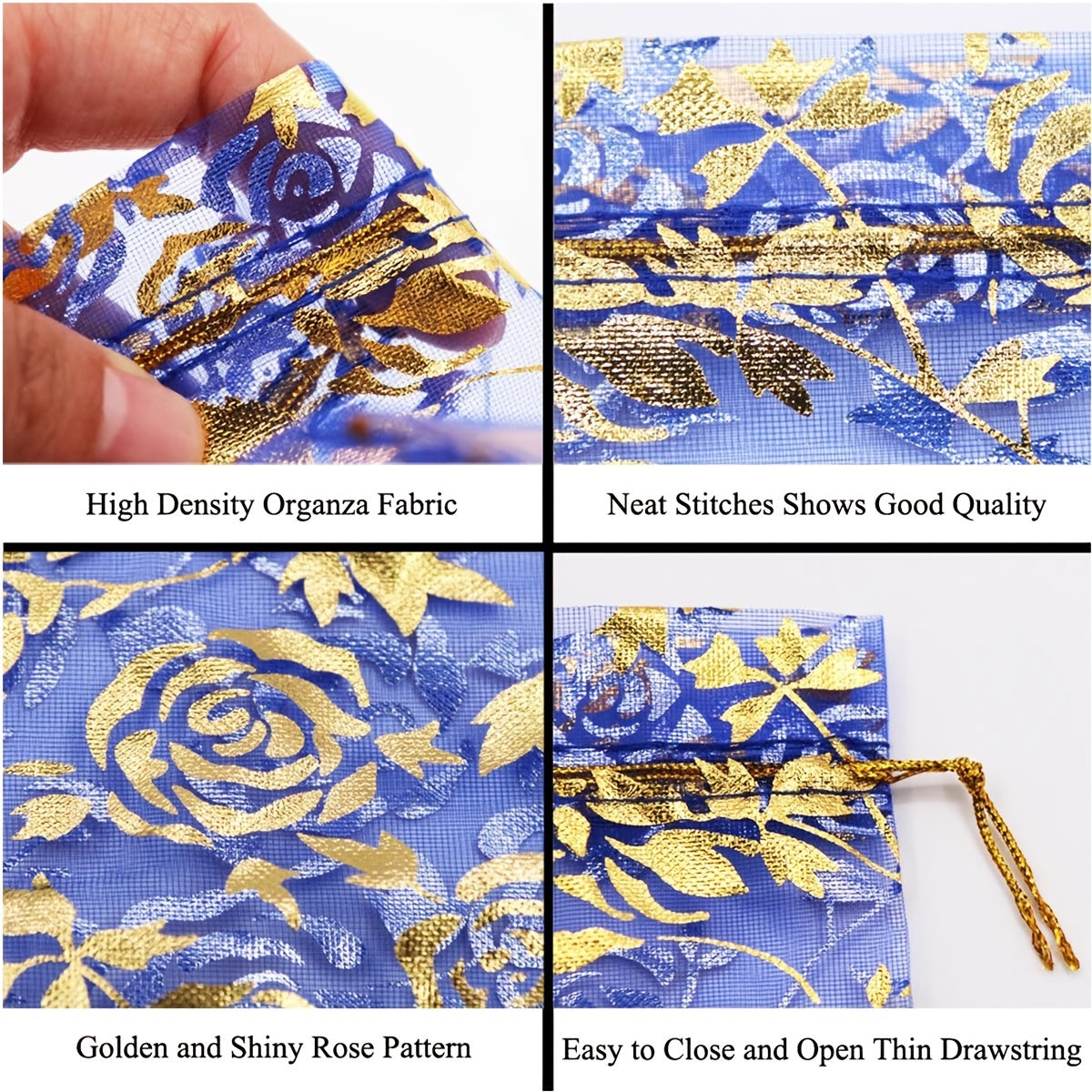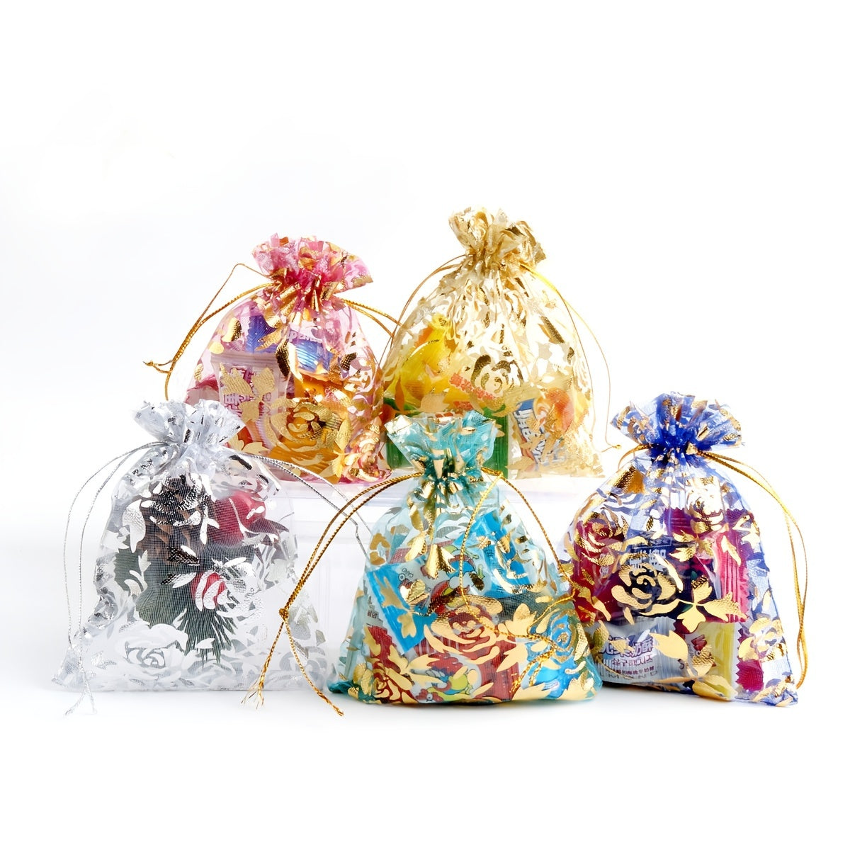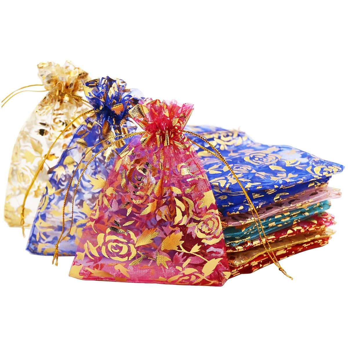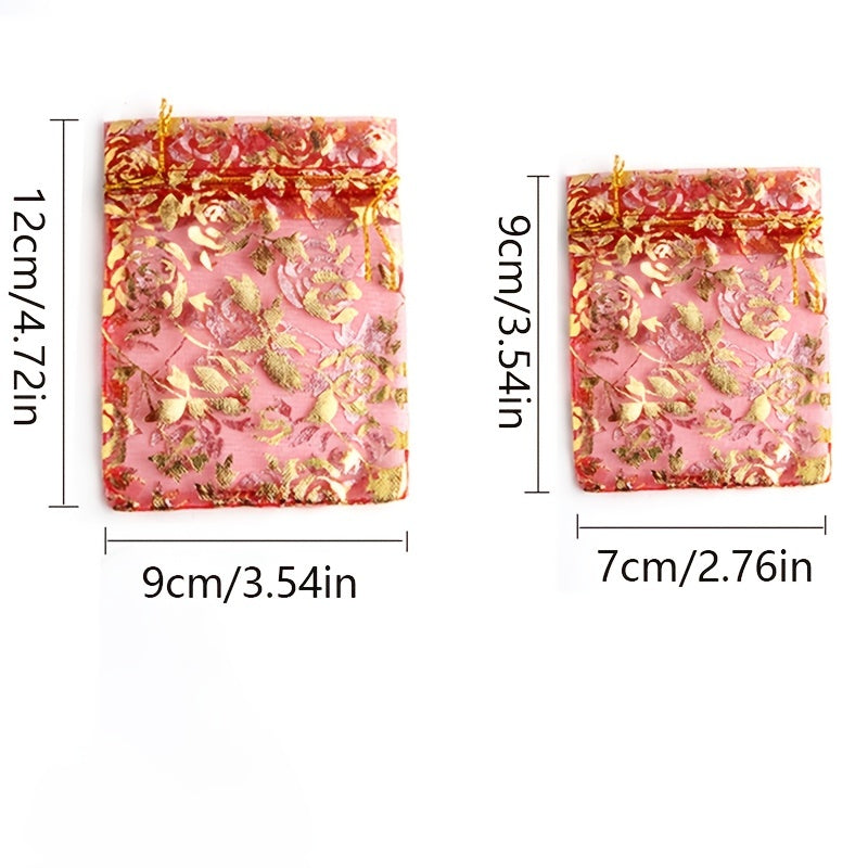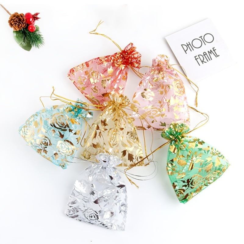 These organza bags are perfect for gift wrapping and decoration. They feature a bronzing rose yarn design that adds an elegant touch to any gift.