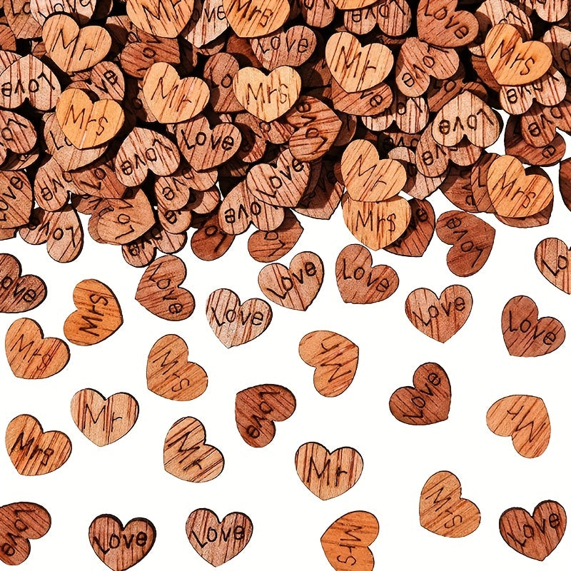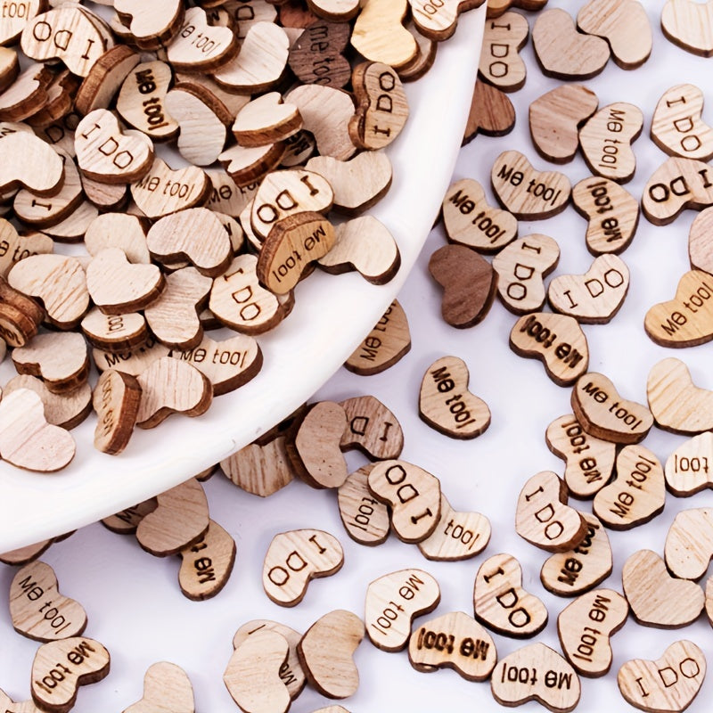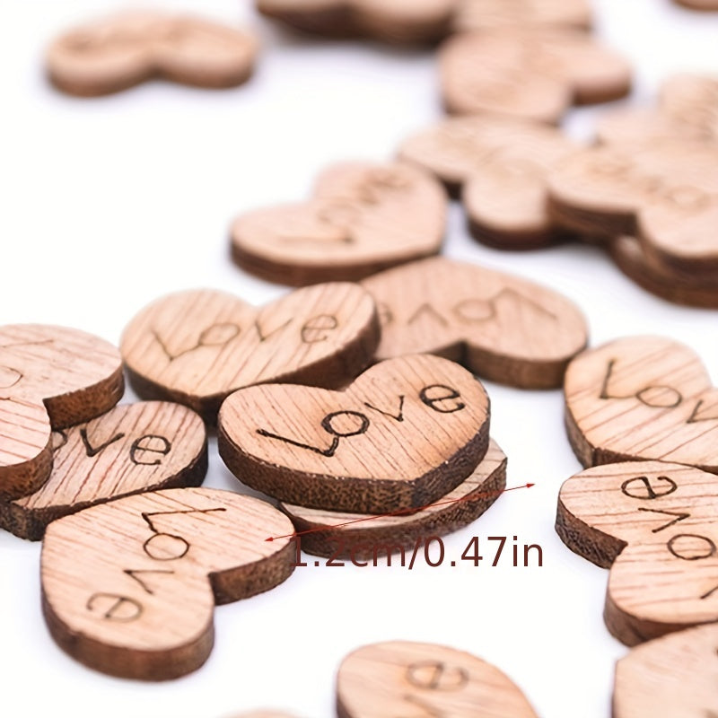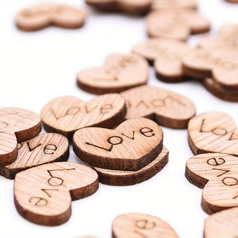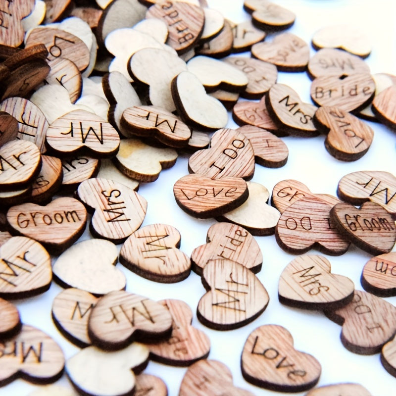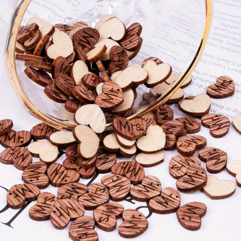 Add a charming touch to your wedding decor with these 50pcs wooden heart shape buttons featuring engraved letters. They are perfect as a couples gift or for DIY projects.