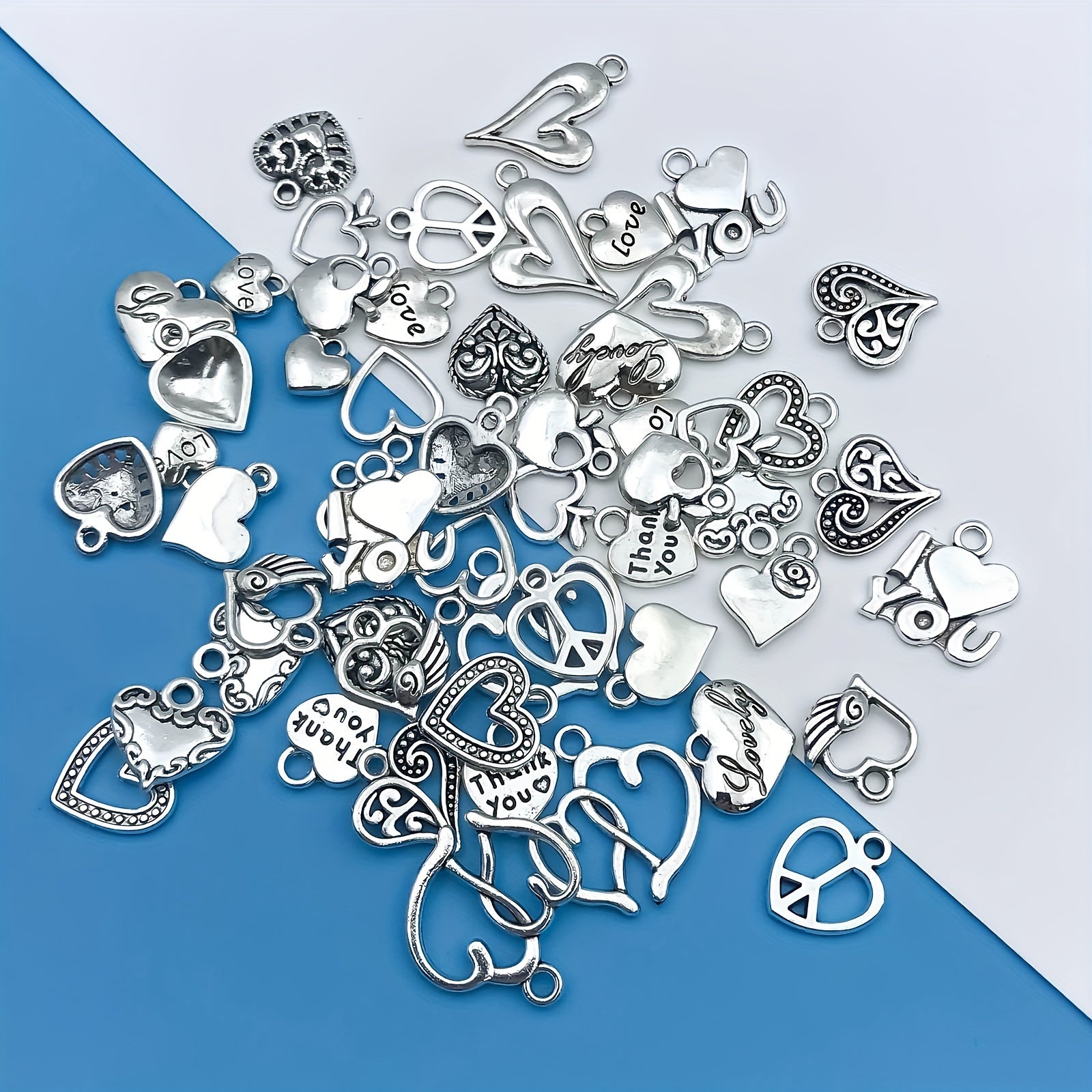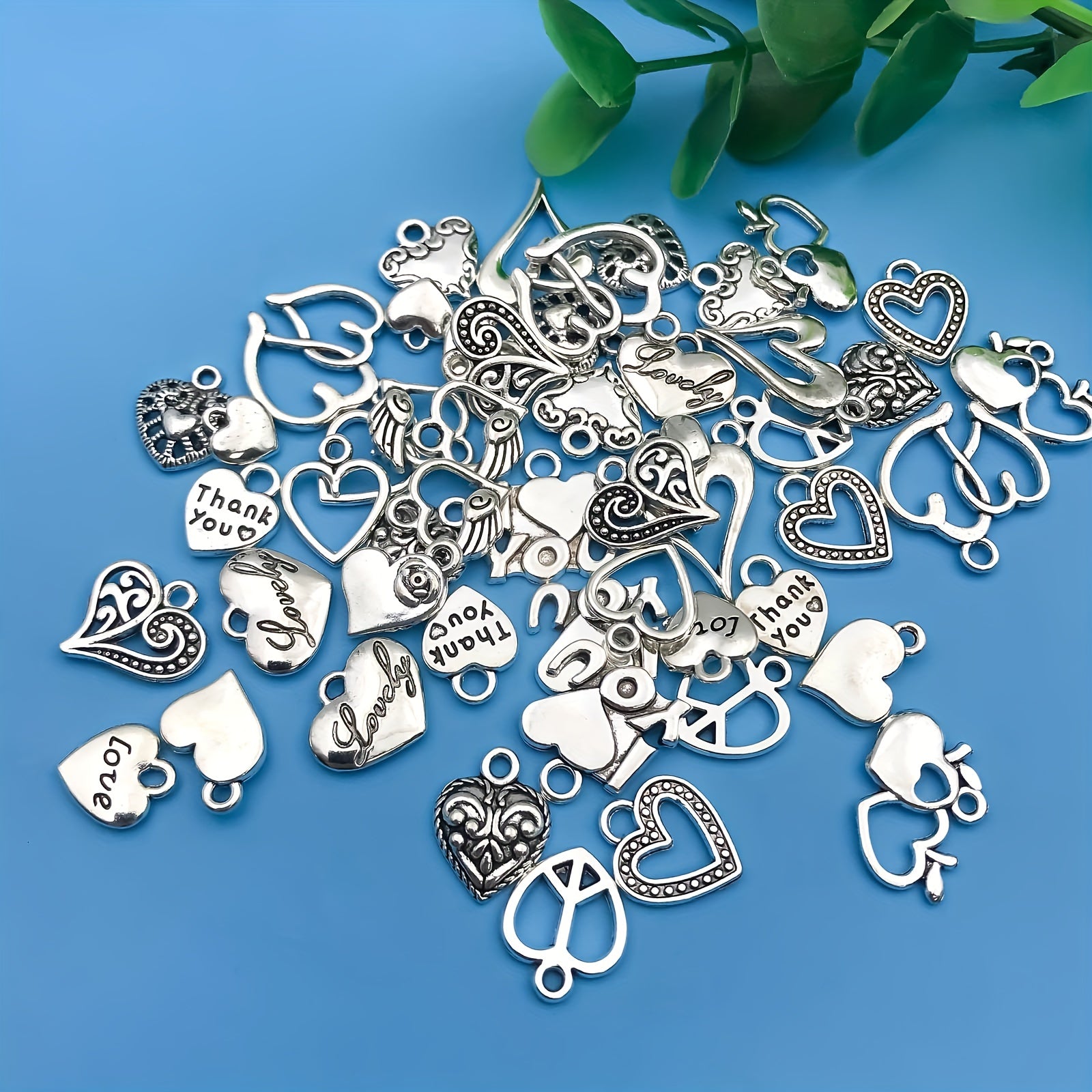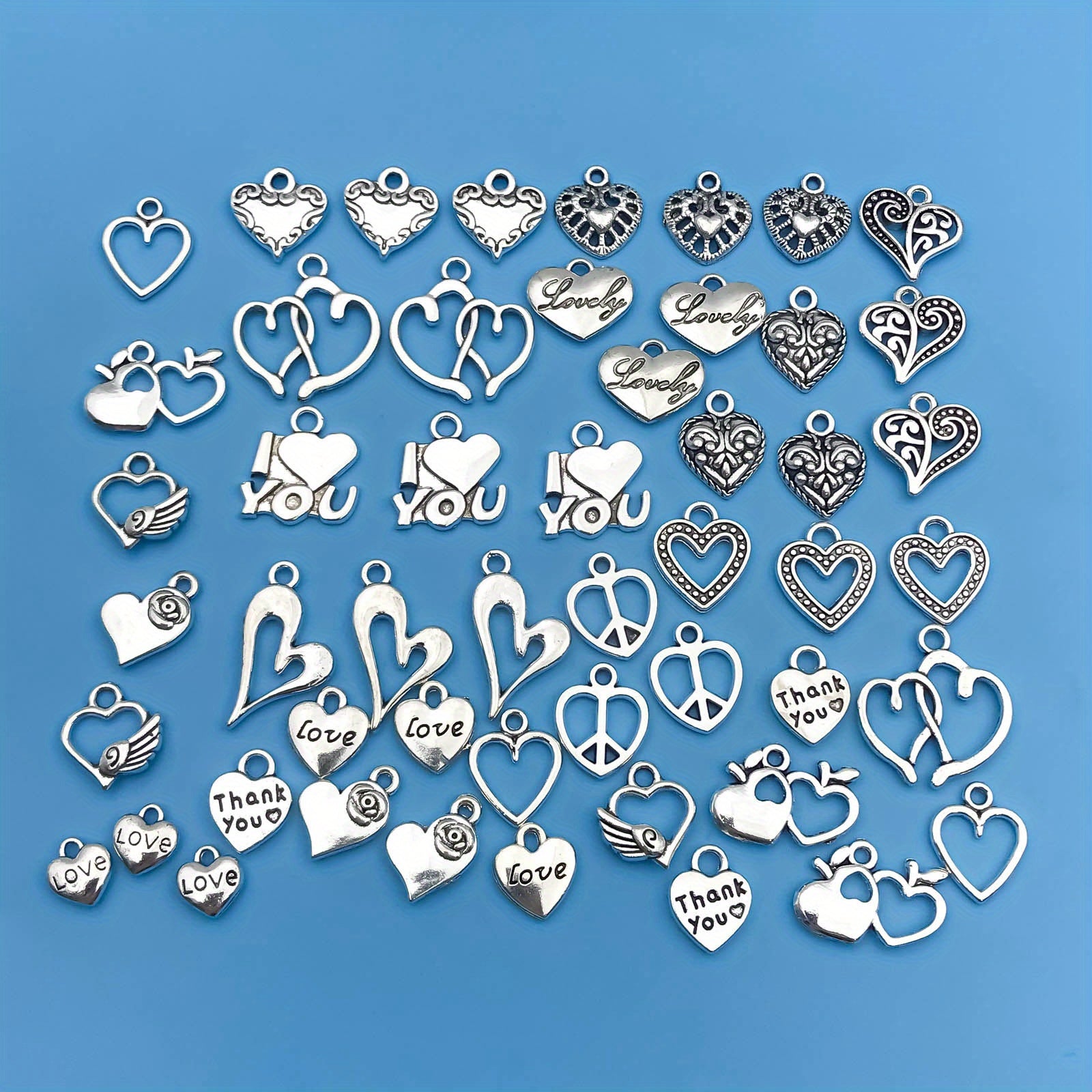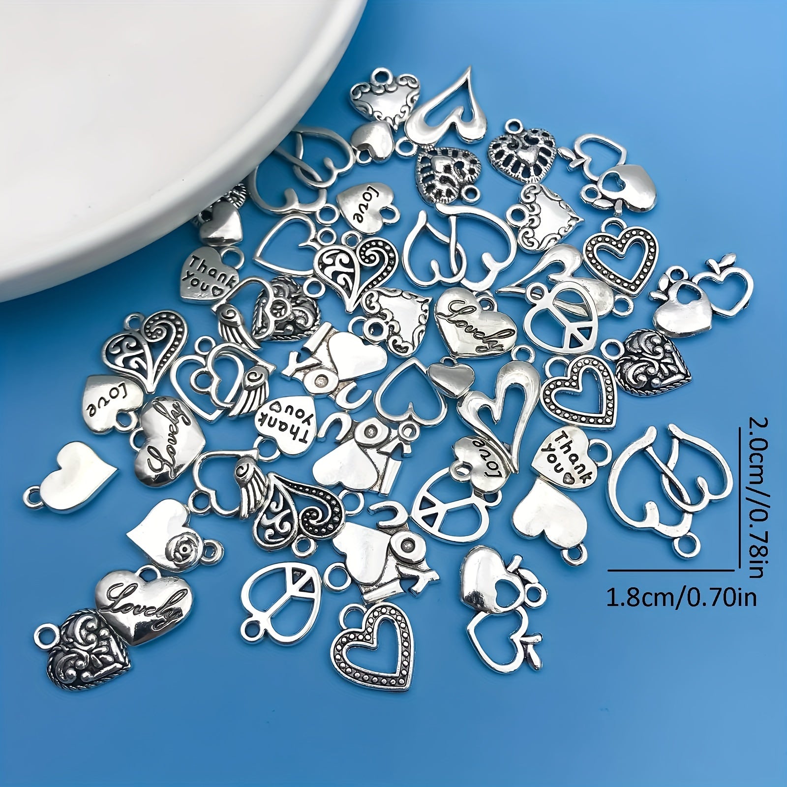 Create stunning jewelry with this set of 50 antique silver heart-shaped charms. Perfect for necklaces, bracelets, and earrings. These charms are made of zinc alloy and are great for DIY projects.