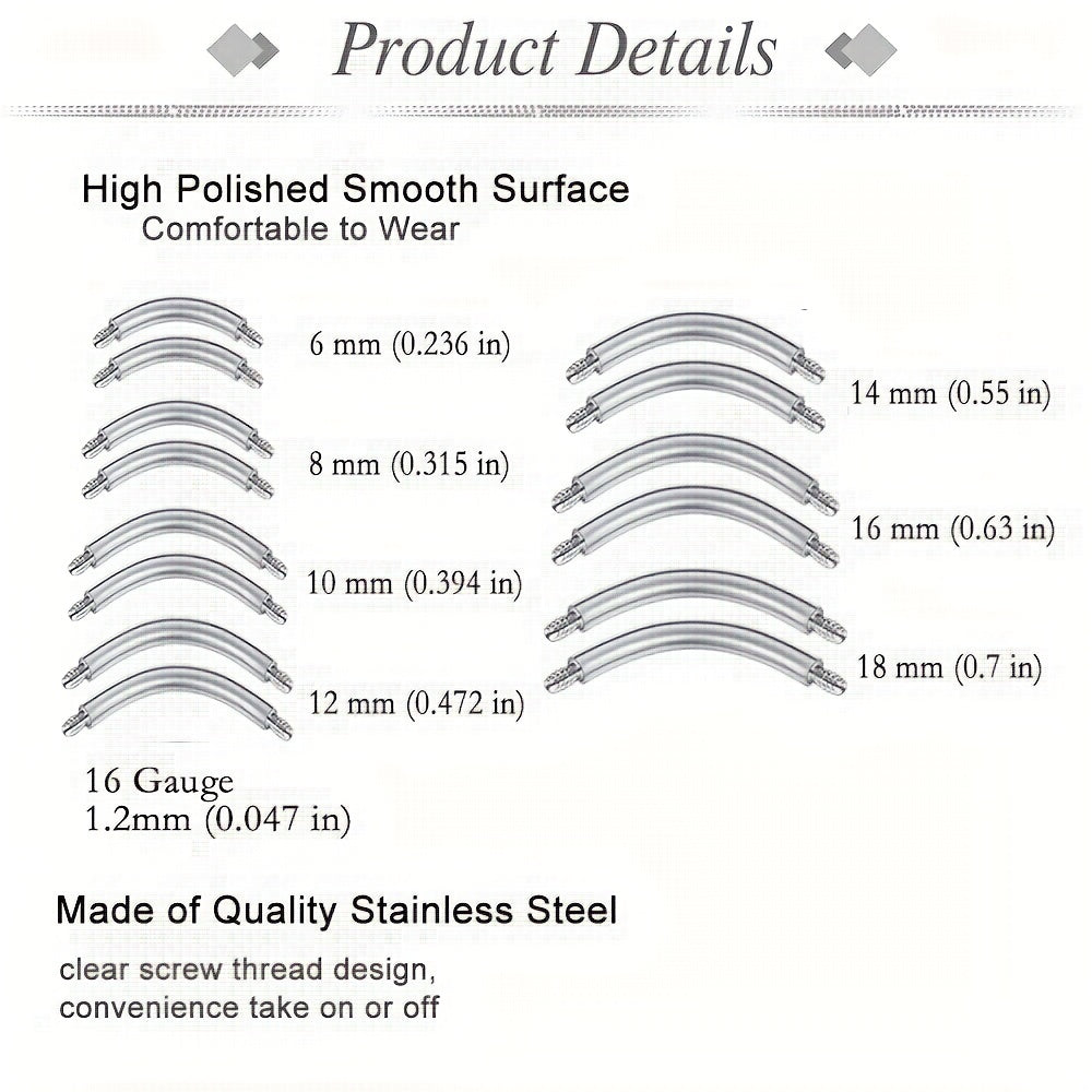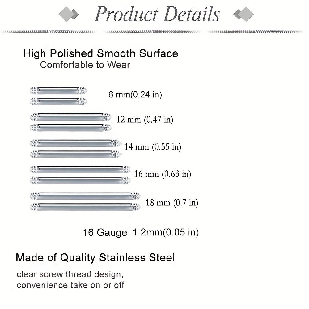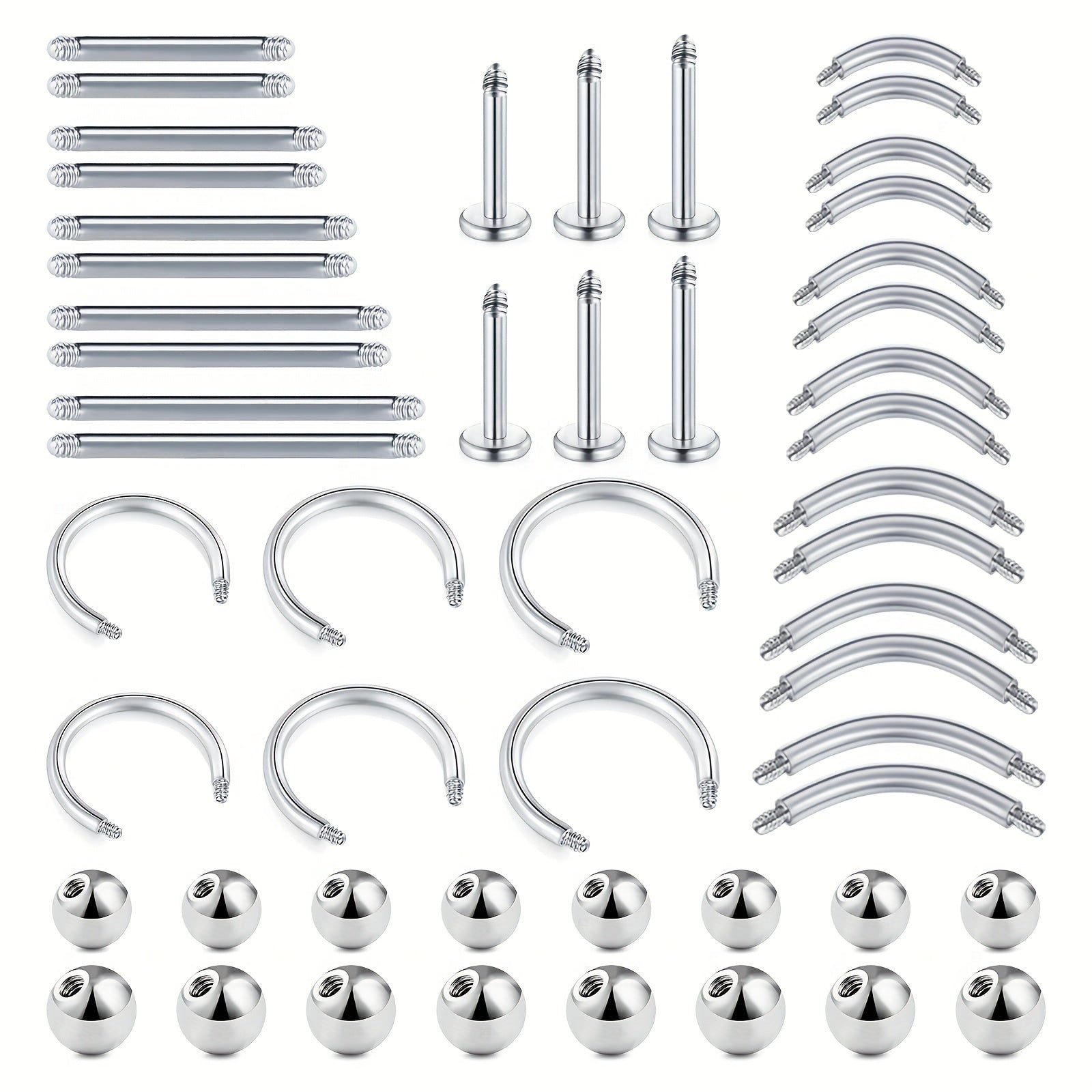 Complete set for various piercings like belly, tongue, septum, eyebrow, lip, etc. Made of high-quality stainless steel. Includes 52 pieces of 16G rods and piercing balls.