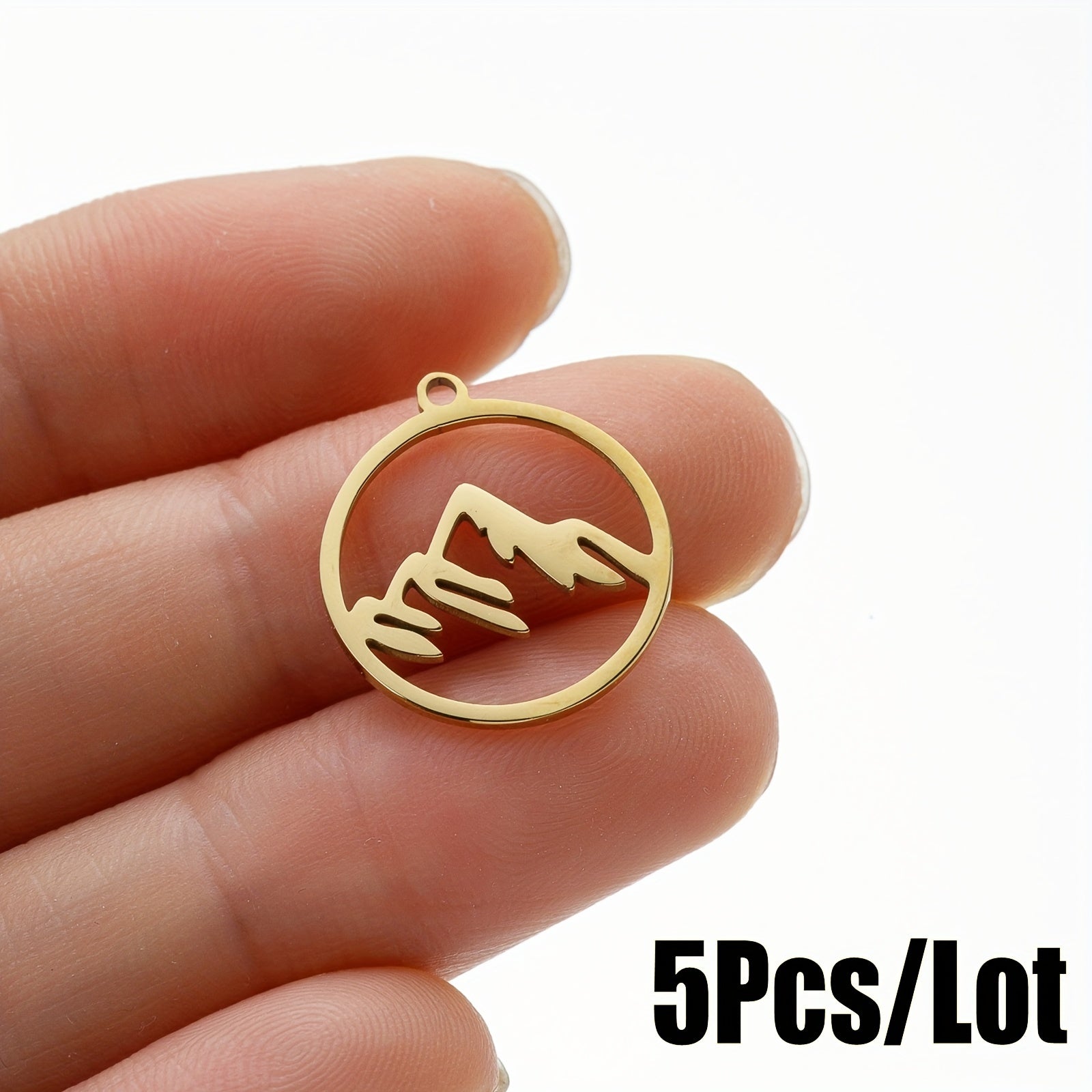 Enhance your jewelry making with this set of 5 stainless steel pendants. These silvery golden hollow mountain round pendants are perfect for creating earrings, bracelets, necklaces, and other accessories.