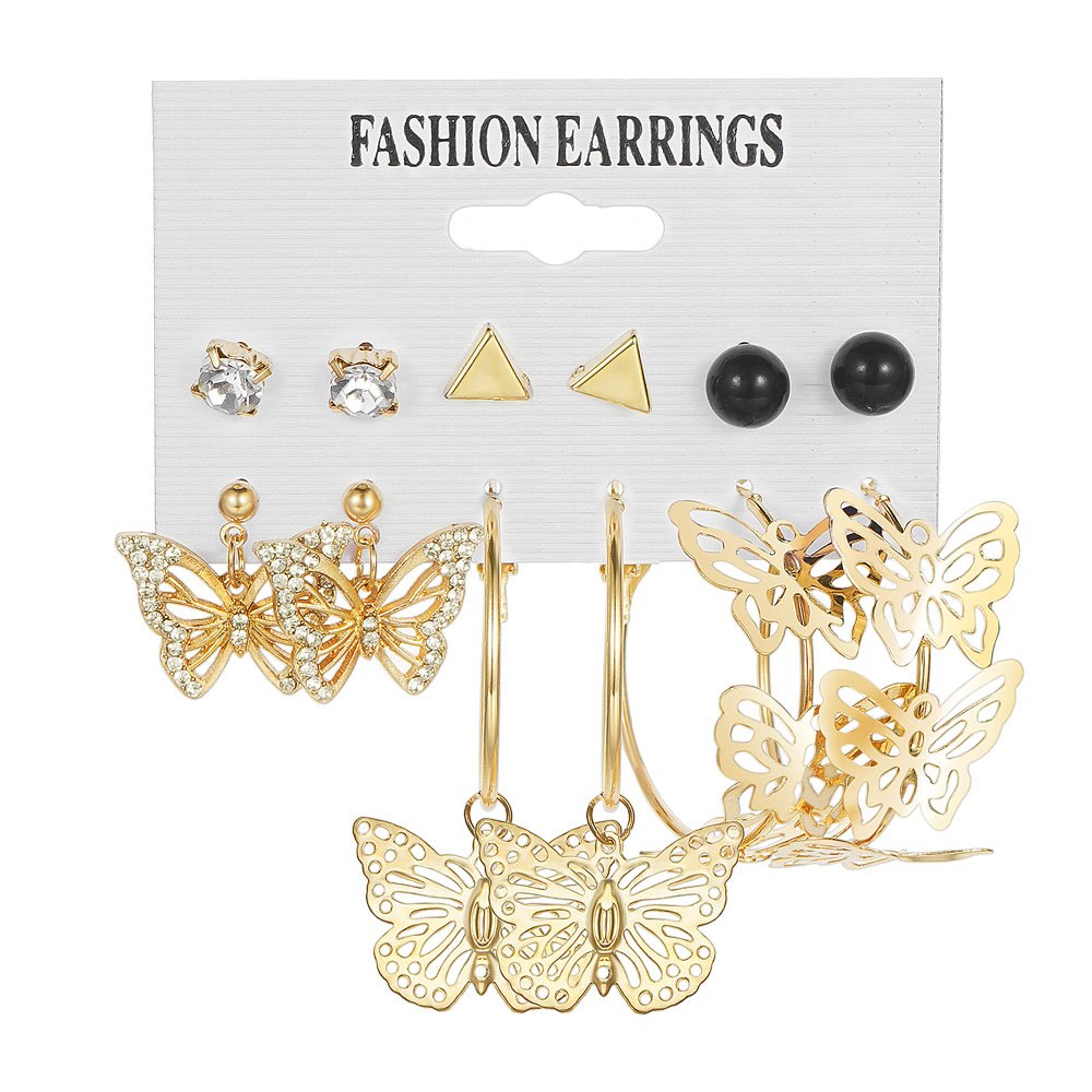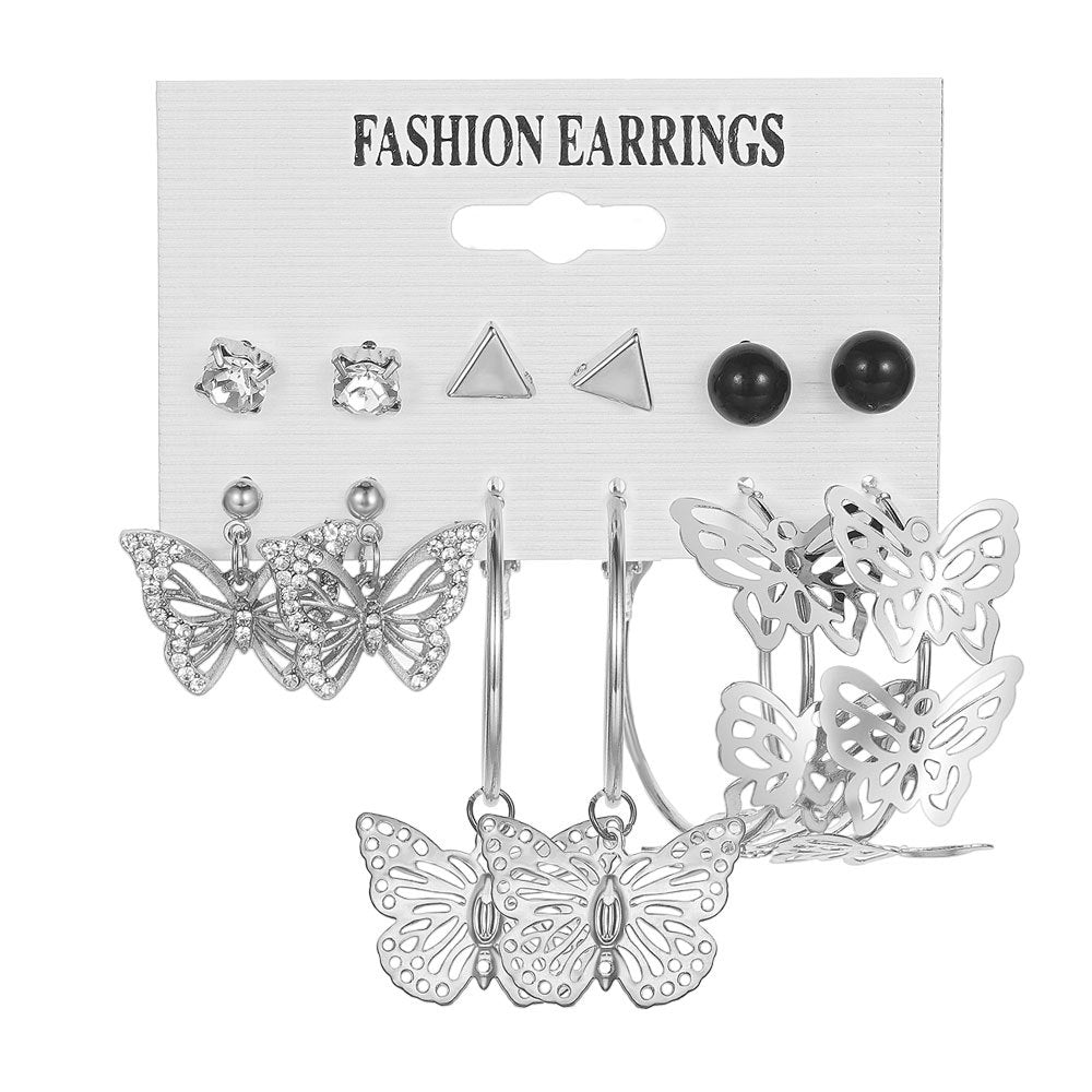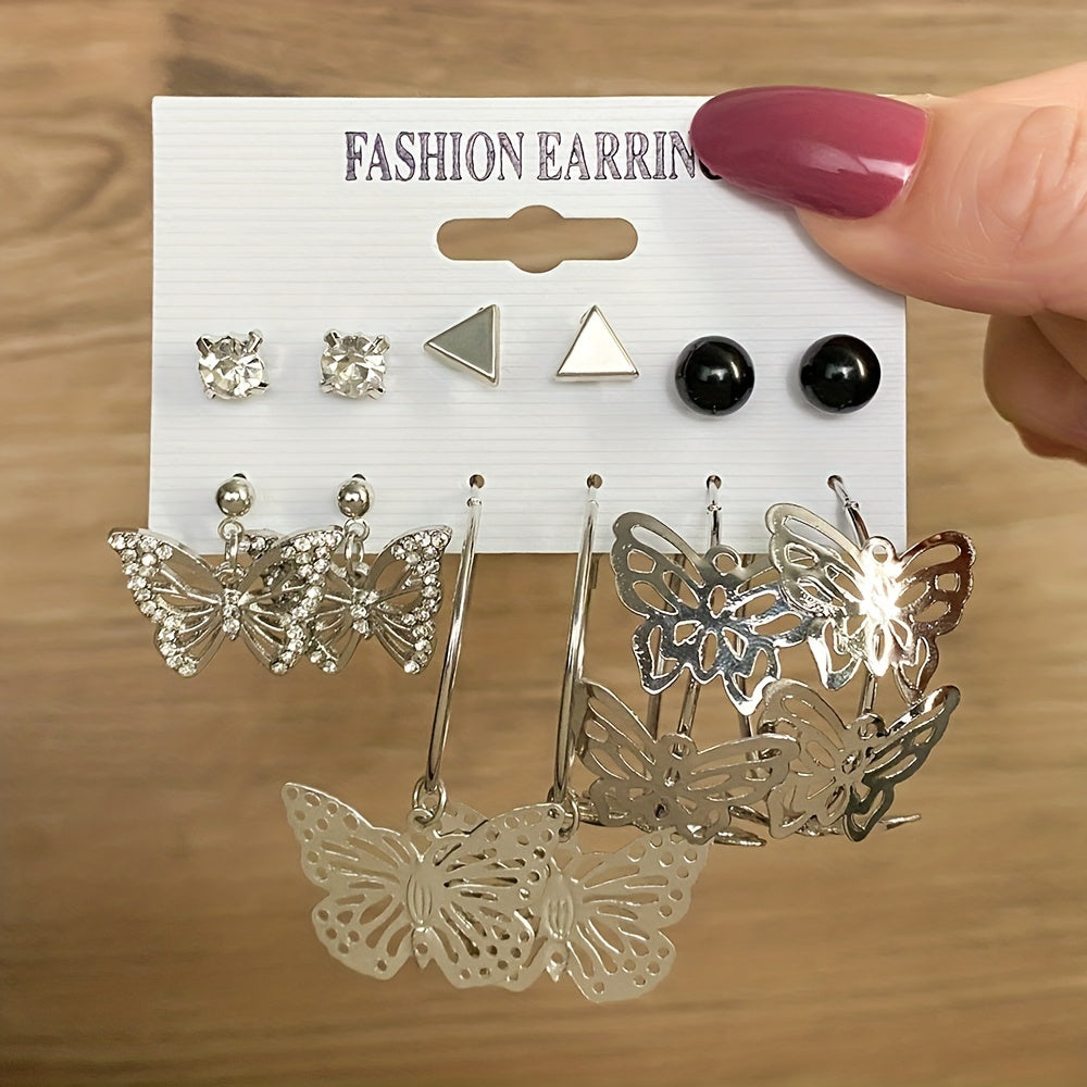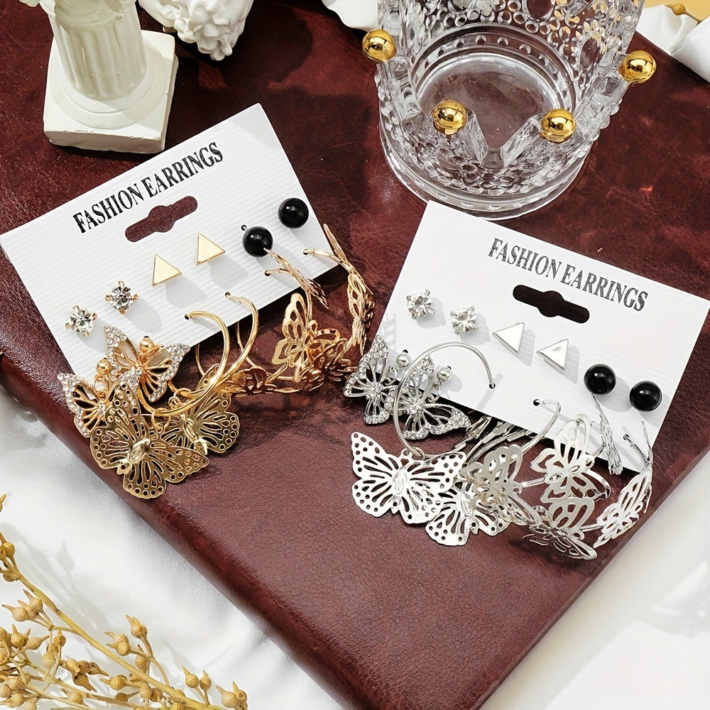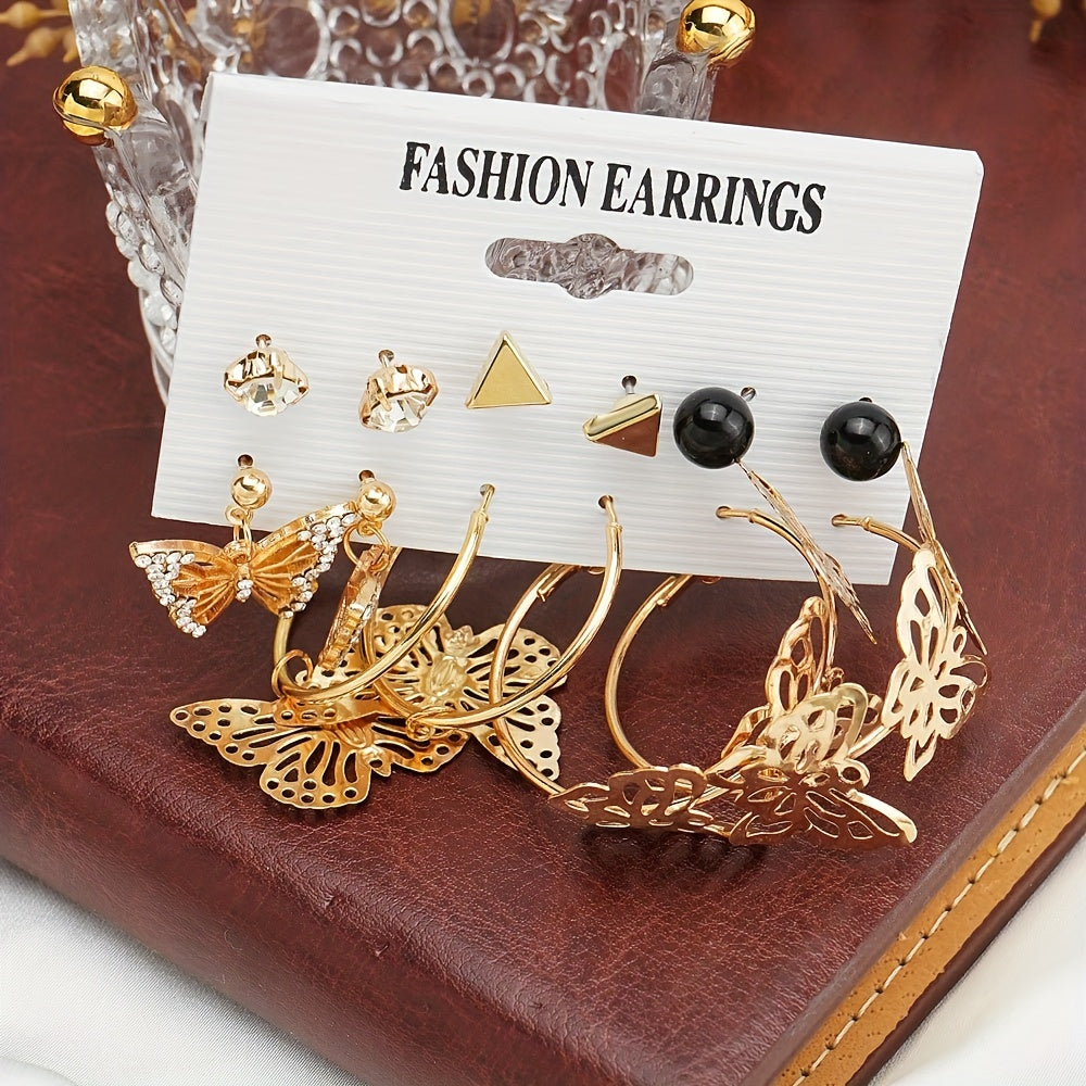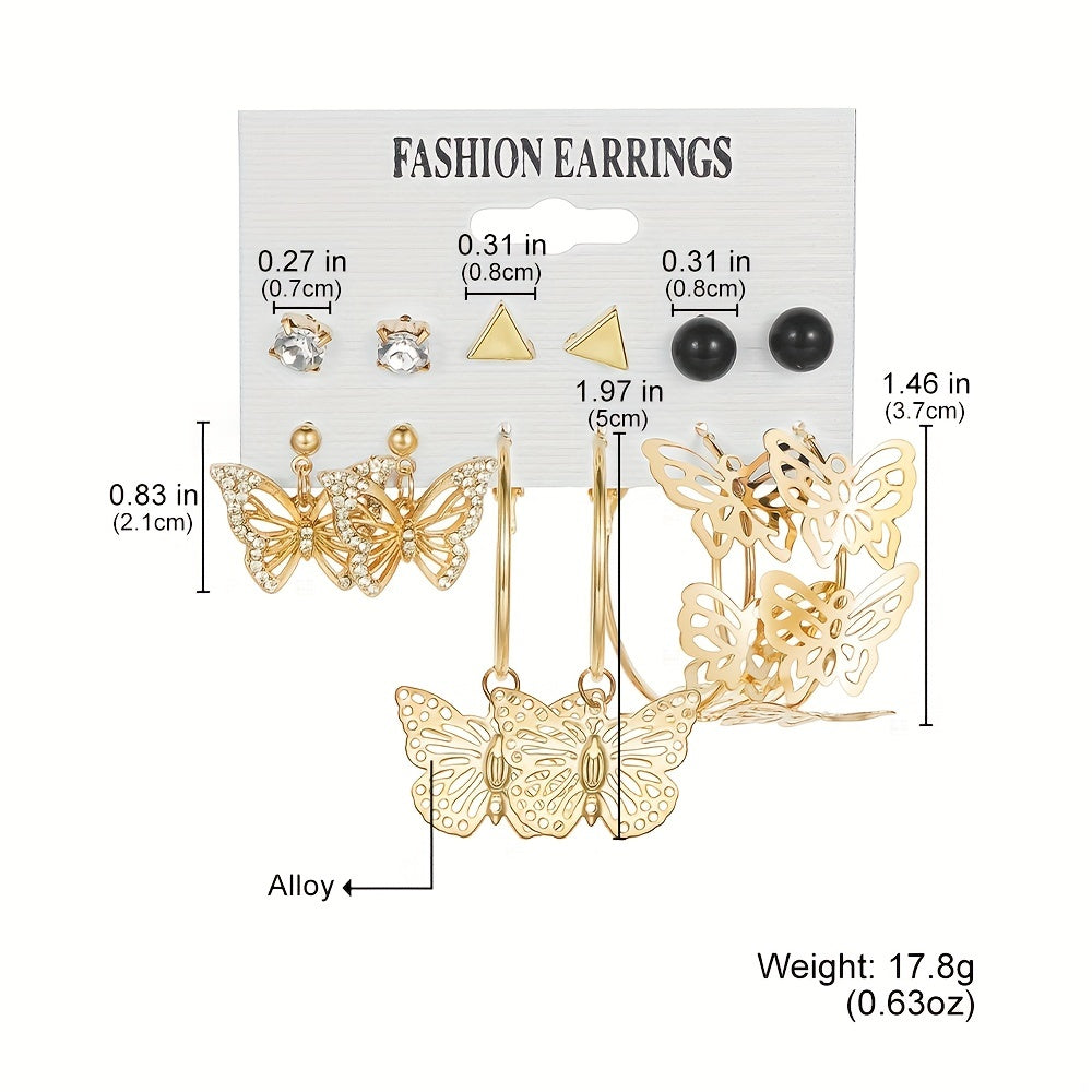 This set includes 6 pairs of stud and hoop earrings with butterfly decor, featuring a retro style alloy design. It makes a delicate and stylish gift for women.