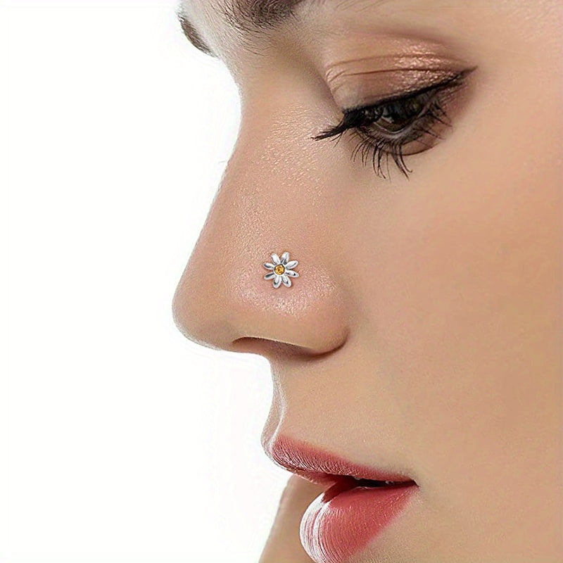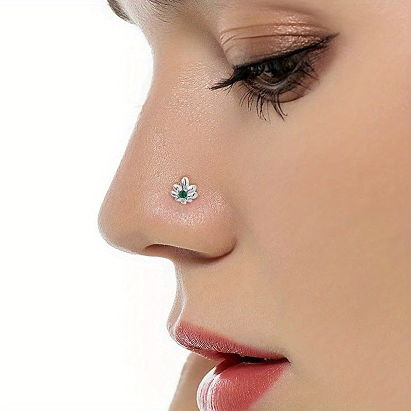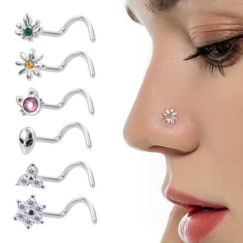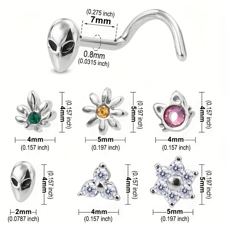 This set includes 6 nose rings with CZ inlaid screws. Made of stainless steel, these nose stud rings are suitable for women and come in various shapes like cat, alien, flower, and leaf.