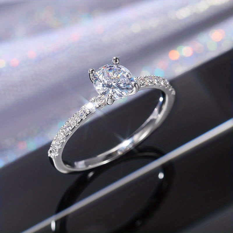 This stunning engagement ring features an artificial diamond set in a rose gold plated band adorned with zircon stones. The perfect proposal ring for a special moment.