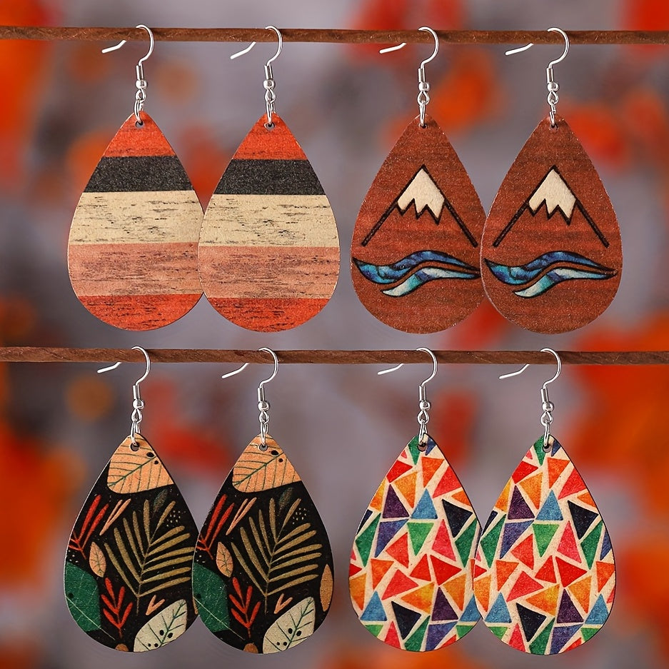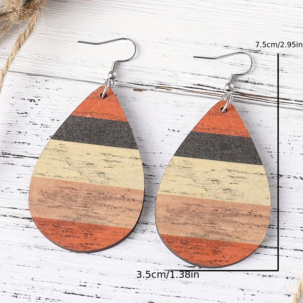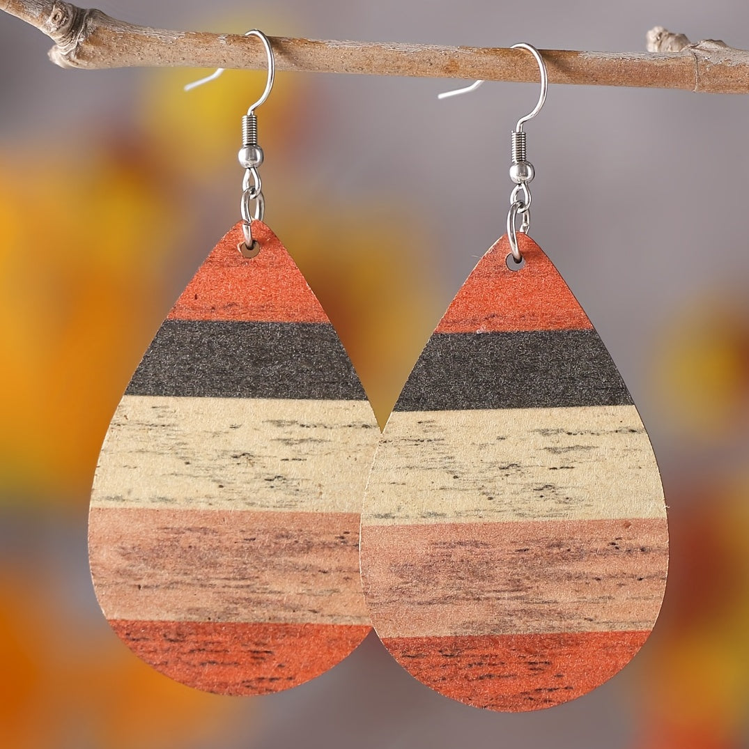 Bohemia Striped Abstract Leaf Wooden Dangle Earrings