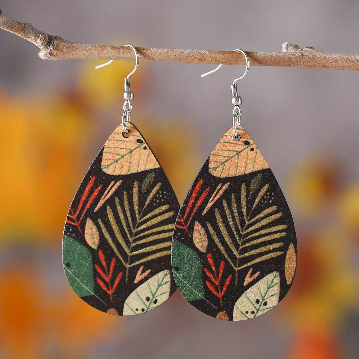 Add a touch of bohemian style to your outfit with these unique double sided earrings featuring an ethnic striped abstract painting and leaf design.
