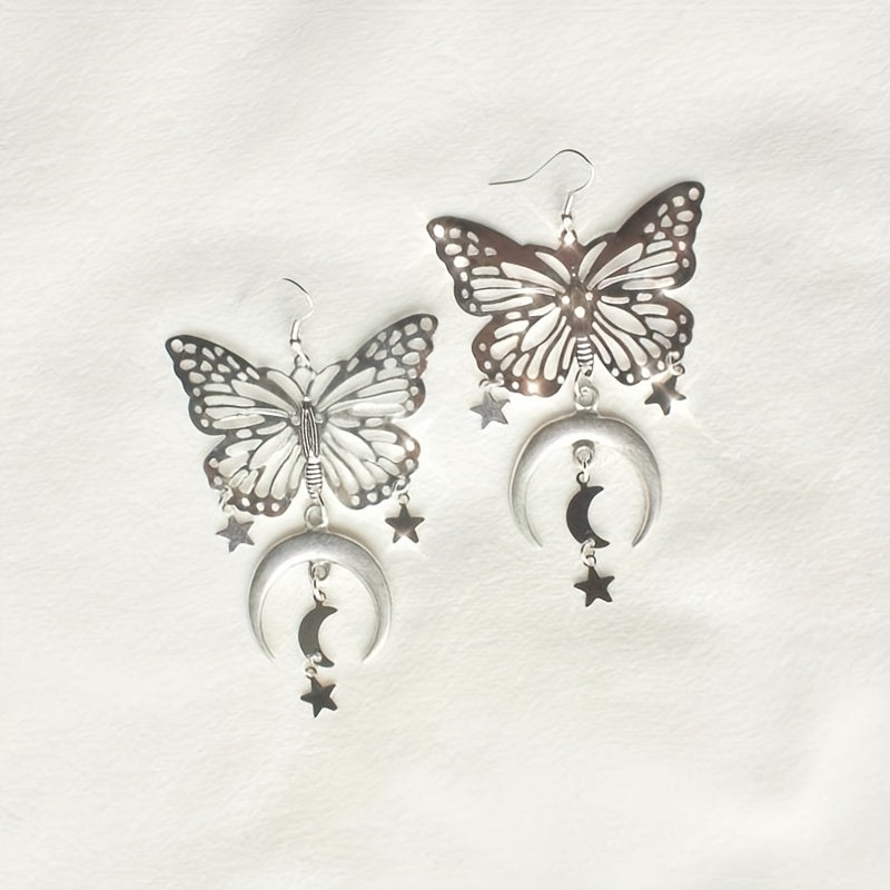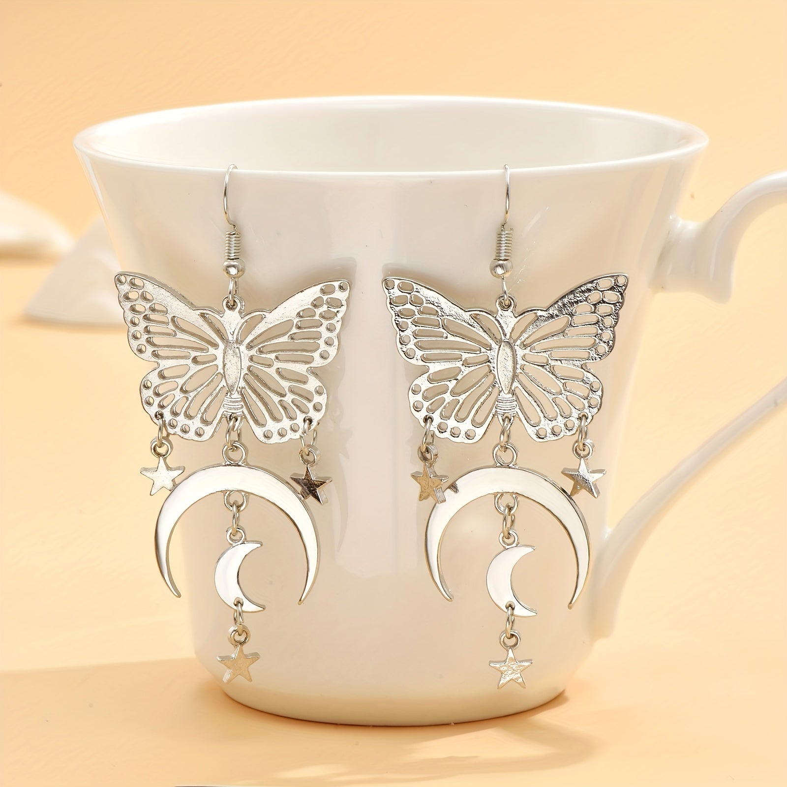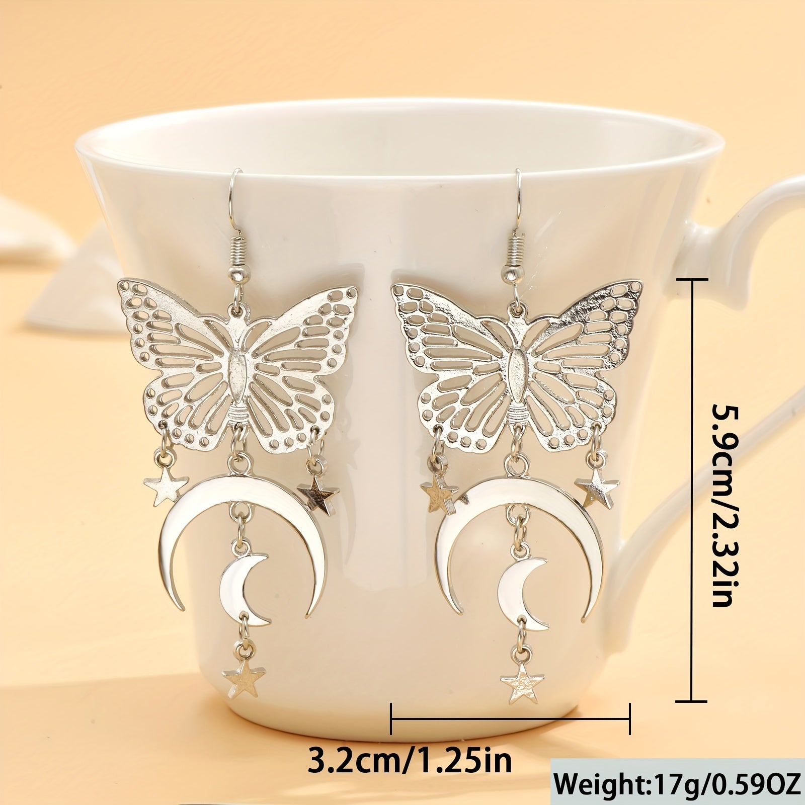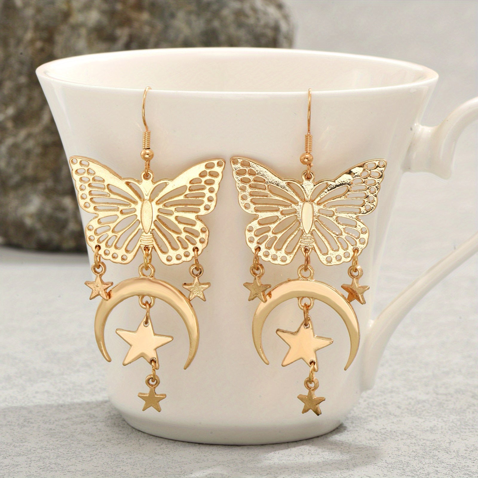Add a touch of bohemian charm to your look with these golden dangle earrings featuring intricate star, moon, and butterfly designs. Perfect for parties or as a stylish everyday accessory.