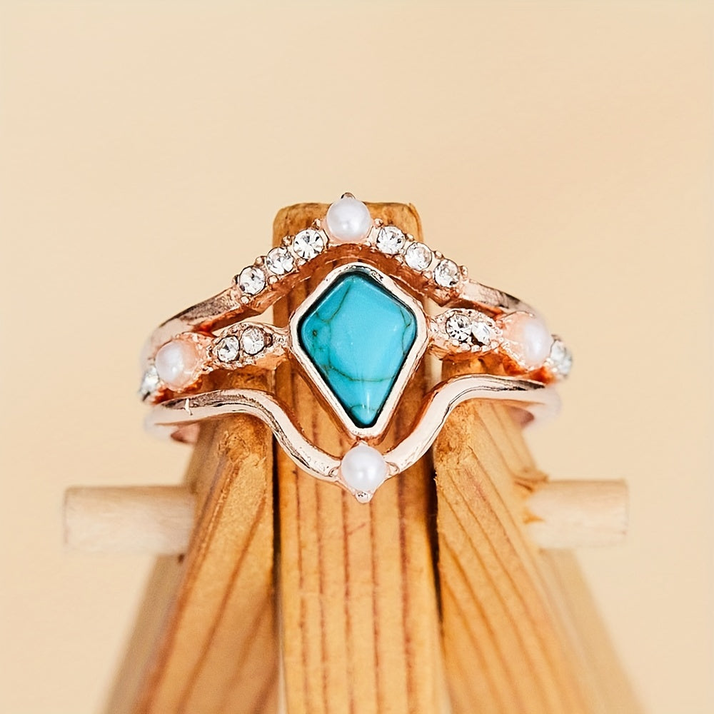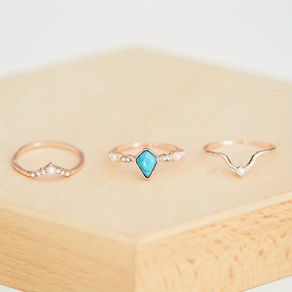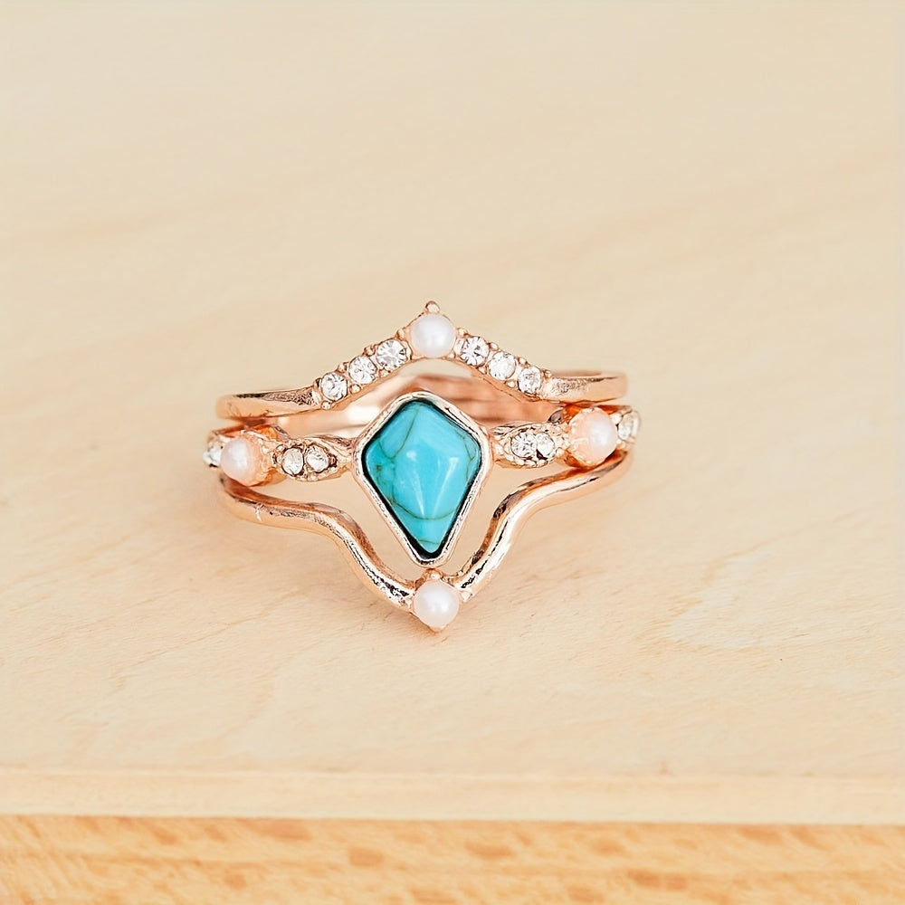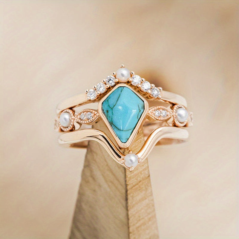 Add a touch of bohemian charm to your look with this set of 3 stacking rings featuring inlaid turquoise. Perfect for daily wear, special occasions, and as a thoughtful gift for your loved one.