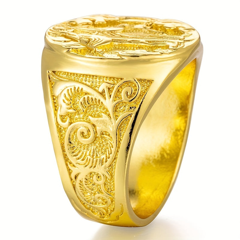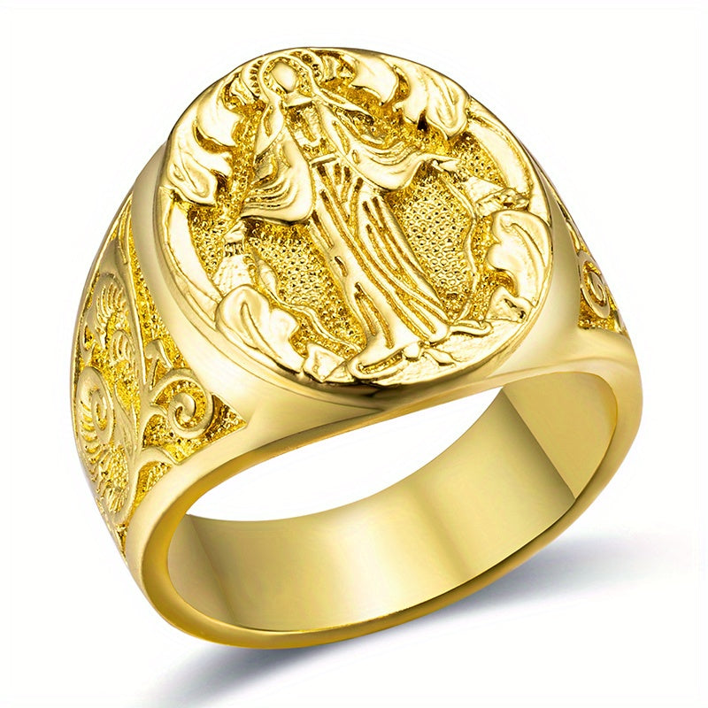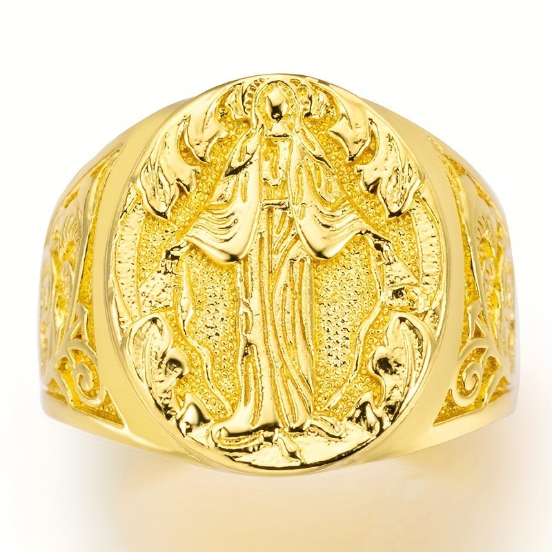 This casual ring for men features a golden design with a carved religious St Mary pattern. Suitable for both men and women, this ring adds a touch of elegance to any outfit.