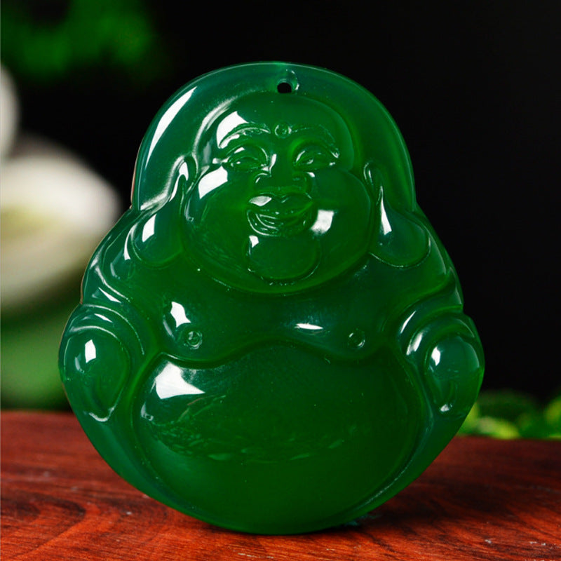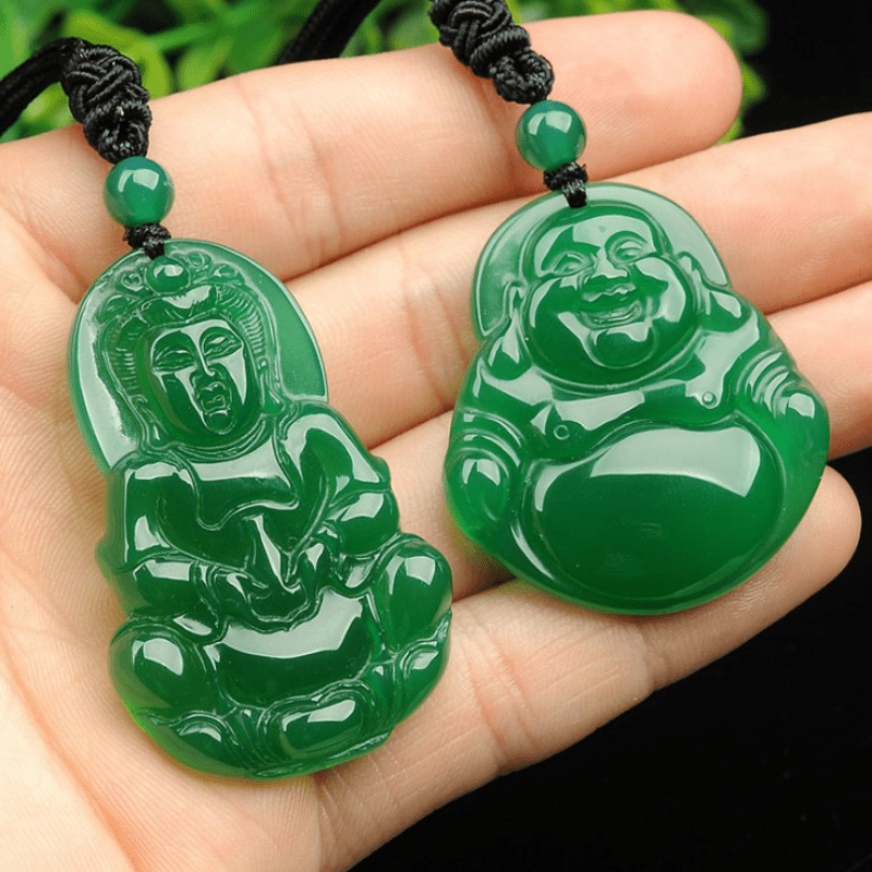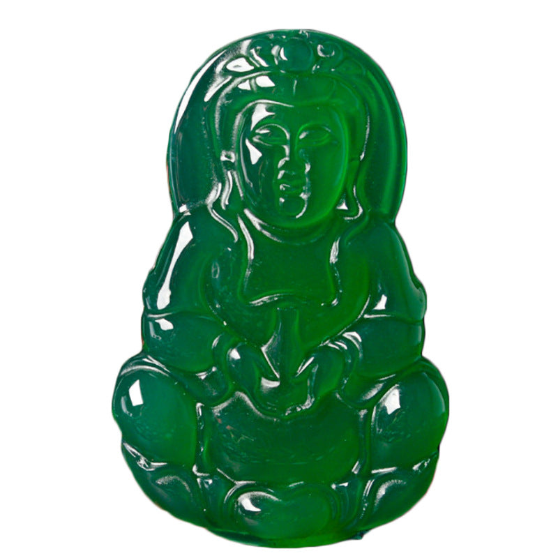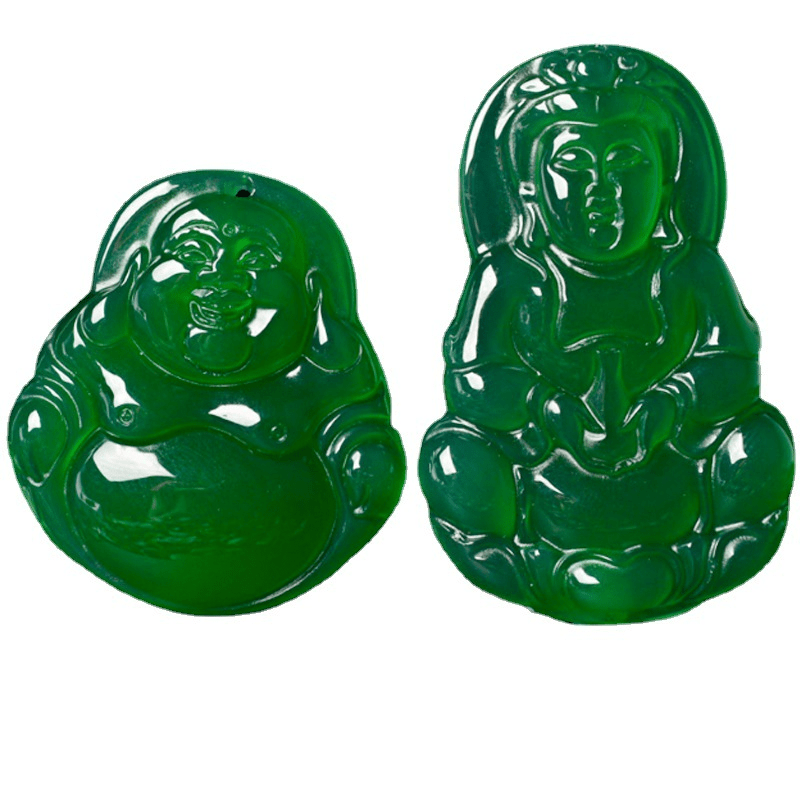 This exquisite set features a large green chalcedony Guanyin and Buddha couple statue. The green chalcedony stone adds a touch of elegance to any space.