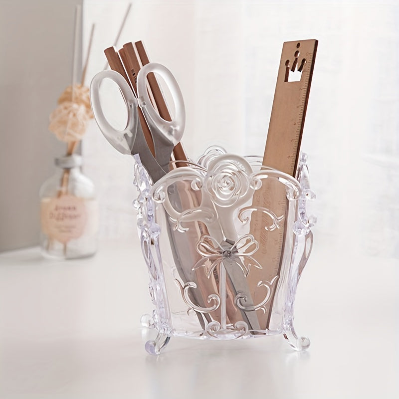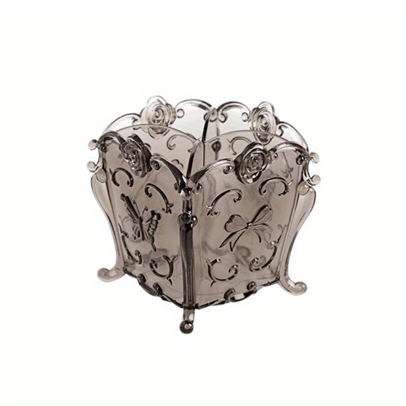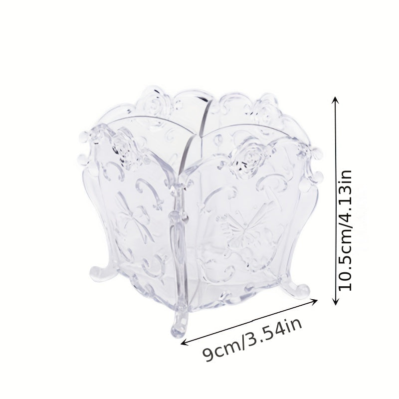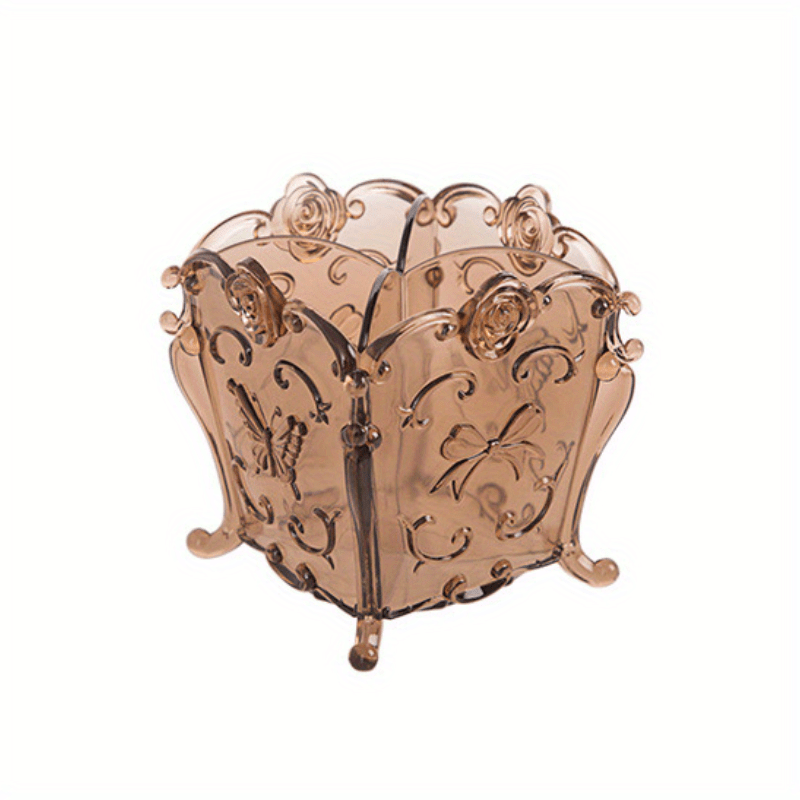Keep your makeup brushes organized and easily accessible with this lattice carved makeup brush organizer box. Made of durable plastic, this desktop storage canister adds a touch of elegance to your vanity or dressing table.