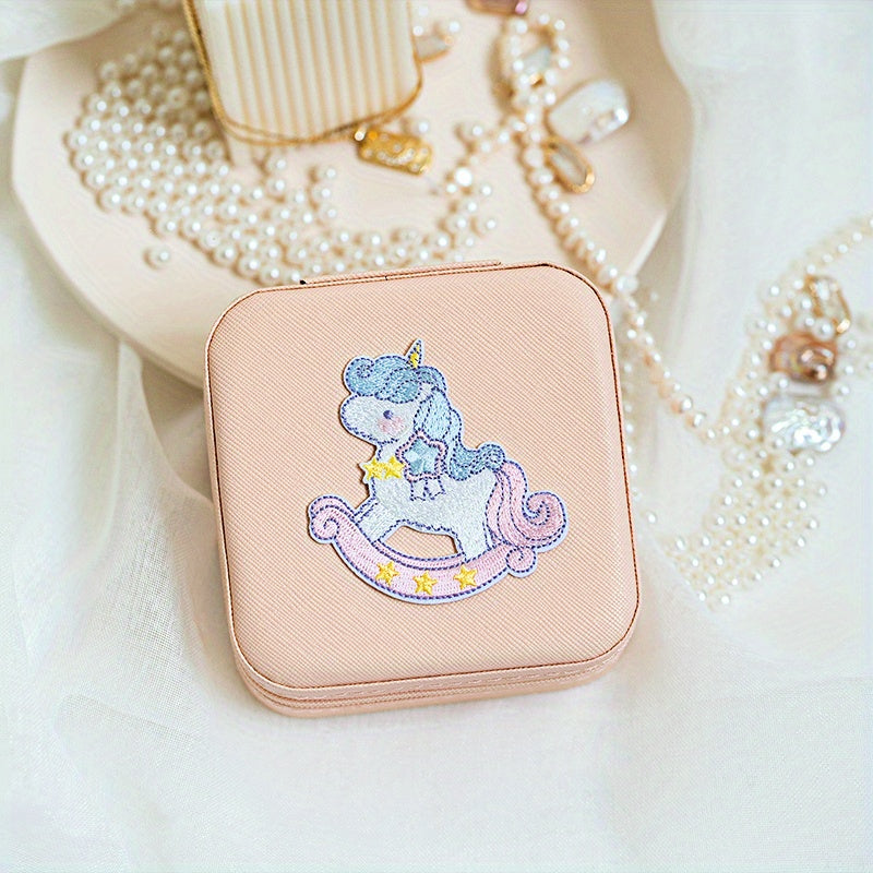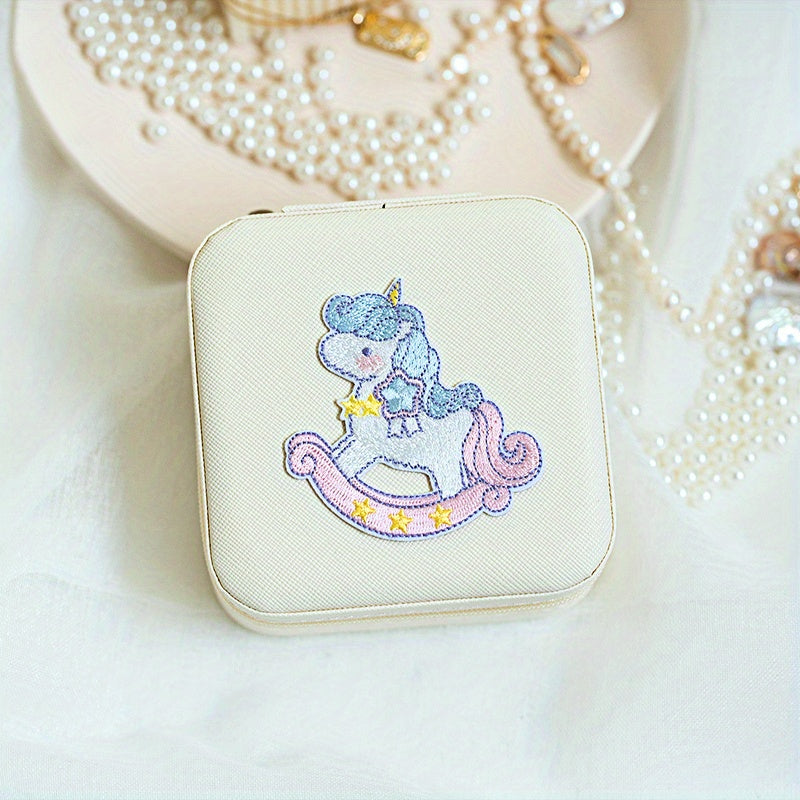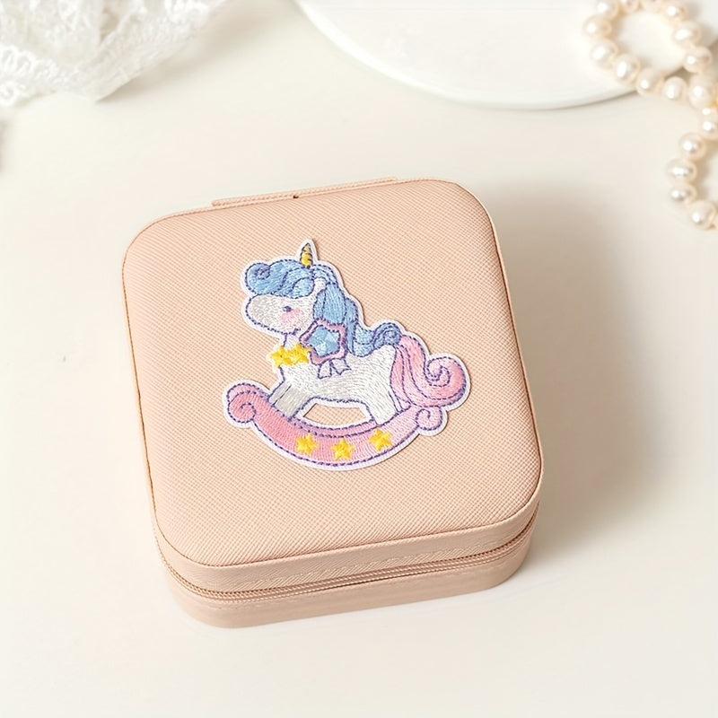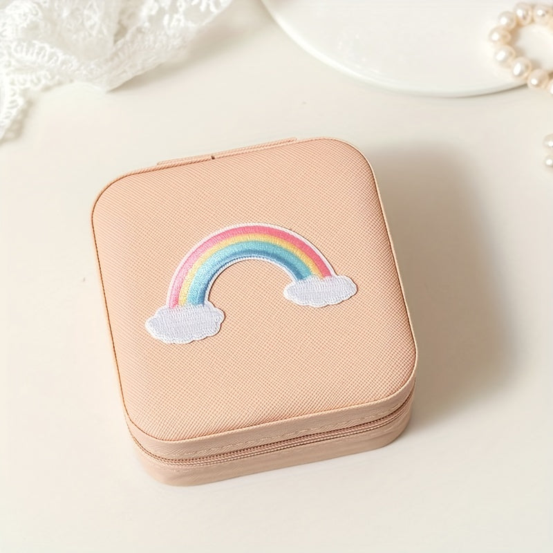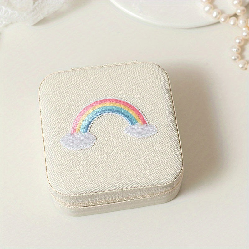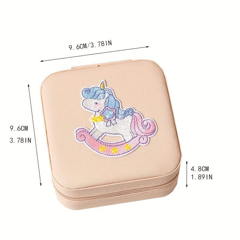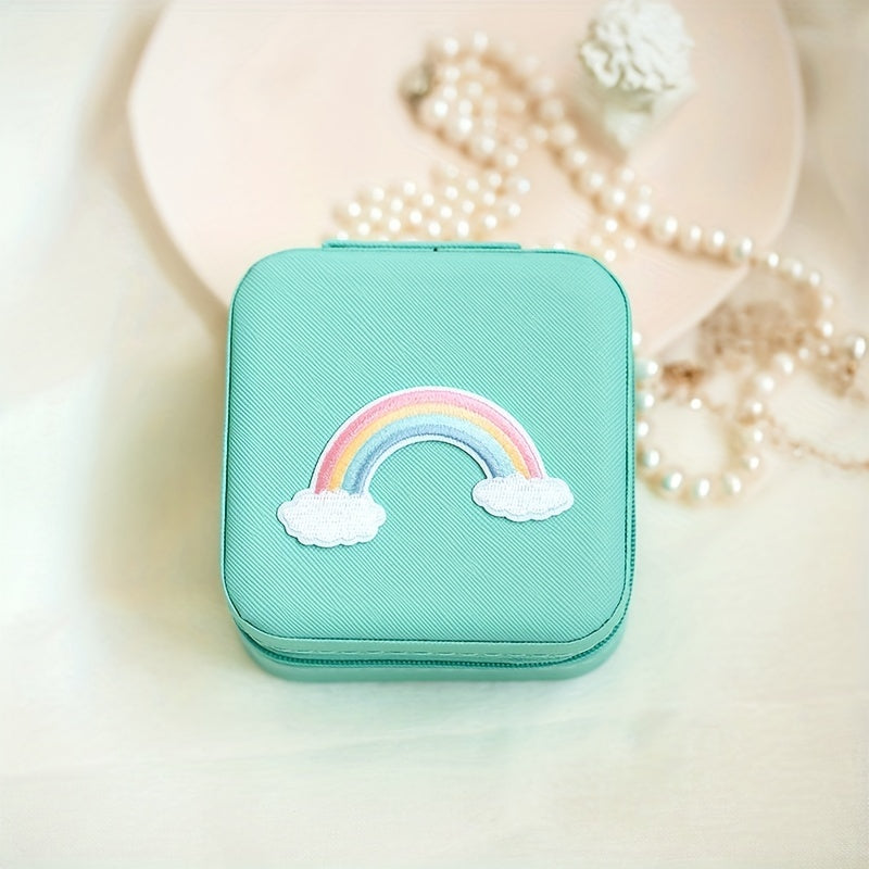 Keep your jewelry organized and secure with this mini portable zipper storage box featuring a cute unicorn and rainbow print. Perfect for storing rings, necklaces, and studs.