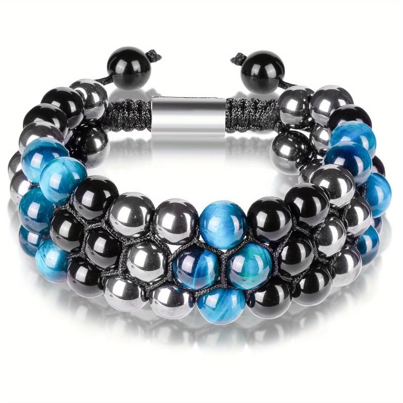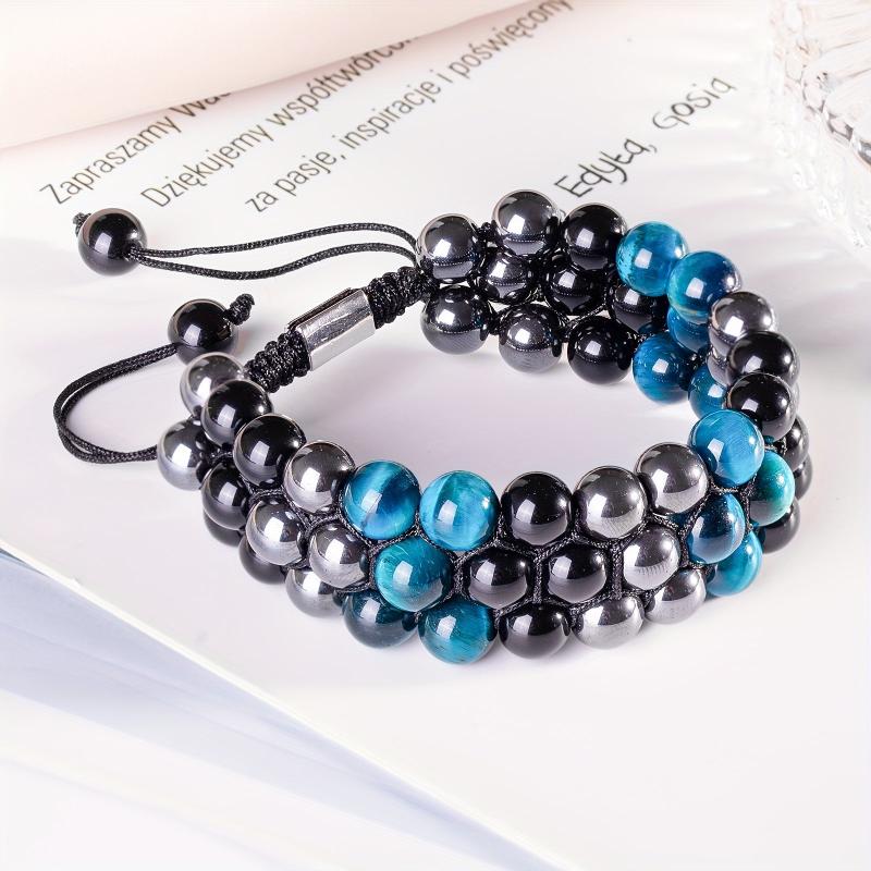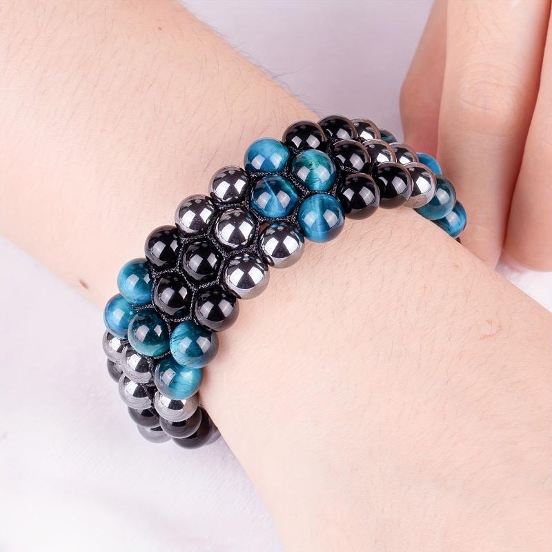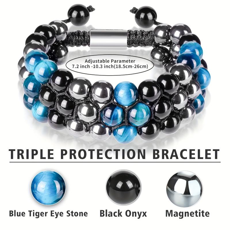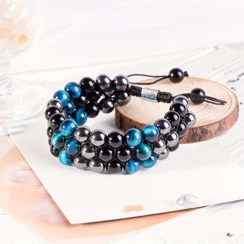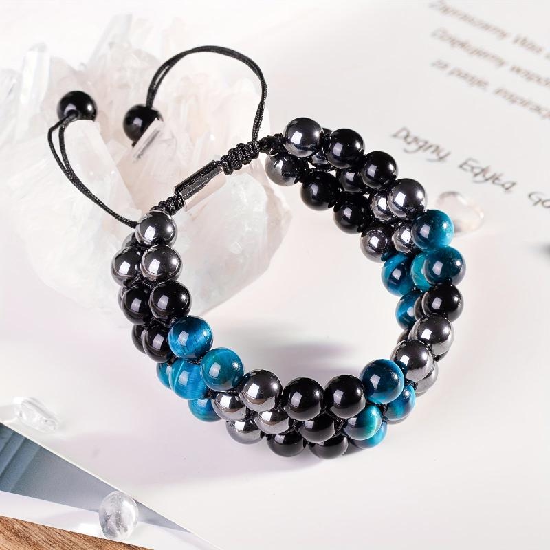 This three-row hand-braided bracelet features tiger eye, magnetite, and onyx stones. It is adjustable and suitable for both men and women. Perfect as a versatile gift.