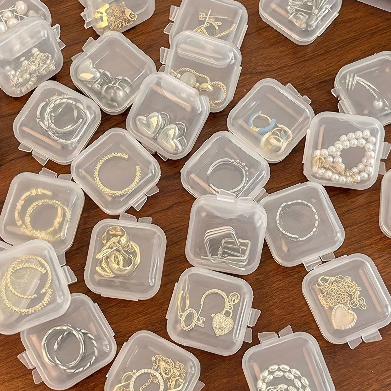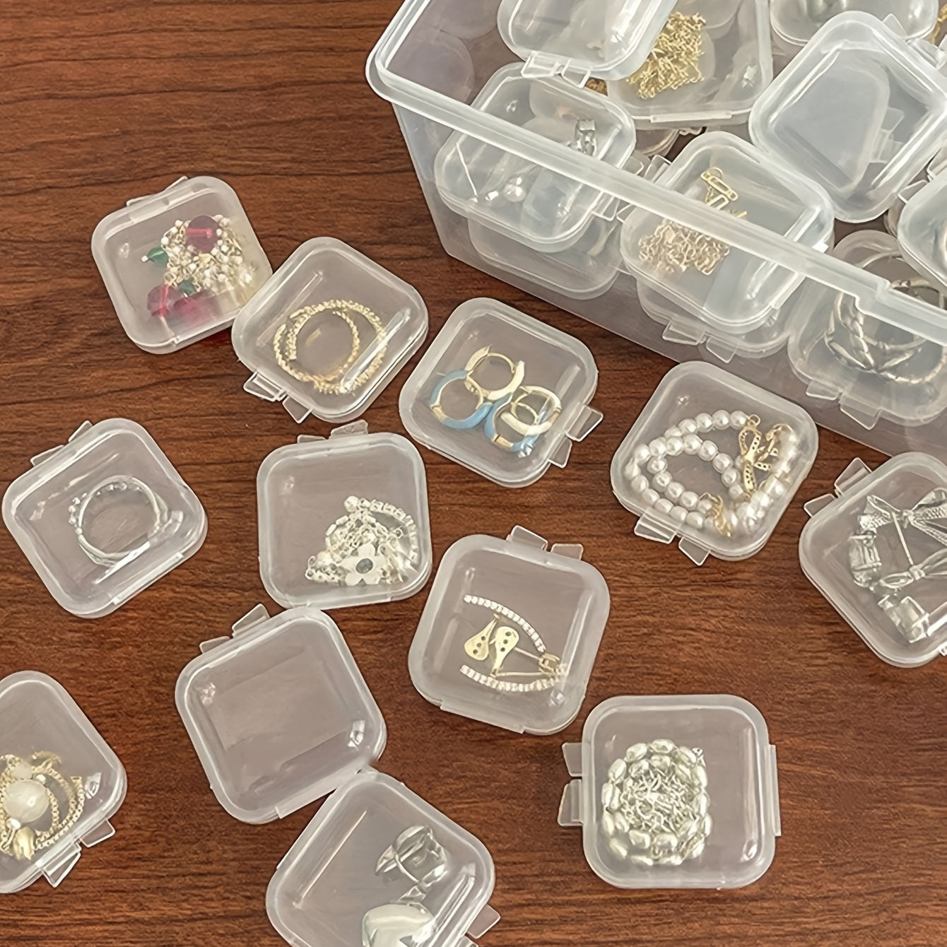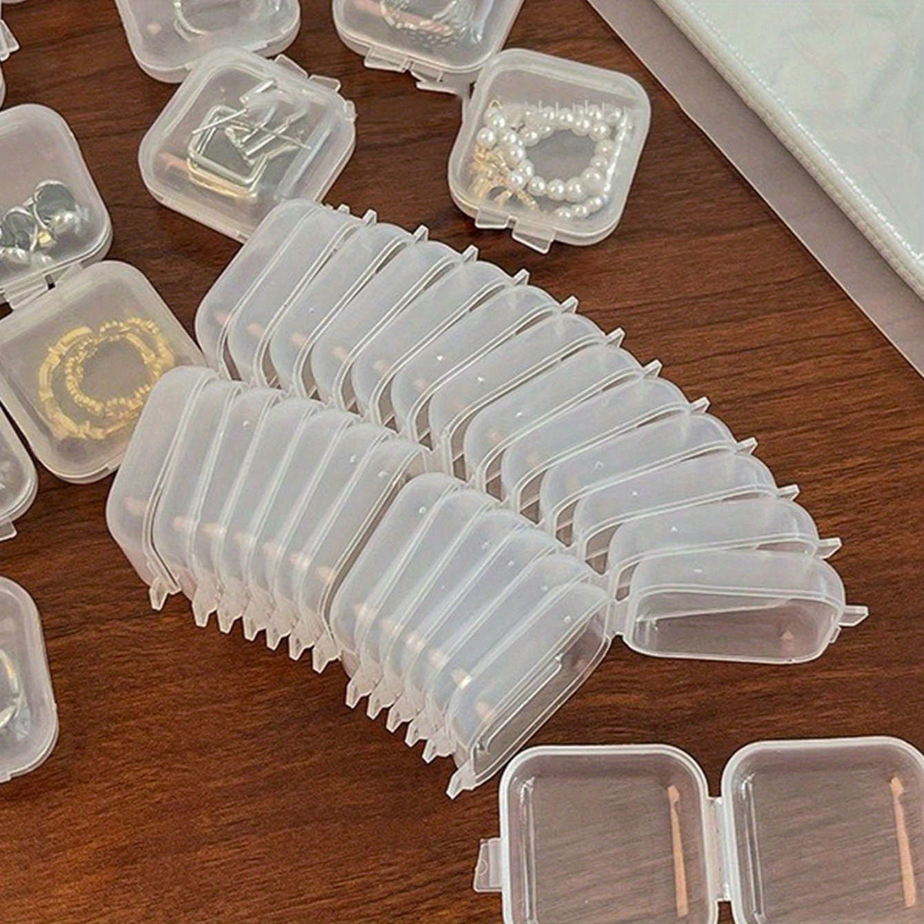 Keep your small jewelry accessories organized and dust-free with these transparent plastic storage boxes. Ideal for storing earrings, rings, necklaces, bracelets, and more.