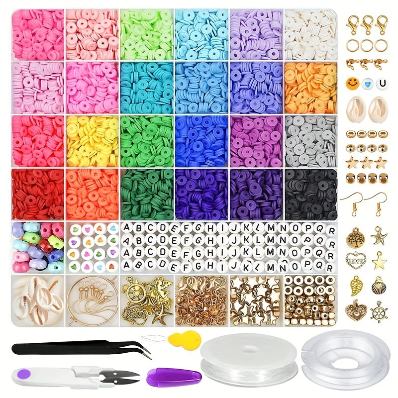 Create stunning bracelets with this set of 6000 flat round polymer clay beads in 24 vibrant colors. Includes pendant charms and elastic strings for easy assembly.