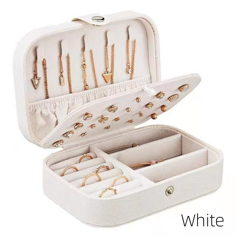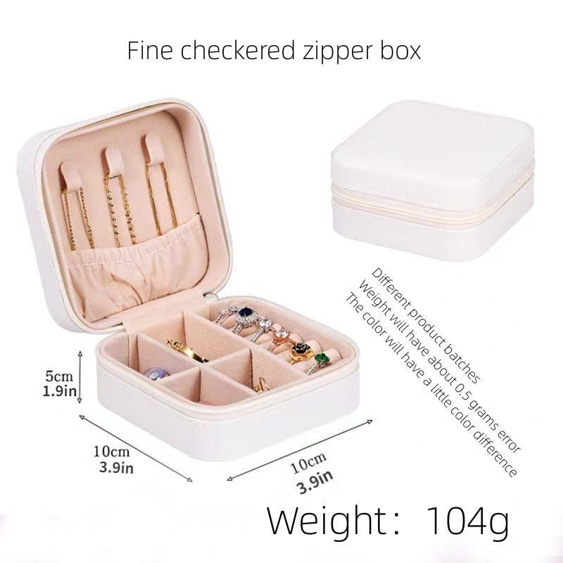 Keep your rings and earrings organized on-the-go with this portable jewelry box. It features a zipper closure and flap design for secure storage.