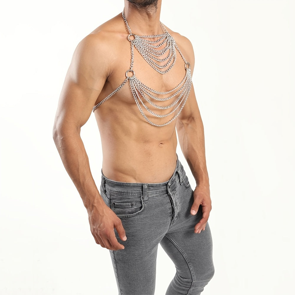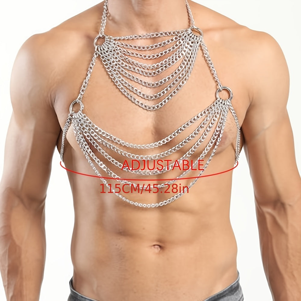 Upgrade your style with this edgy Punk Metal Chest Chain Belt Leather Body Harness. Perfect for adding a bold touch to your outfit.