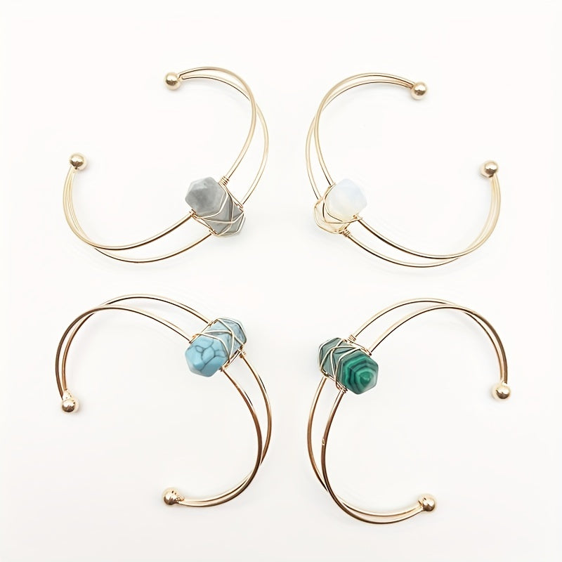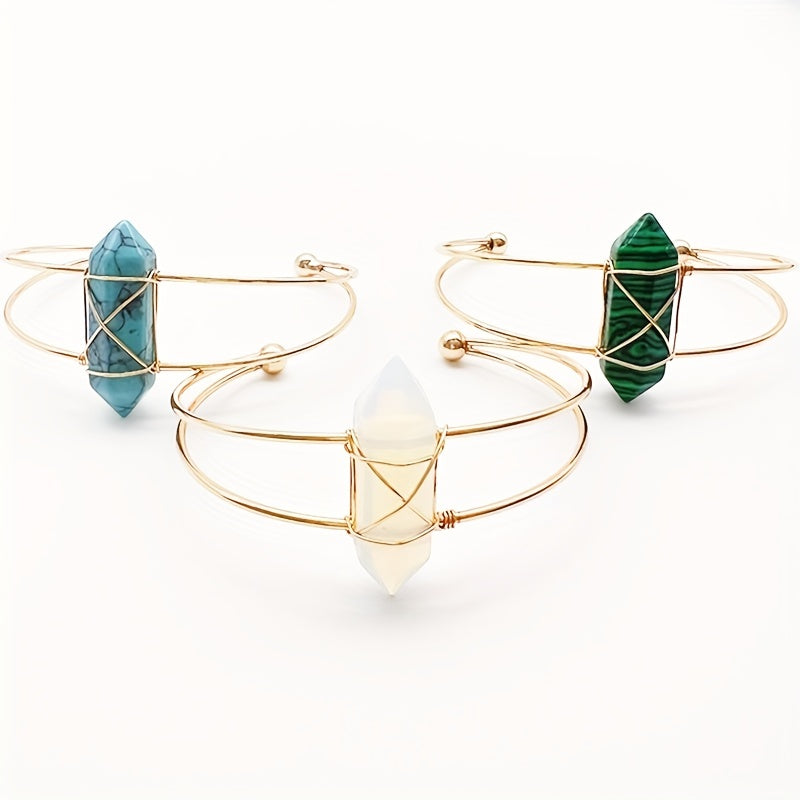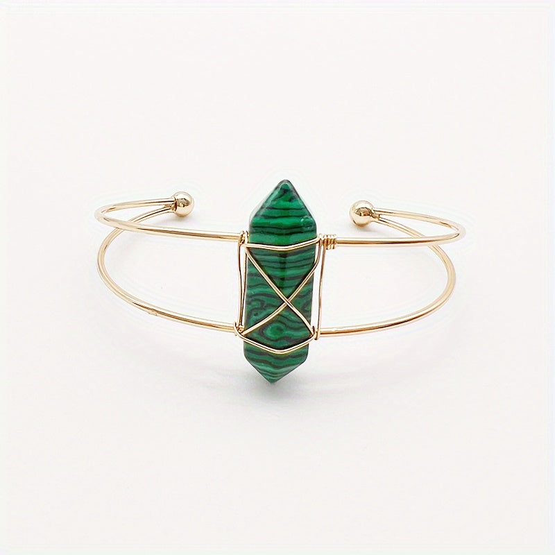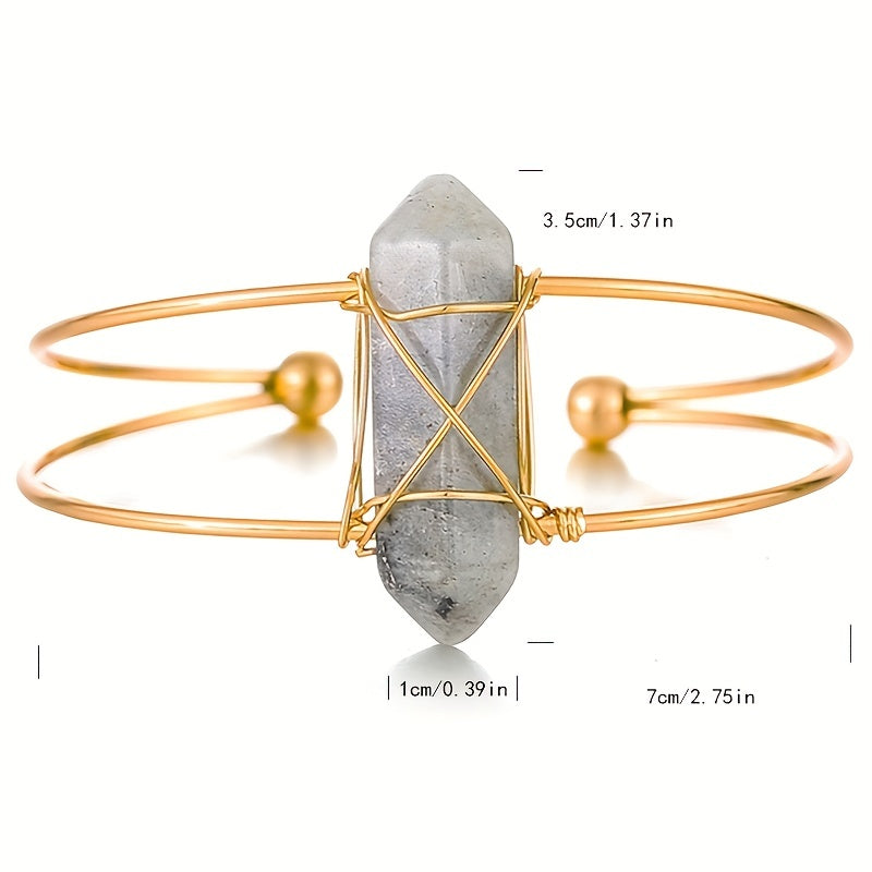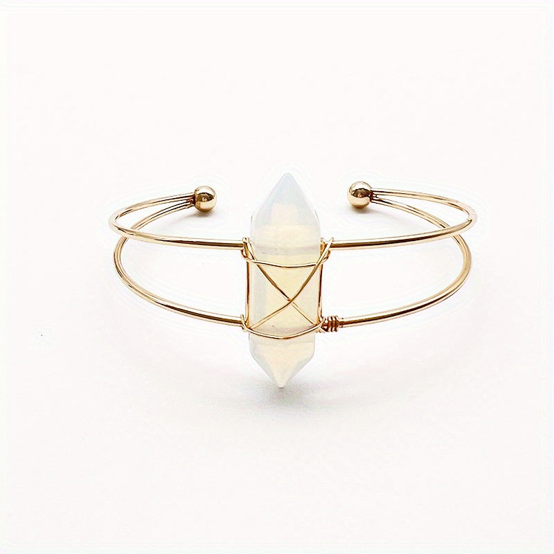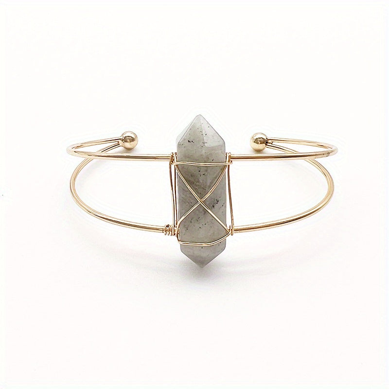Elegant hexagonal column bracelet featuring a natural crystal with copper wire binding. Easily adjustable for a perfect fit.