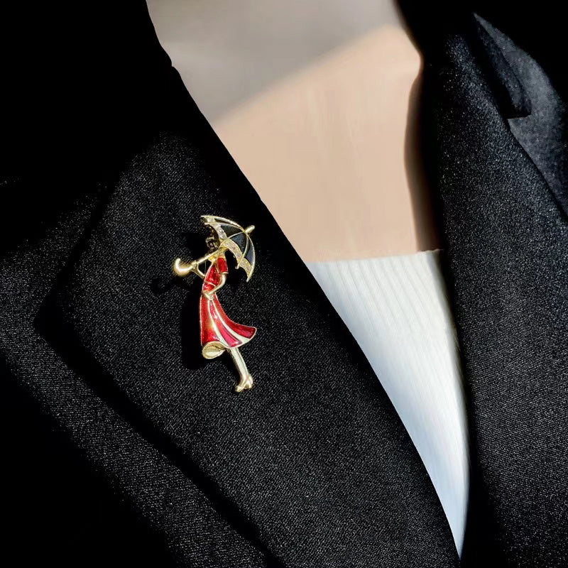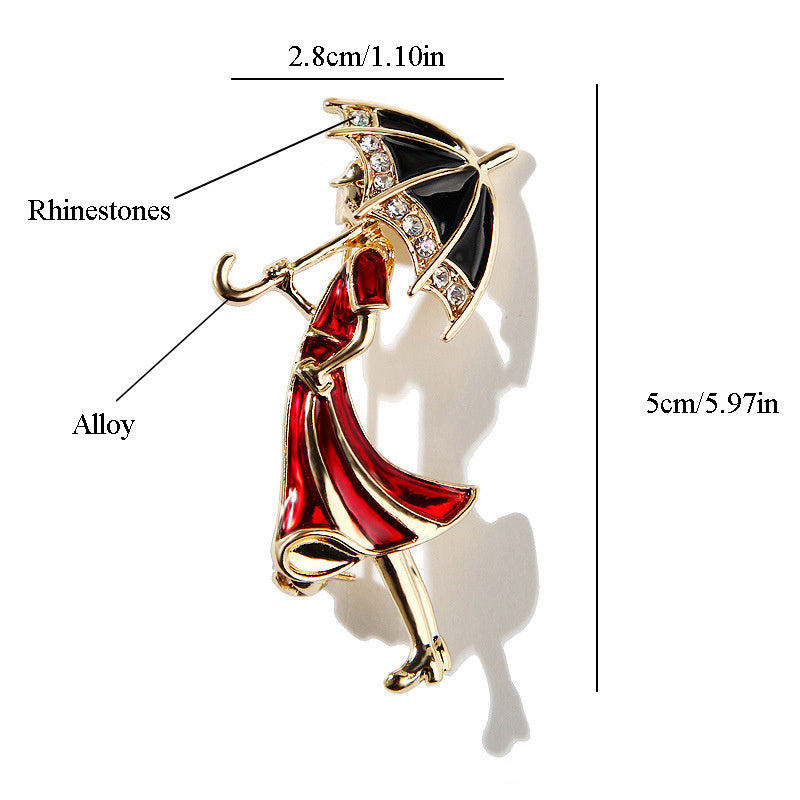 Add a touch of elegance to your outfit with this Rhinestone Umbrella Lady Brooch Lapel Pin. Perfect for adding a sparkly accent to any attire.