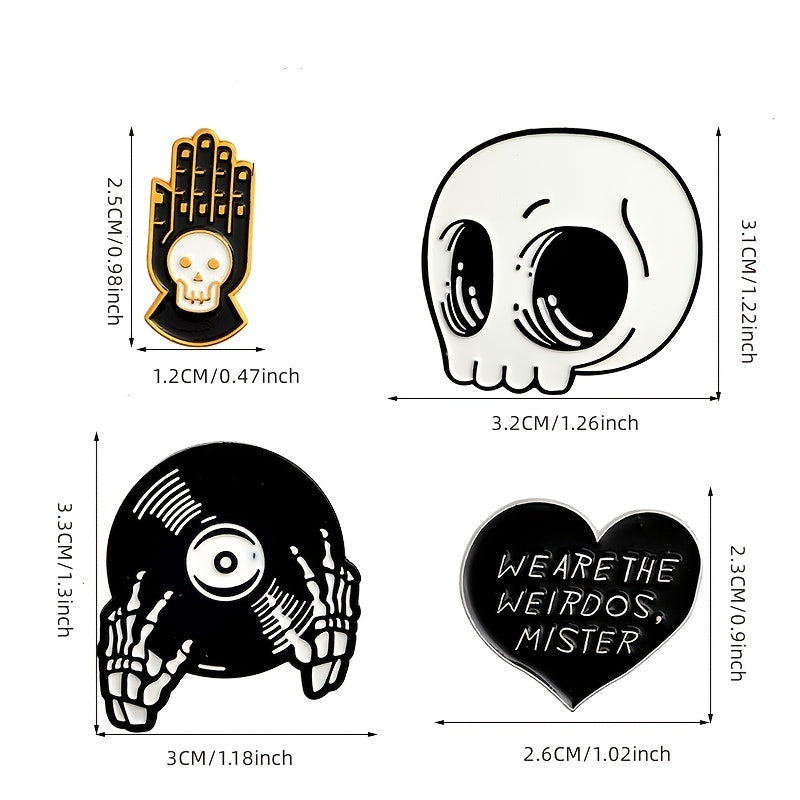 Elevate your style with this set of four brooches featuring skull, disc, finger, and imprinted love designs. Made of high-quality alloy with a drip oil finish.