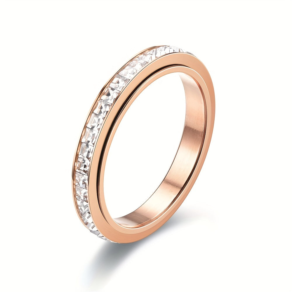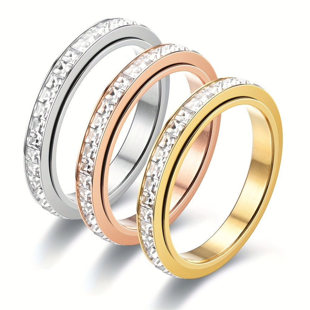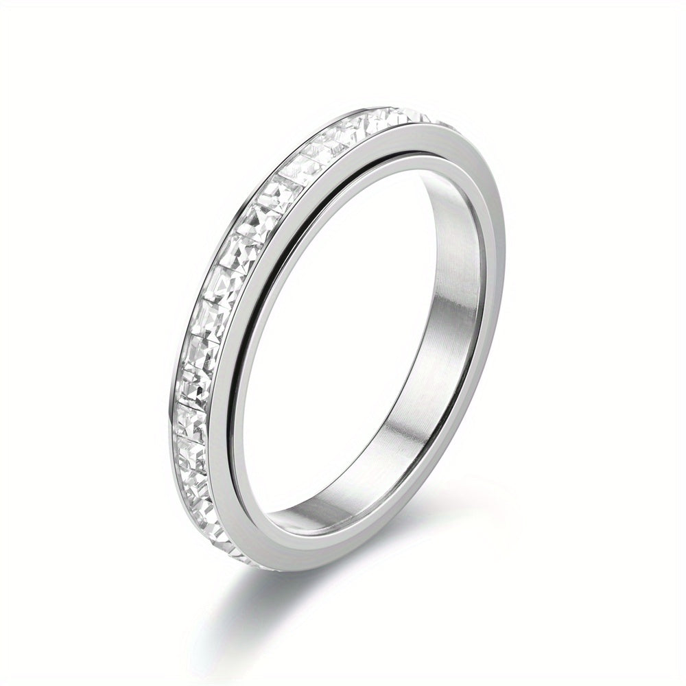 This stainless steel ring features a unique turn decompression design with sparkling square drill accents. Ideal for men and women alike.