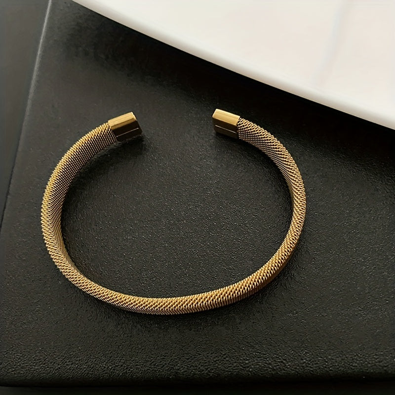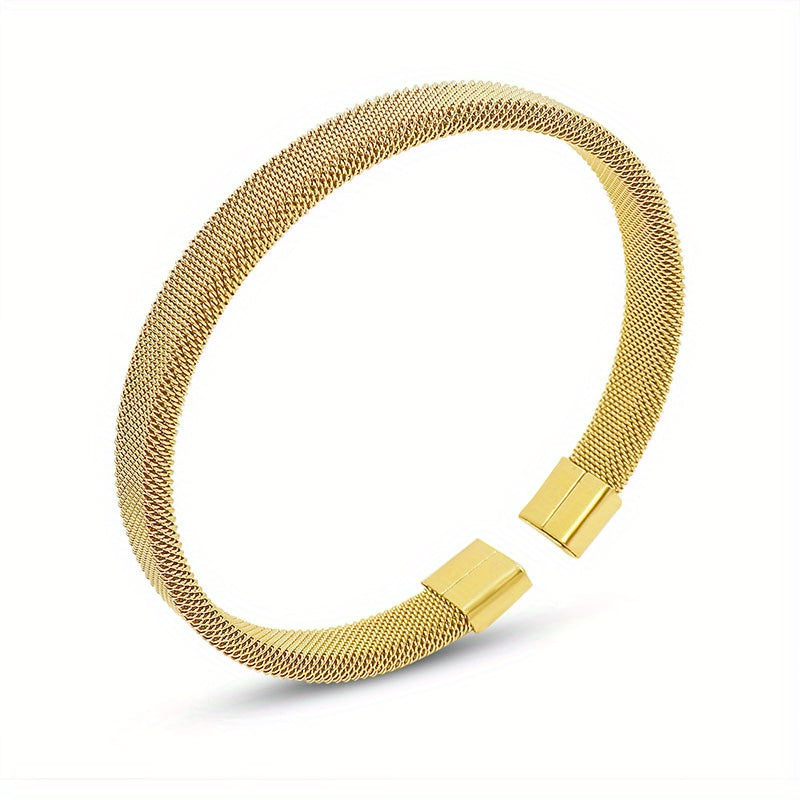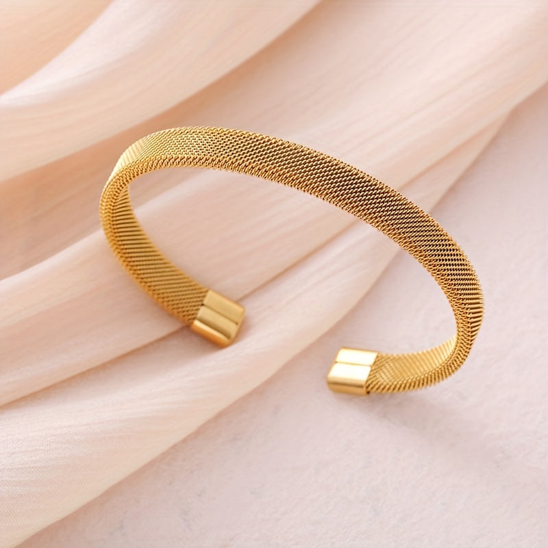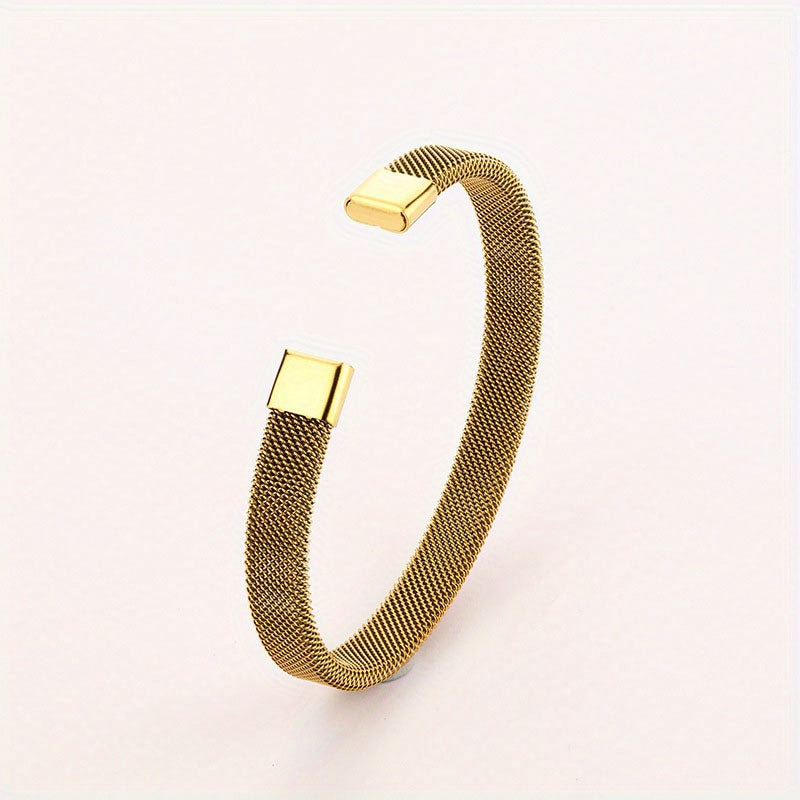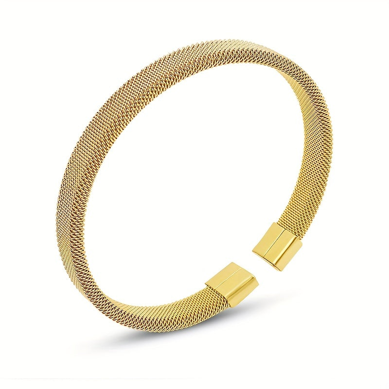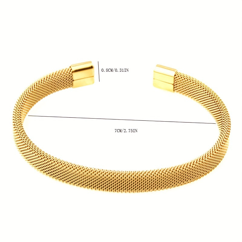 This minimalist C-shaped bangle features a stylish design in stainless steel with a golden finish. The mesh elastic construction adds a unique touch to your outfit.