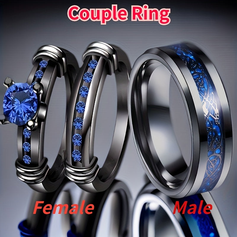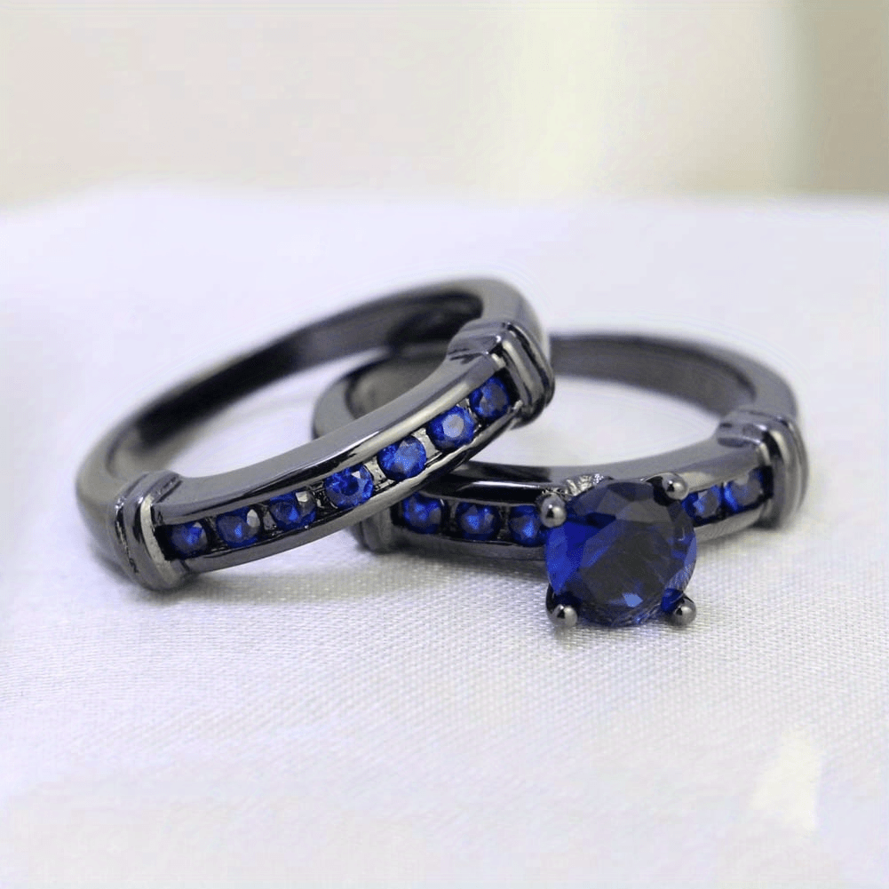 This ring set features a 316L stainless steel men's ring and a 10KT golden filled women's wedding ring with a 5MM round sapphire. Perfect for couples.